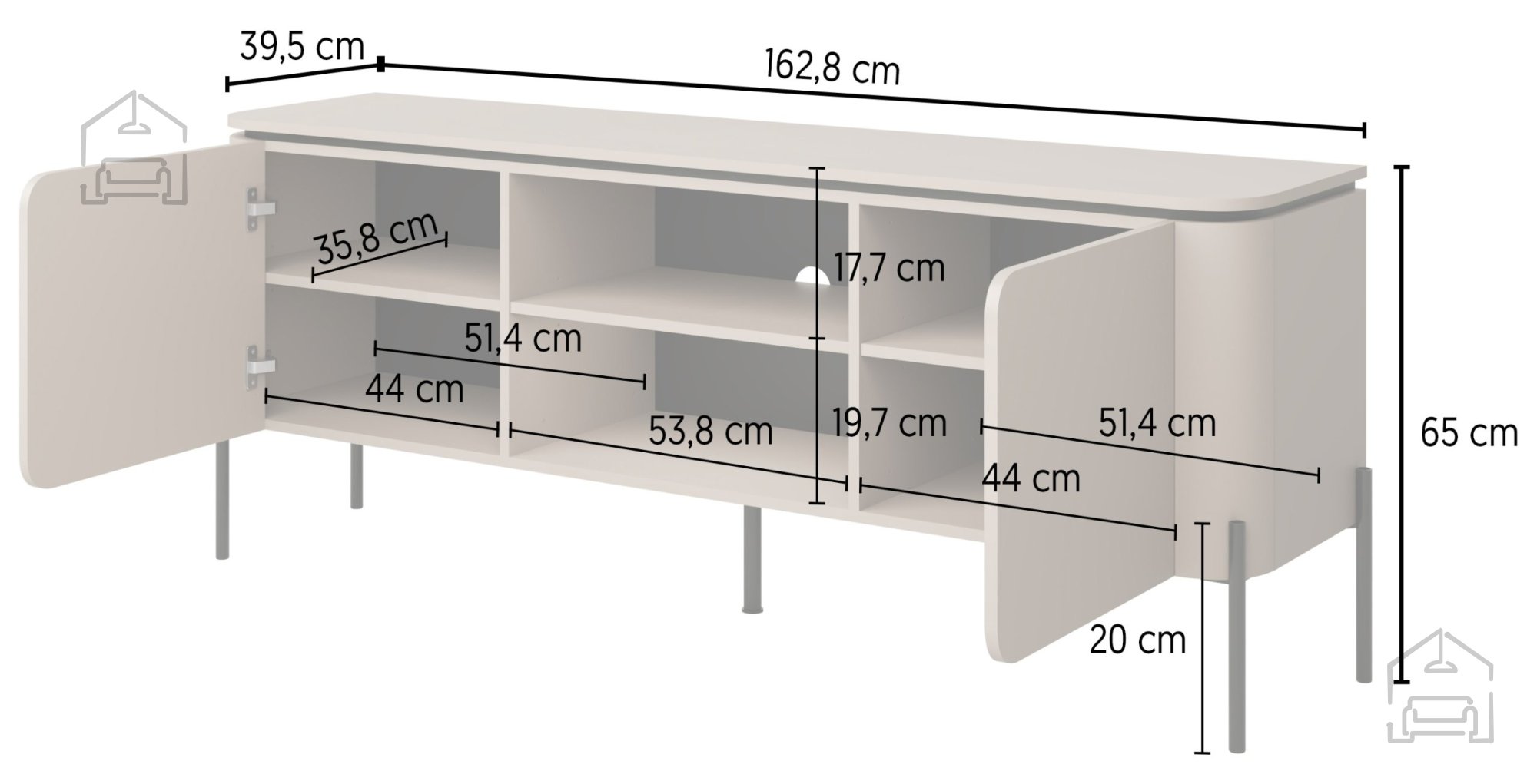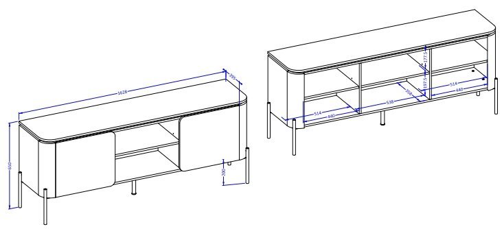 Komoda meri 163×40×65 cm, kar omogoča optimalno razmerje med prostornostjo in kompaktnostjo. Na zgornji površini se udobno namesti televizor, medtem ko spodnji del nudi dovolj prostora za multimedijske naprave, igralne konzole ali dekorativne elemente. Zaradi svoje širine se Bello lepo ujema s sodobnimi televizorji večjih diagonale, hkrati pa ne zavzame preveč prostora v prostoru.