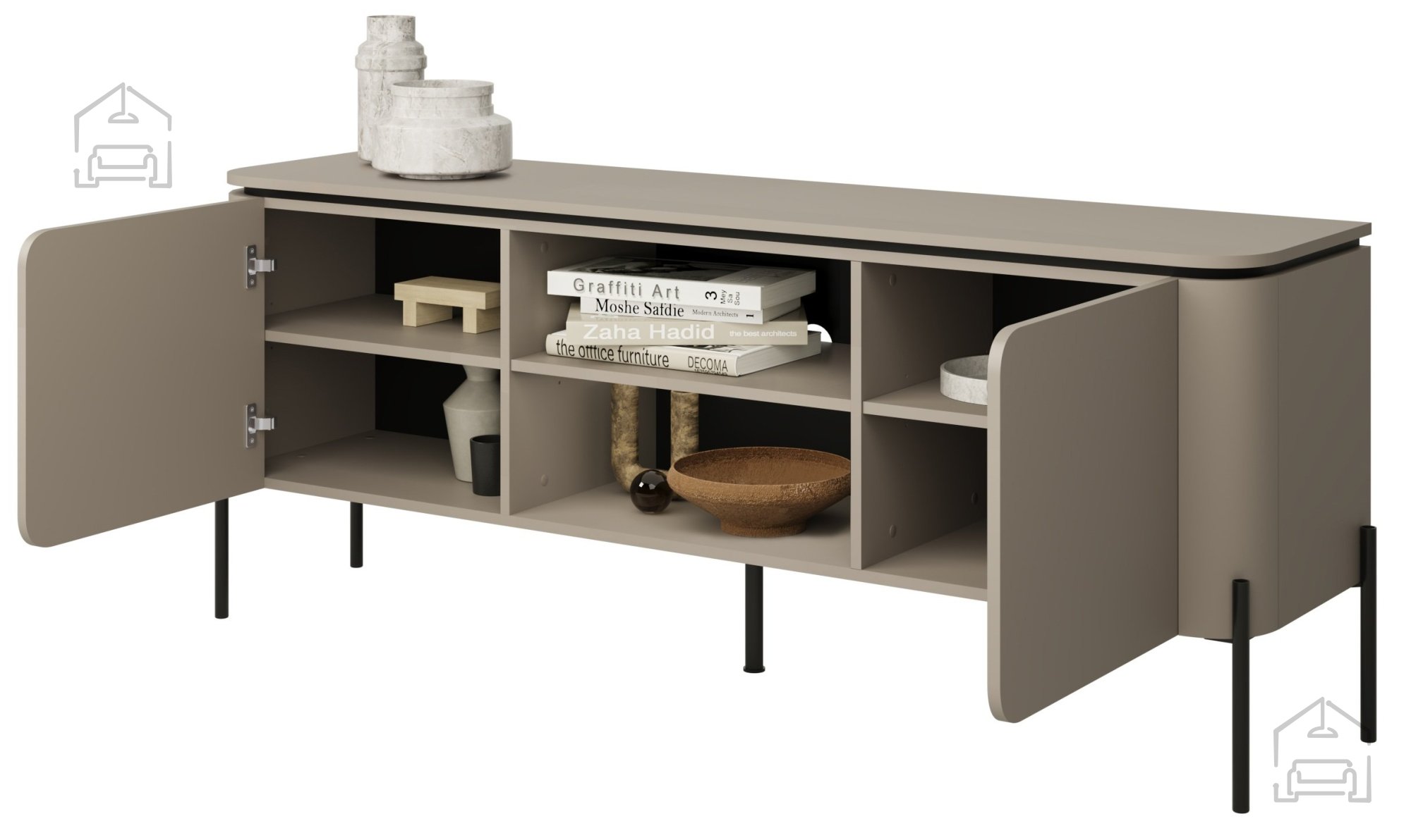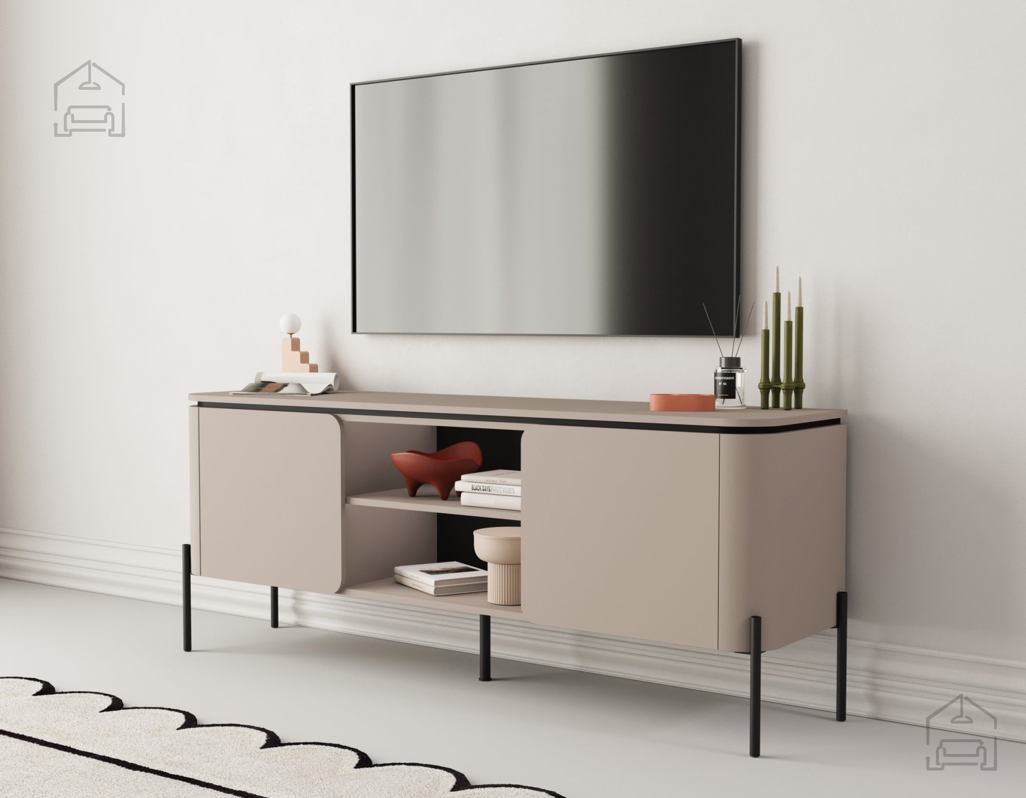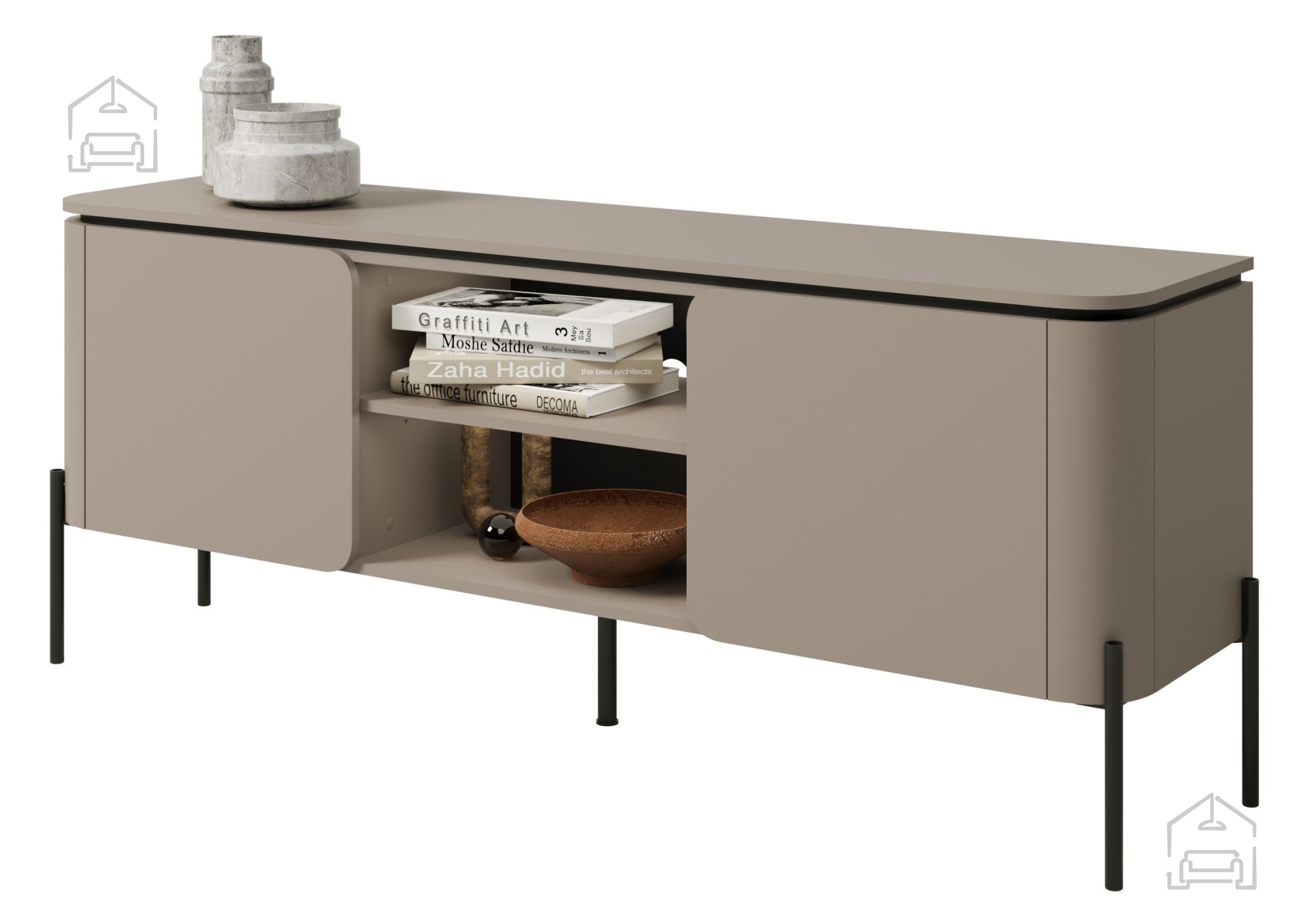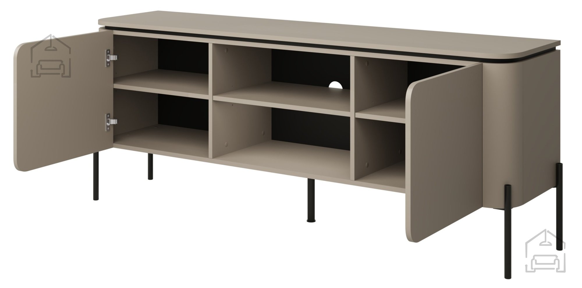 TV komoda Bello uporablja push to open sistem odpiranja, kar pomeni, da odpiranje vrat ne zahteva ročajev – zadostuje lahek pritisk na površino. Ta mehanizem prispeva k minimalističnemu videzu in olajša uporabo. Komoda ima dvoje vrat, za katerima se skriva prostoren notranji del, idealen za shranjevanje kablov, daljinskih upravljalnikov, DVD-jev ali drugih dodatkov. Zaradi čiste zunanjosti in urejenosti notranjosti ostane dnevni prostor vedno estetsko dovršen in funkcionalen.