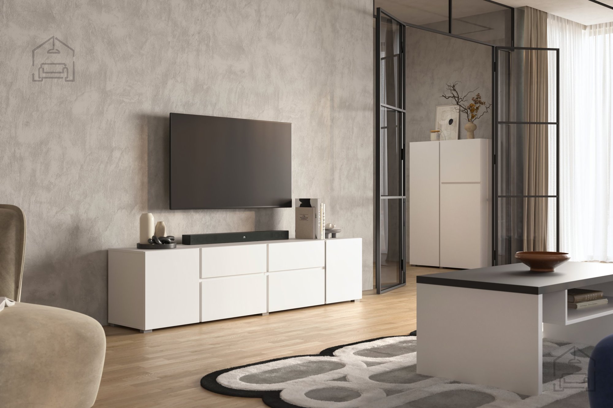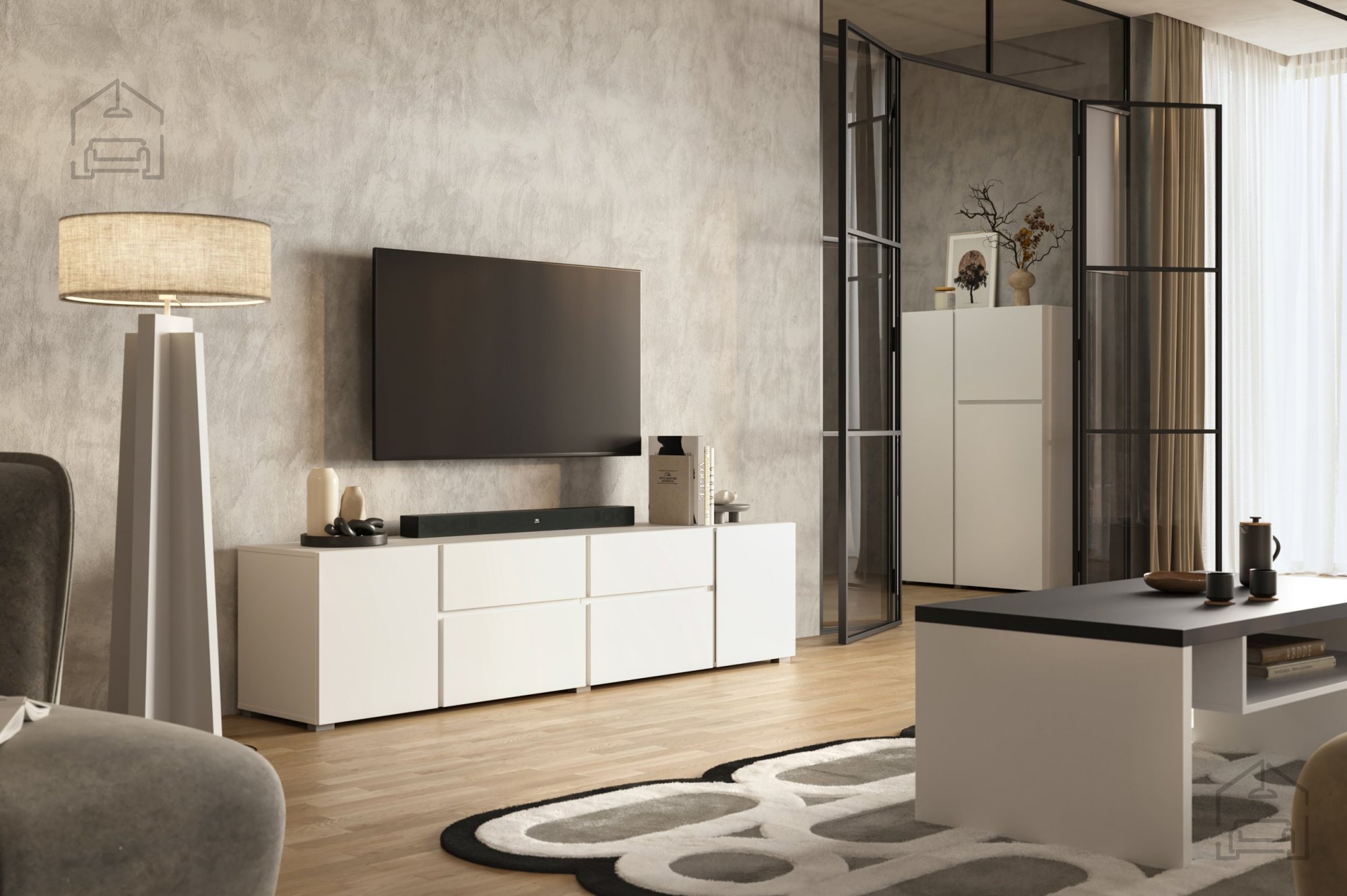 Dnevna soba Asymetric znamke Helvetia meble predstavlja sodobno interpretacijo bivalnega prostora, kjer se eleganca prepleta s funkcionalnostjo. Kolekcija je zasnovana za uporabnike, ki cenijo čiste linije, minimalistično estetiko in premišljene detajle. Njena značilnost je poudarjena z belimi površinami in asimetrično razporejenimi frontami, ki prostoru dodajo dinamiko in prefinjen značaj. Natančna izdelava iz laminirane iverne plošče zagotavlja trpežnost ter dolgo življenjsko dobo, obenem pa omogoča enostavno čiščenje in vzdrževanje.