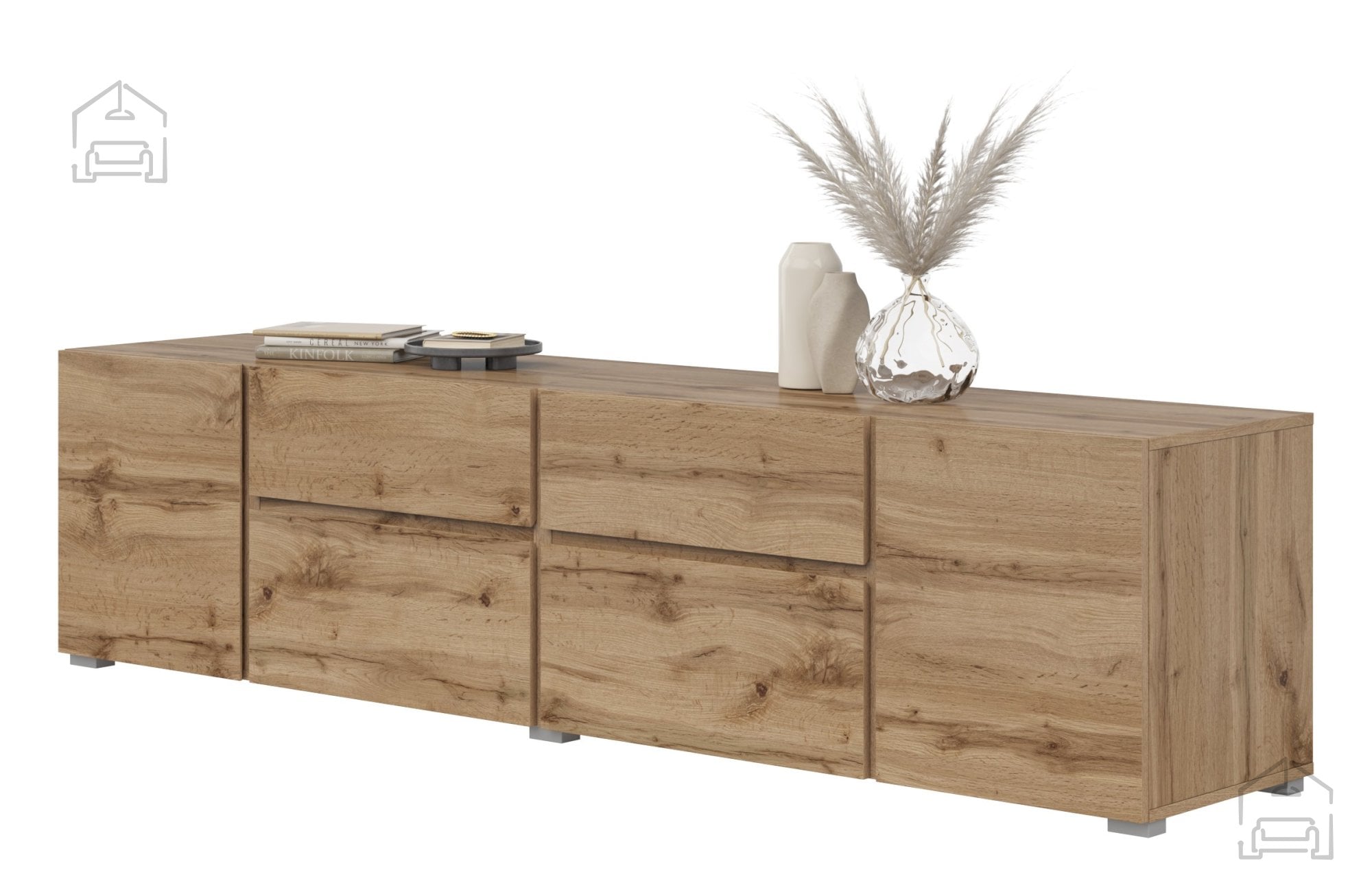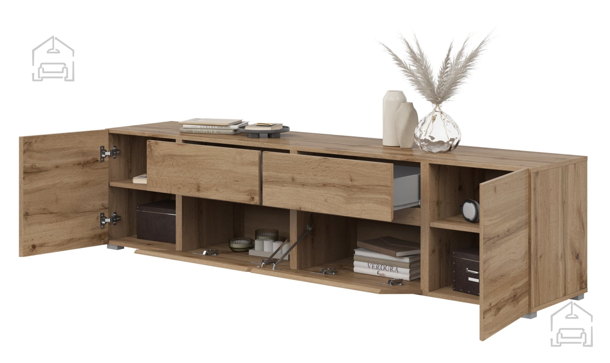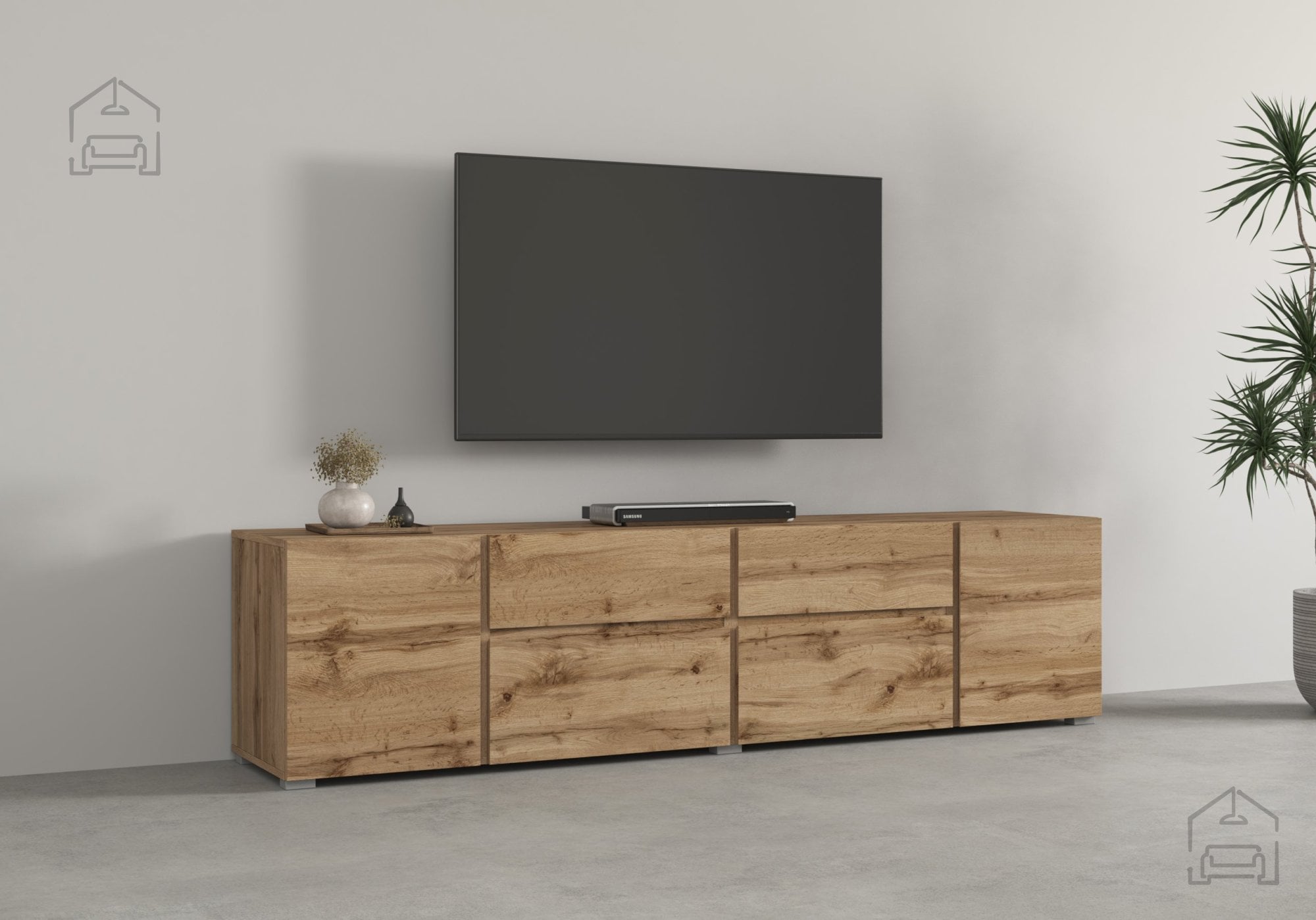 Komoda se odlično ujema z drugimi elementi v barvi hrasta ali bele, lahko pa služi tudi kot kontrastni kos v temnejših interierjih. Njena višina omogoča udobno postavitev televizorja, medtem ko odprti in zaprti deli ponujajo prostor za dekorativne dodatke ali elektronske naprave. Zaradi uravnoteženih proporcev jo je mogoče postaviti tako v večje dnevne sobe kot tudi v manjše prostore, kjer želite ohraniti preglednost in red.