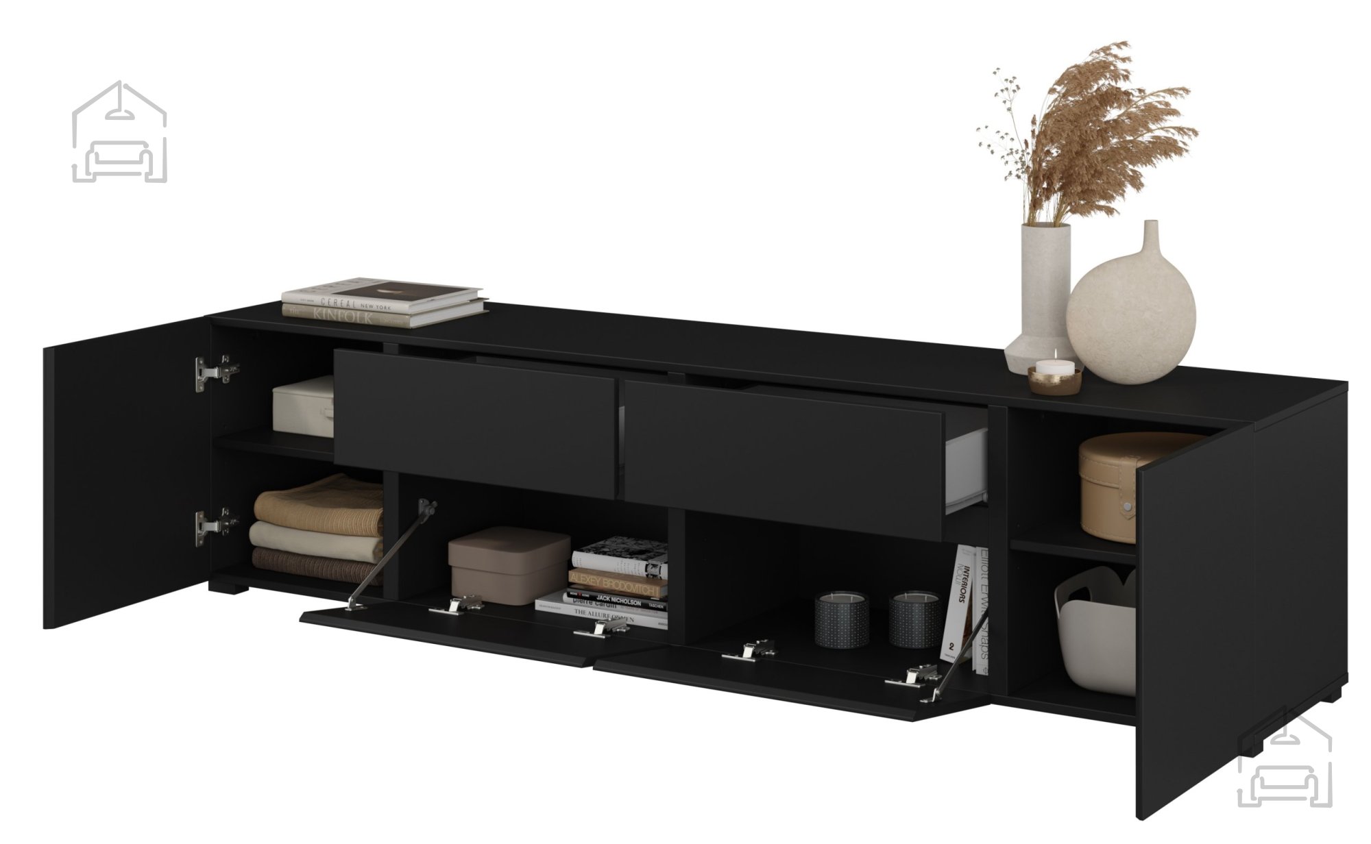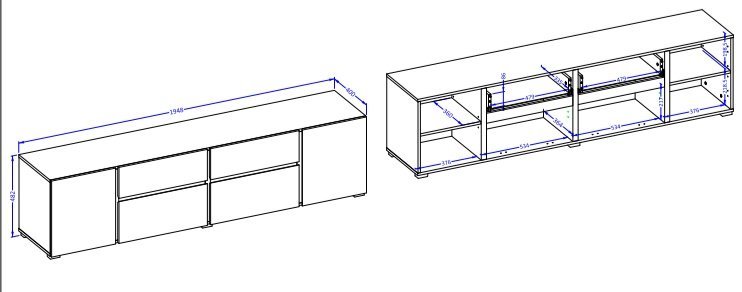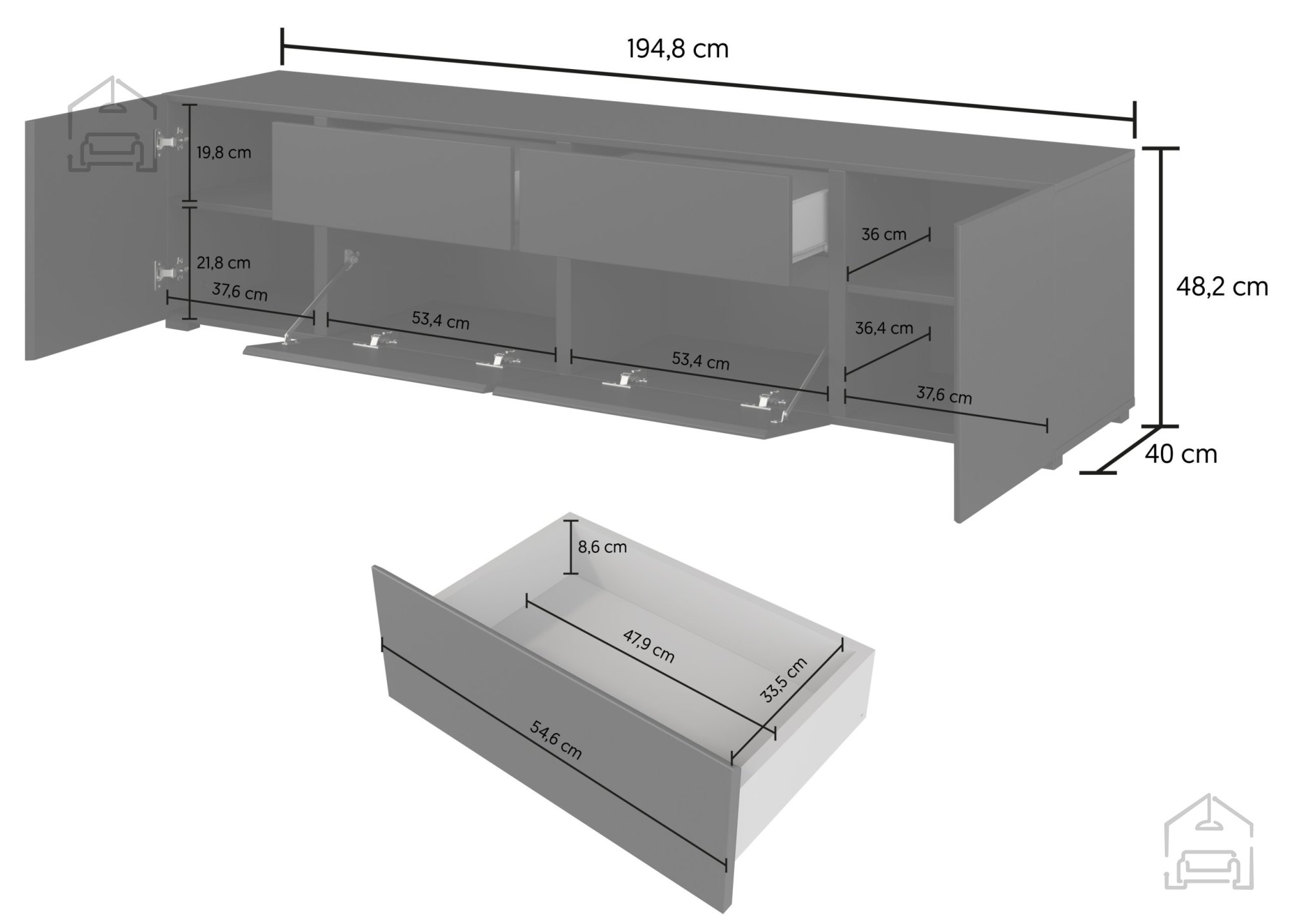 Dimenzije komode znašajo 195x40x48 cm, kar zagotavlja dovolj prostora za postavitev televizorja, dodatnih naprav in dekorativnih elementov. Notranja razporeditev vključuje dvoje vrat, dva predala in dve preklopni vratni enoti. Takšna struktura omogoča učinkovito organizacijo kablov, multimedijskih pripomočkov, knjig ali drugih predmetov, ki jih želite imeti pri roki.