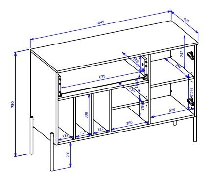 Skupne dimenzije korpusa znašajo 105 cm v širino, 40 cm v globino in 75 cm v višino. Na spodnjem delu so nameščene štiri kovinske noge višine 270 mm, ki zagotavljajo stabilnost in olajšajo čiščenje pod pohištvom. Kovinske noge niso le konstrukcijski element, temveč tudi estetski poudarek, ki se lepo ujema z naravnim tonom lesa. Celotna zasnova omogoča enostavno kombiniranje z drugimi elementi modularnega sistema Ore, kar omogoča ustvarjanje različnih konfiguracij po meri prostora.