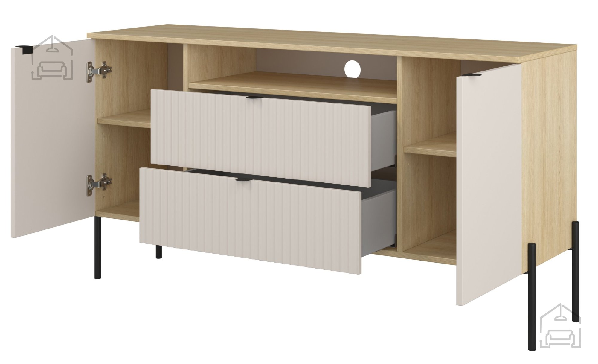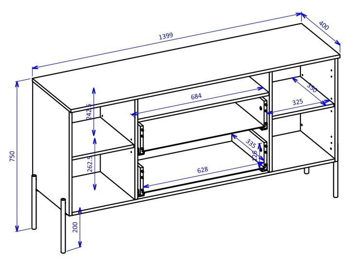 Takšne mere omogočajo optimalno razmerje med prostornostjo in kompaktnostjo. Korpus ponuja dovolj prostora za shranjevanje, ne da bi vizualno obremenil prostor. V kombinaciji z drugimi elementi je primeren za večnamensko uporabo – kot nizka komoda, TV omarica ali del večjega sestava.