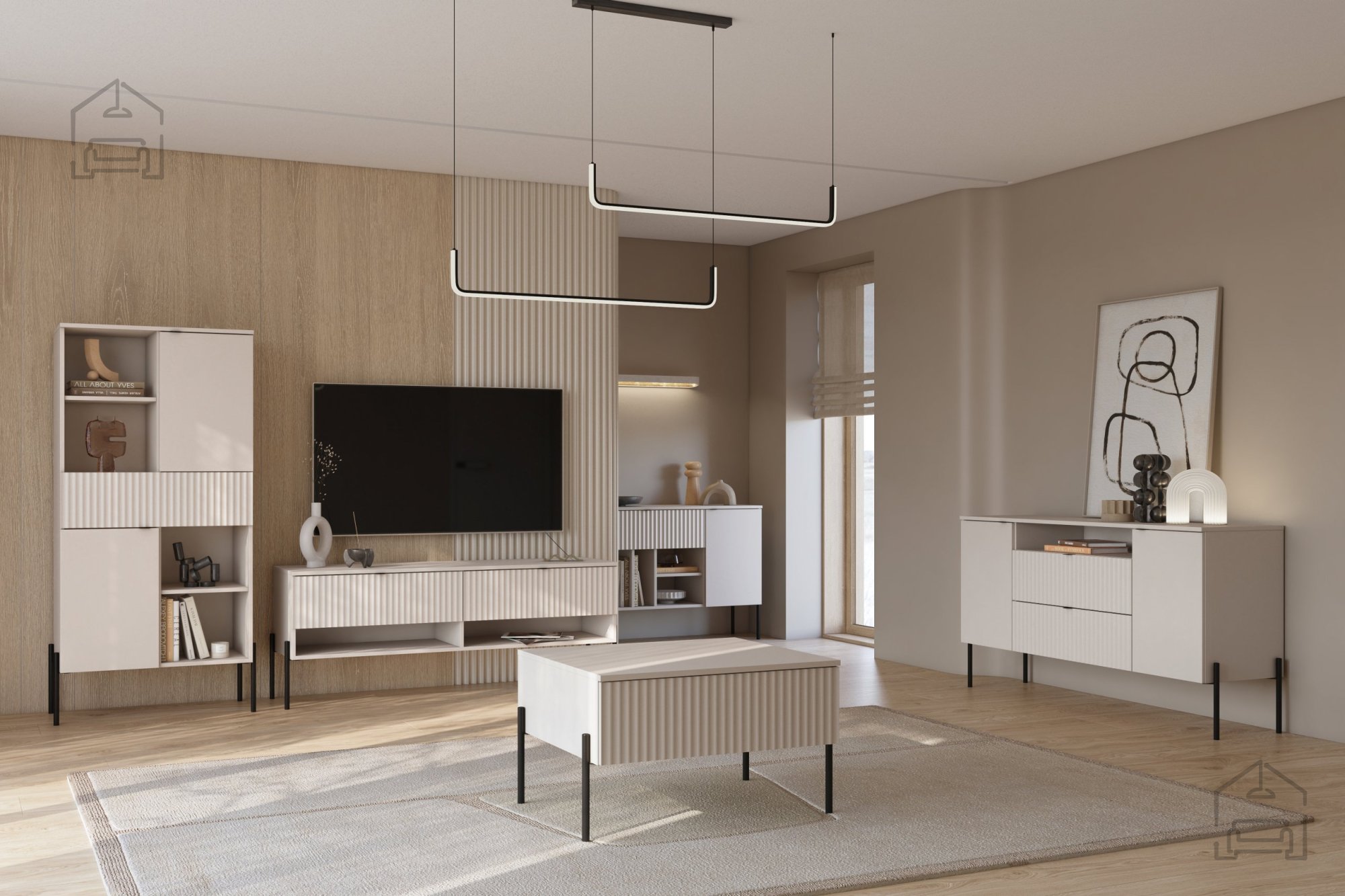 Dnevna soba Ore v barvi kašmir s prefinjeno rebrasto strukturo predstavlja sodoben pristop k opremljanju bivalnega prostora. Izdelana je iz kakovostne laminirane plošče debeline 15 mm, ki zagotavlja trdnost, hkrati pa ohranja sodoben videz. Kovinski elementi v mat črni barvi dopolnjujejo mehko, toplino bež kašmir odtenka, kar ustvarja uravnoteženo kombinacijo topline in industrijskega značaja.