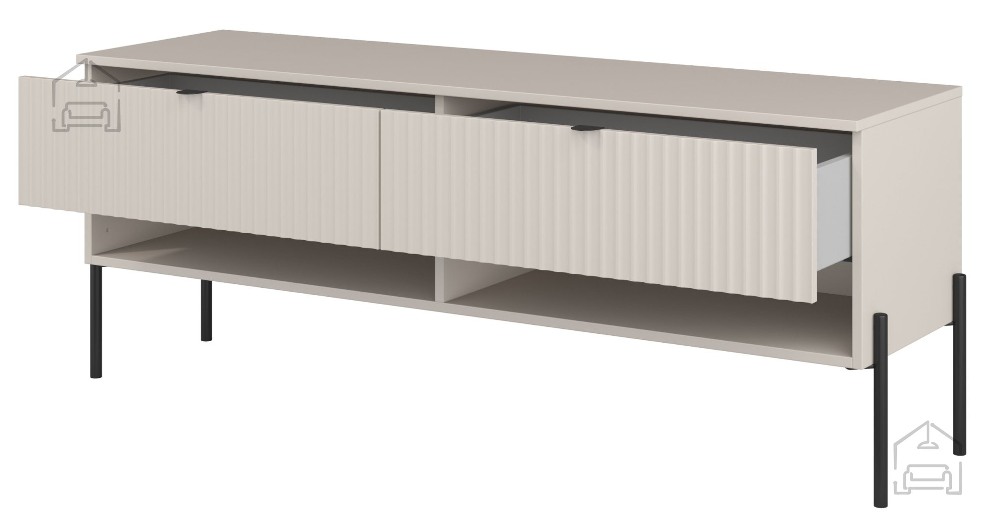 Osnovo komode dopolnjujejo kovinske noge višine 270 mm v črni mat izvedbi. Kovinska konstrukcija nudi stabilnost, hkrati pa dvignjena oblika olajša čiščenje tal pod pohištvom. Komoda ima dva prostorna predala, ki omogočata shranjevanje dodatkov, kablov ali multimedijskih naprav, tako da površina ostane vedno urejena in pregledna.