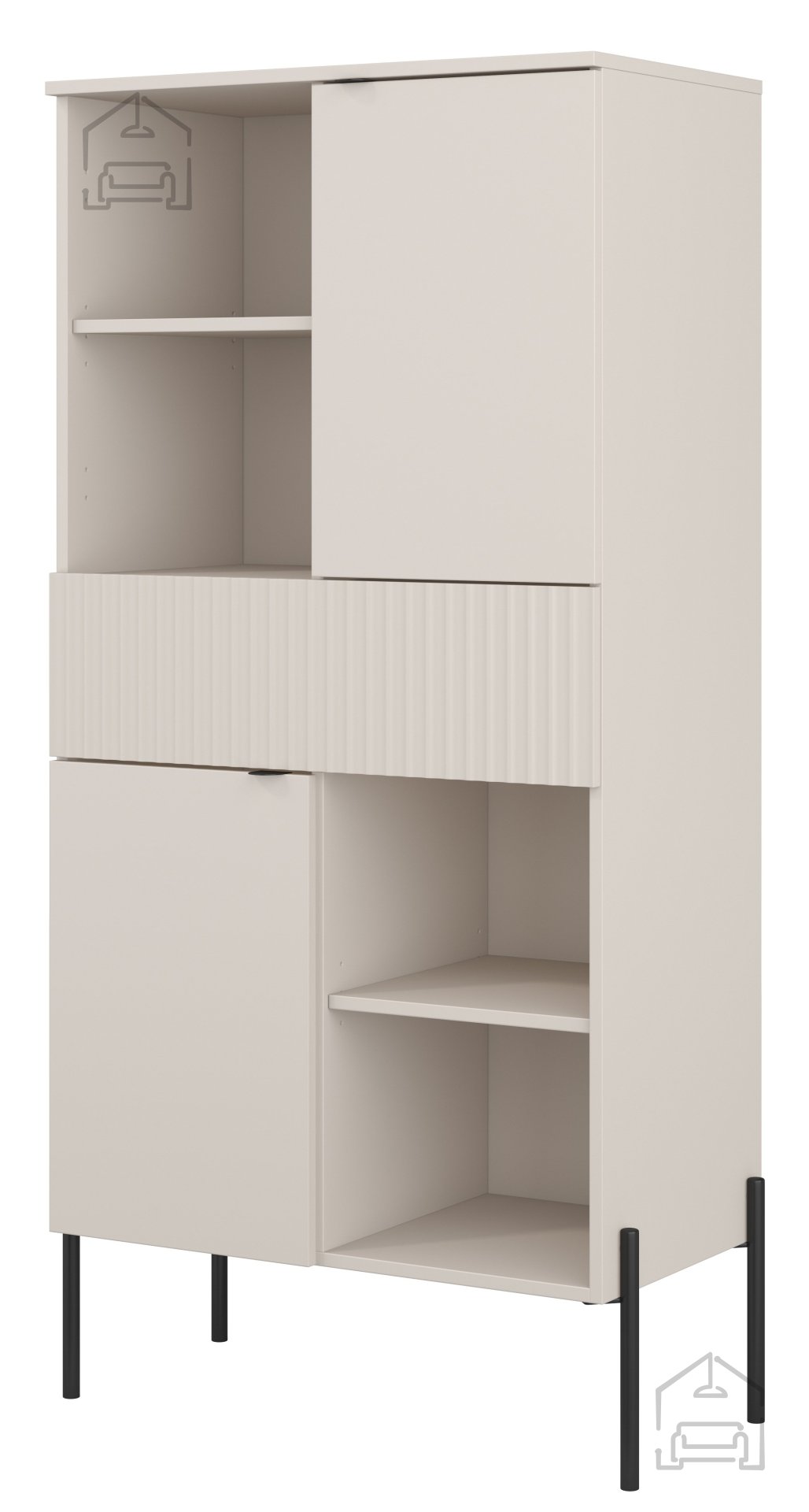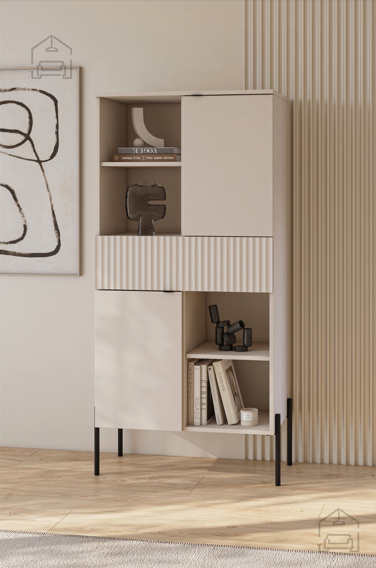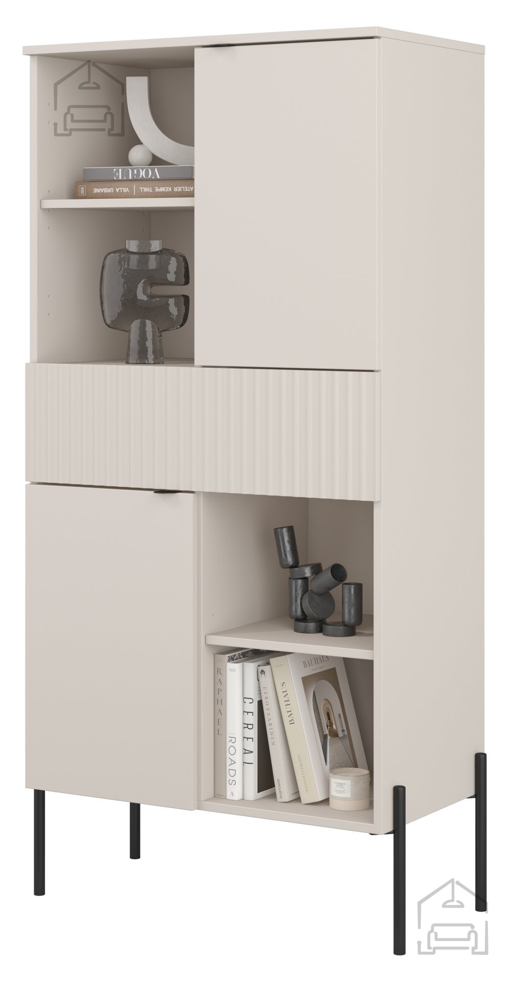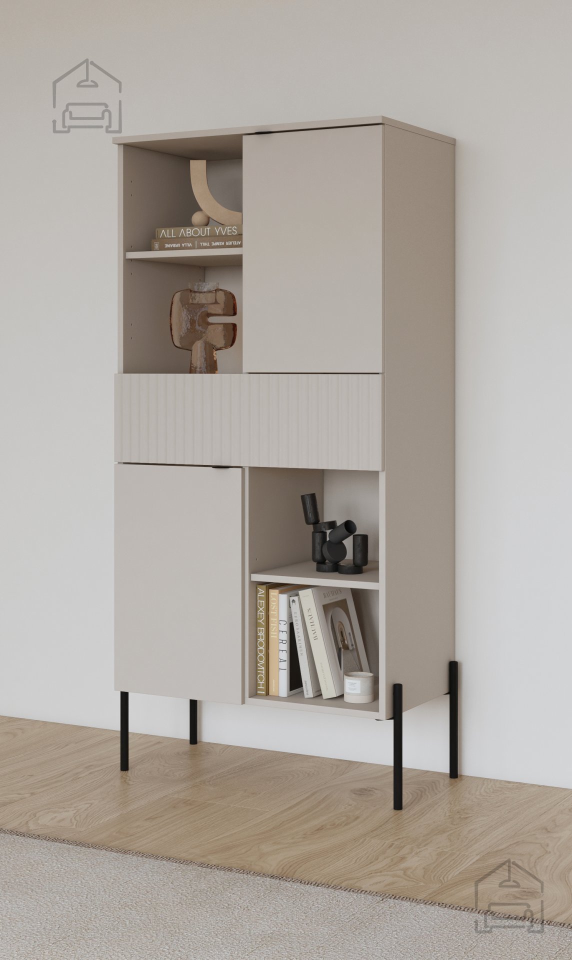 Regal Ore znamke Helvetia je sodoben kos pohištva, ki s svojo kombinacijo topline barve kašmir in kontrastnimi črnimi poudarki ustvari uravnotežen, a izrazit vizualni vtis. S čisto linijsko zasnovo, rebrasto strukturo vrat in kovinskimi nogami višine 270 mm ponuja popolno ravnotežje med estetiko in funkcionalnostjo. Ta model, označen s kodo 24KROG42, je kakovostna izbira za dnevne sobe, hodnike ali spalnice, kjer je prostor dragocen, videz pa pomemben.