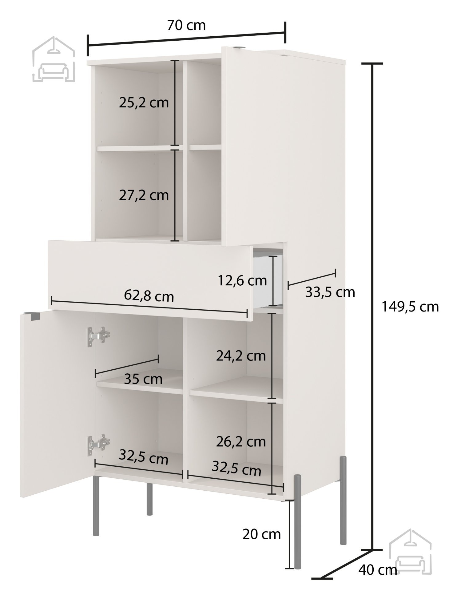Omarica z dimenzijami 70 × 41,5 × 150 cm nudi kompakten, a prostoren notranji razpored. Dvojna vrata skrivata praktičen prostor za shranjevanje, ki omogoča urejen videz prostora, medtem ko dodatni predal zagotavlja ločen prostor za manjše predmete ali dokumente. Klasična oblika s poudarjenimi vertikalnimi rebrastimi linijami ustvarja dinamiko na površini front, kar daje kosu pohištva subtilno globino in teksturo.