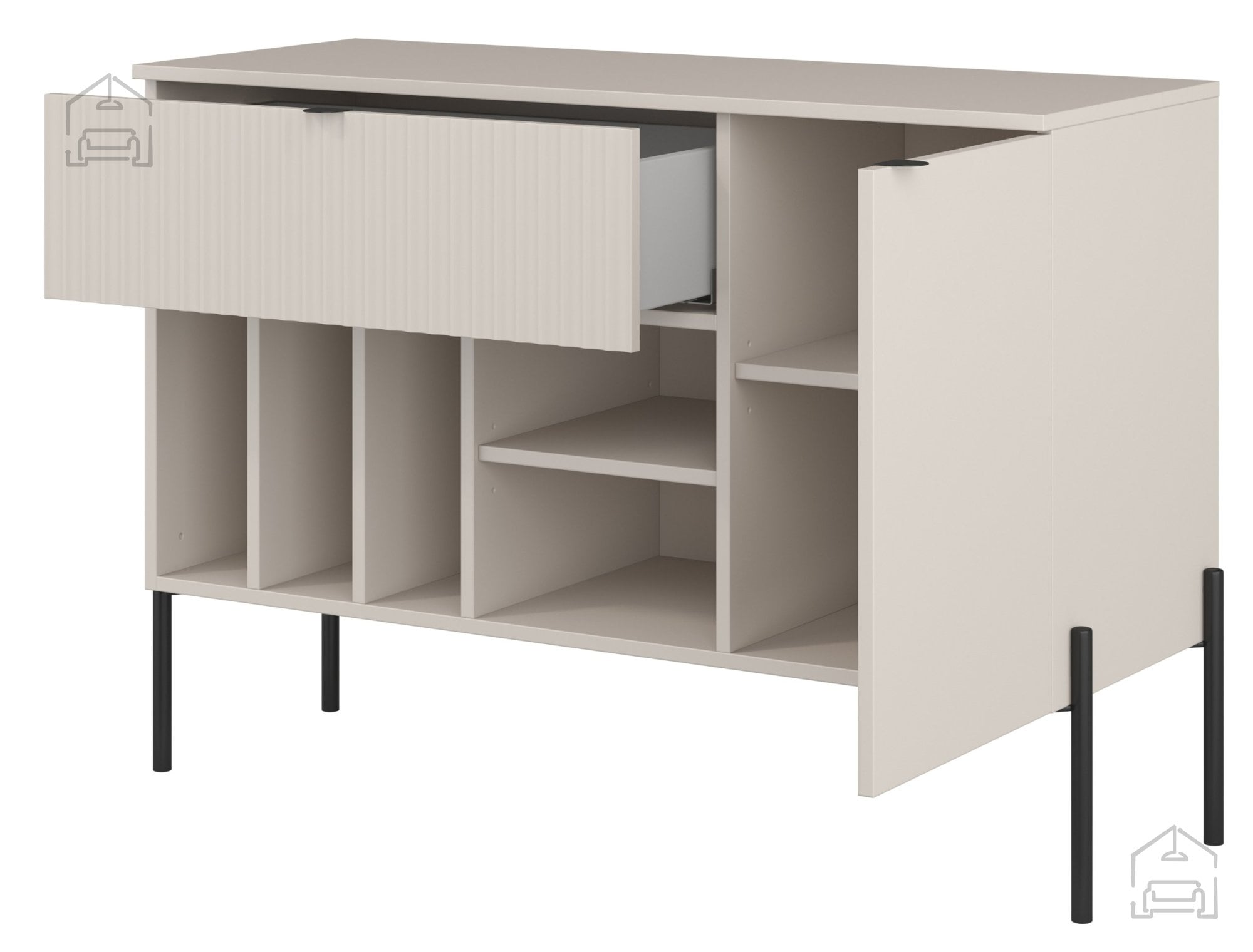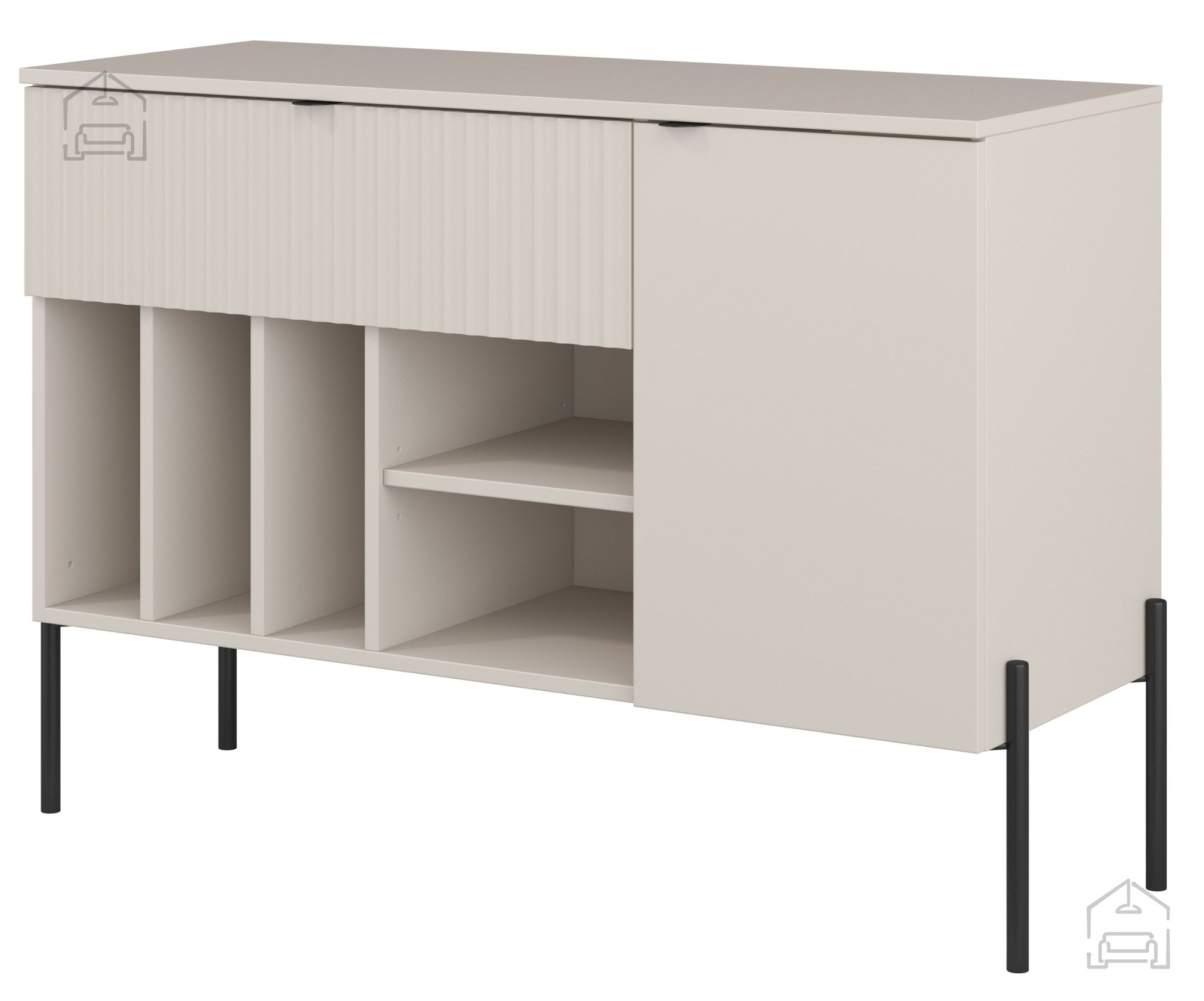 Barvna kombinacija kašmir + črna mat poudarja sodoben značaj komode. Površina z izrazito rebrasto strukturo ni le estetski, temveč tudi taktilni element – svetloba se na njej lomi na subtilen način, kar prostoru daje dinamiko. Takšna obdelava je trenutno med najbolj priljubljenimi trendi notranjega oblikovanja, saj povezuje minimalizem z naravno teksturo.
