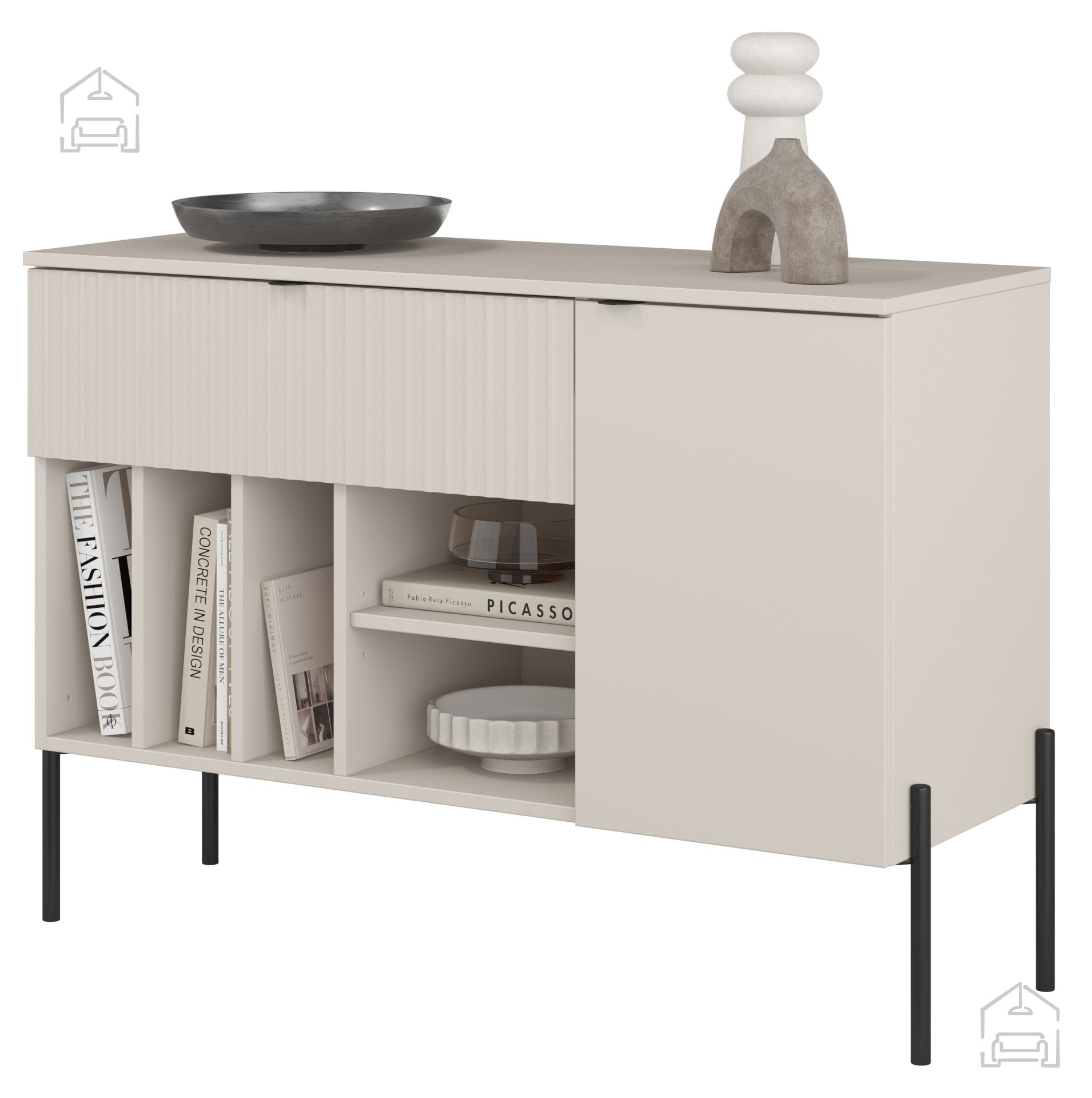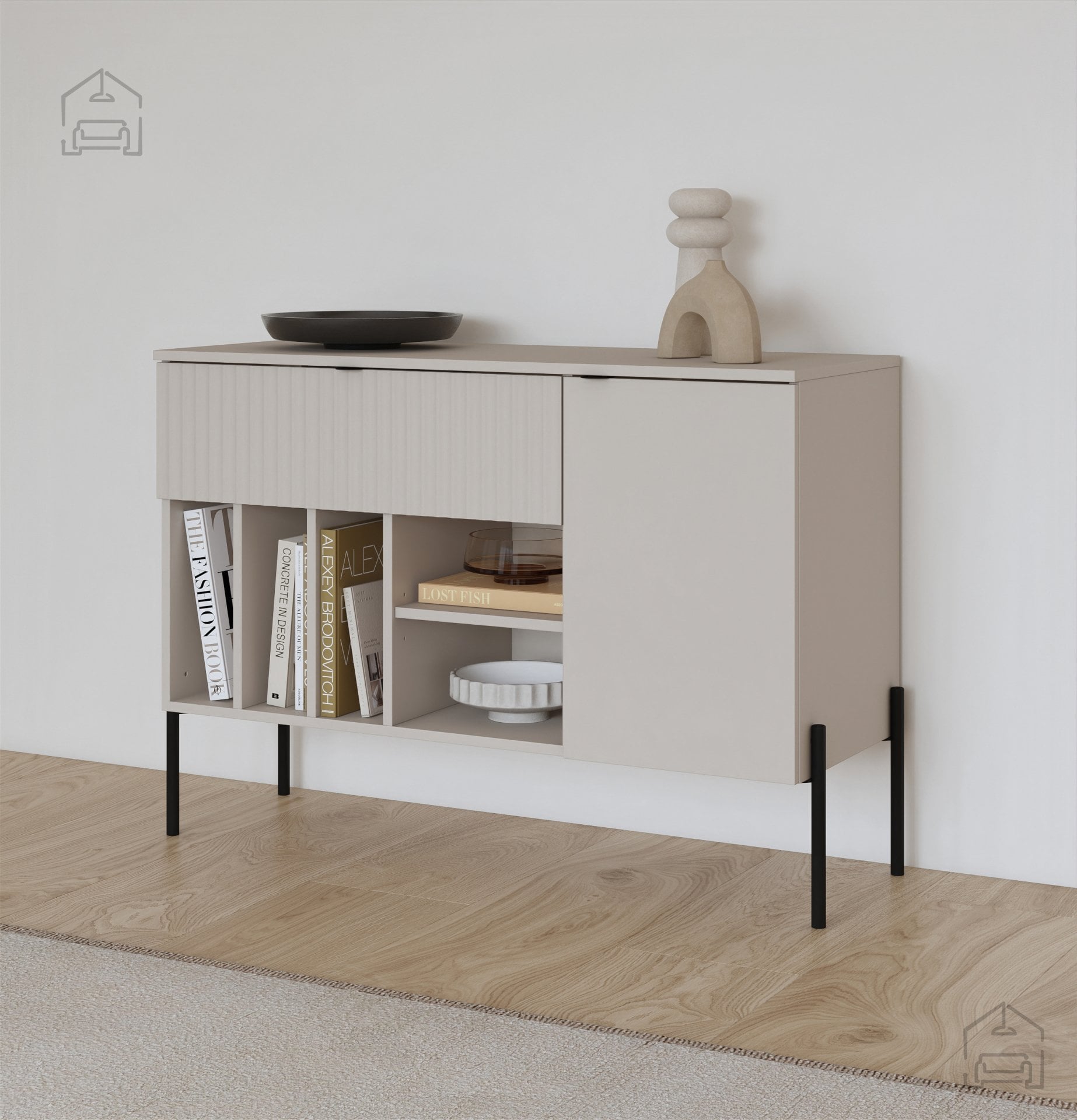 Zaradi nevtralnega kašmir odtenka se komoda Ore zlahka vključi v različne stile notranje opreme – od skandinavskega minimalizma do modernih urbanih ambientov. Črna kovina doda industrijski značaj, medtem ko rebrasta površina prinaša toplino in vizualno zanimivost. Komodo lahko postavite samostojno ali jo kombinirate z drugimi elementi iz iste serije za usklajen videz prostora.