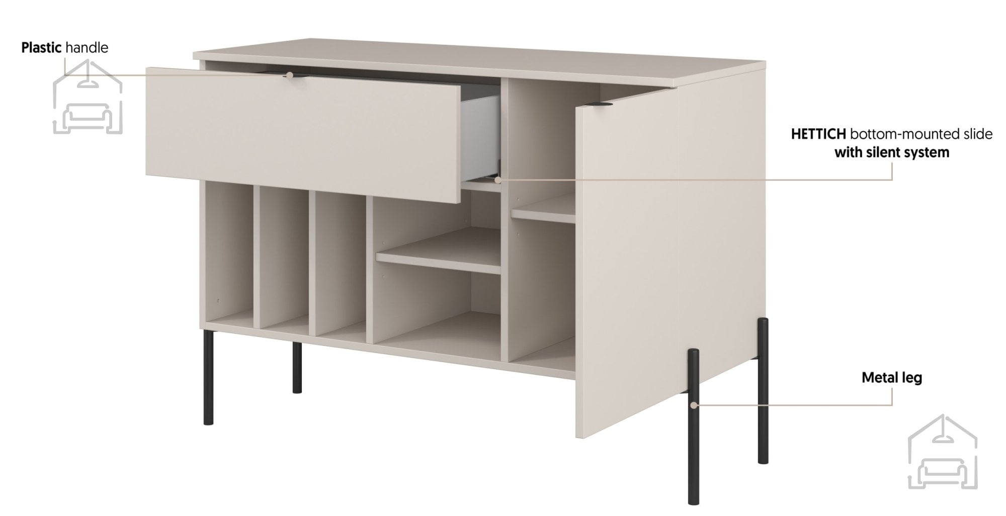 Plastični ročaji so diskretni, a funkcionalni, njihova oblika pa sledi minimalistični estetiki celotne linije. Višina komode omogoča enostaven dostop do shranjenih predmetov, hkrati pa zgornja površina nudi dovolj prostora za postavitev dekoracij, svetilke ali okvirjev s fotografijami. Zaradi kovinskih nog je spodnji del enostavno dostopen za čiščenje, kar prispeva k praktičnosti in urejenosti prostora.