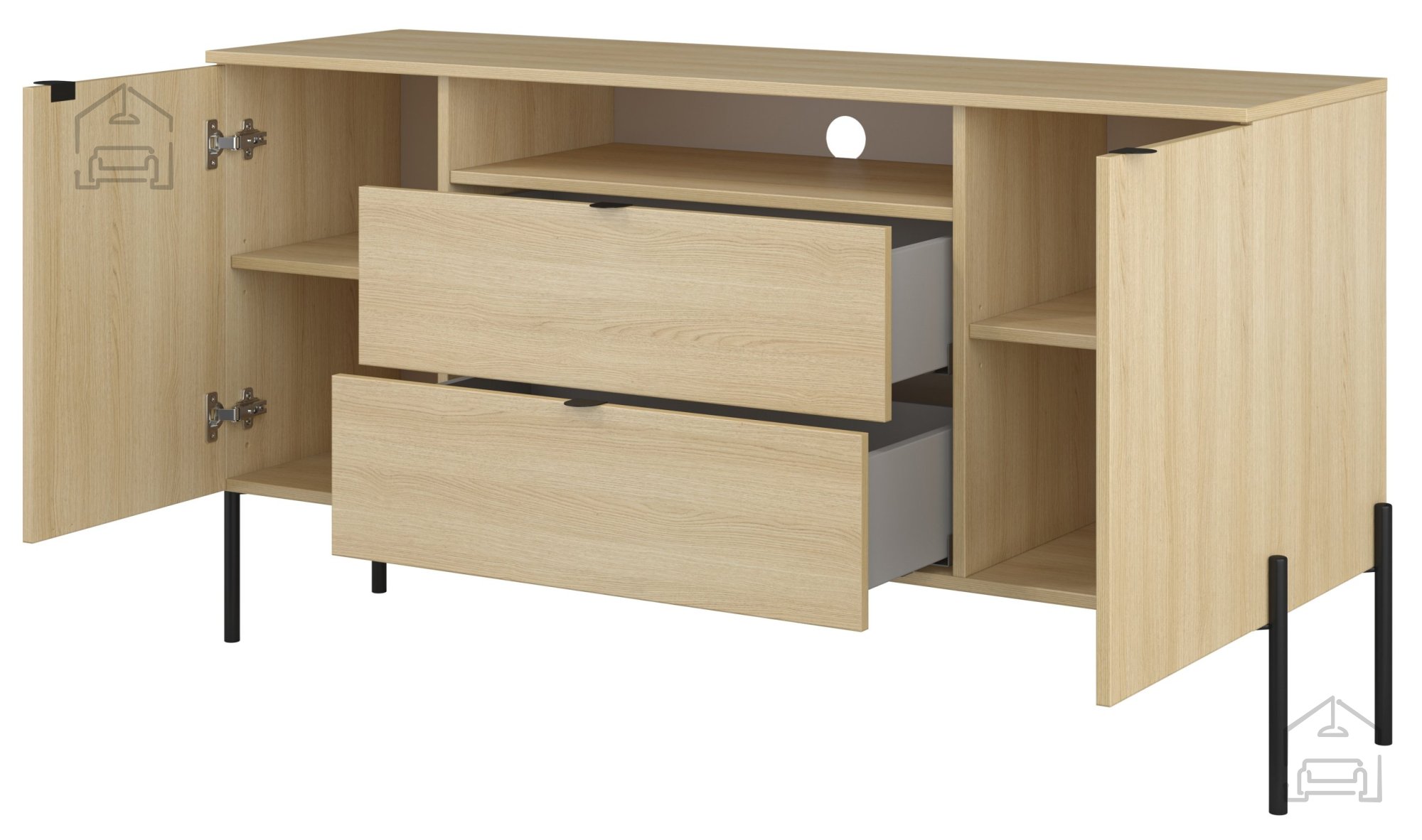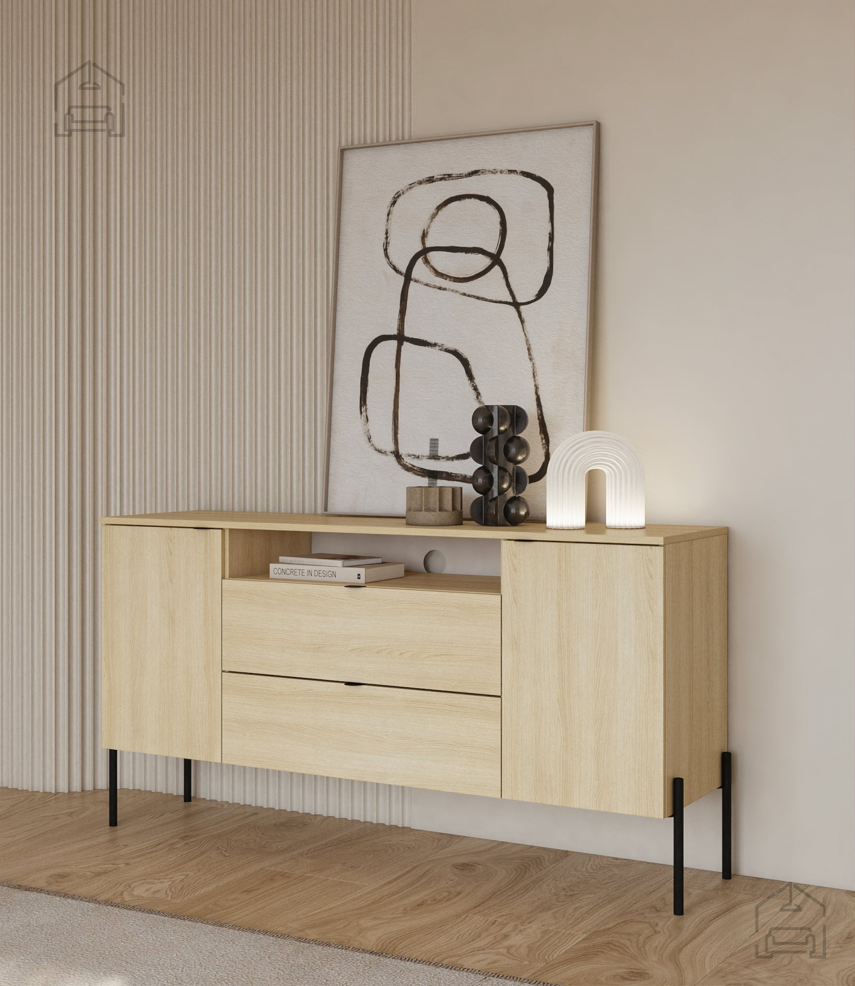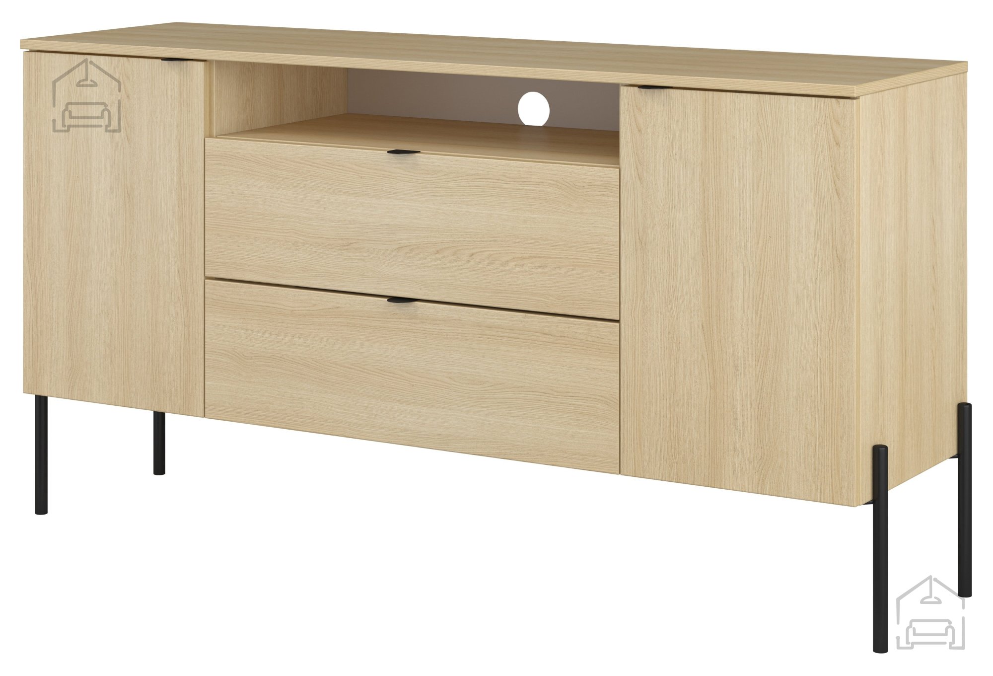 Komoda Ore je zasnovana z mislijo na sodoben življenjski slog. Njene čiste linije in nevtralni toni omogočajo, da se brez težav zlije z že obstoječim pohištvom ali pa postane osrednji element prostora. Hrastov odtenek s subtilno strukturo lesa daje pohištvu toplino, medtem ko kovinske noge v črni barvi vnašajo pridih industrijskega značaja. Ta kombinacija materialov ustvarja vizualno uravnotežen dizajn, ki se poda tako v minimalistične kot v bolj klasično urejene interierje.