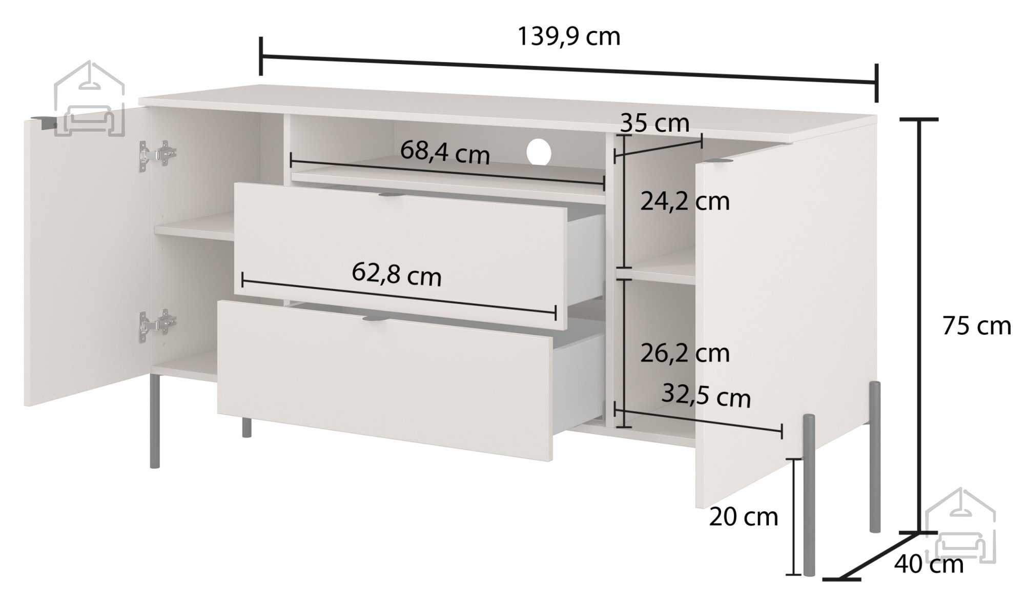 Dimenzije 140 × 41,5 × 75 cm omogočajo, da komoda ponudi dovolj prostora za shranjevanje, ne da bi zasedla preveč površine. V notranjosti se skrivajo prostorni predali in police, idealne za pospravljanje dokumentov, tekstila ali osebnih predmetov. Prednosti komode dopolnjujejo kakovostni tečaji z mehkim zapiranjem, ki preprečujejo nenadne udarce vratc in omogočajo tiho, tekoče delovanje. Plastični ročaji so diskretni, a funkcionalni – njihova oblika omogoča udoben oprijem ter dopolnjuje celostni videz pohištva.