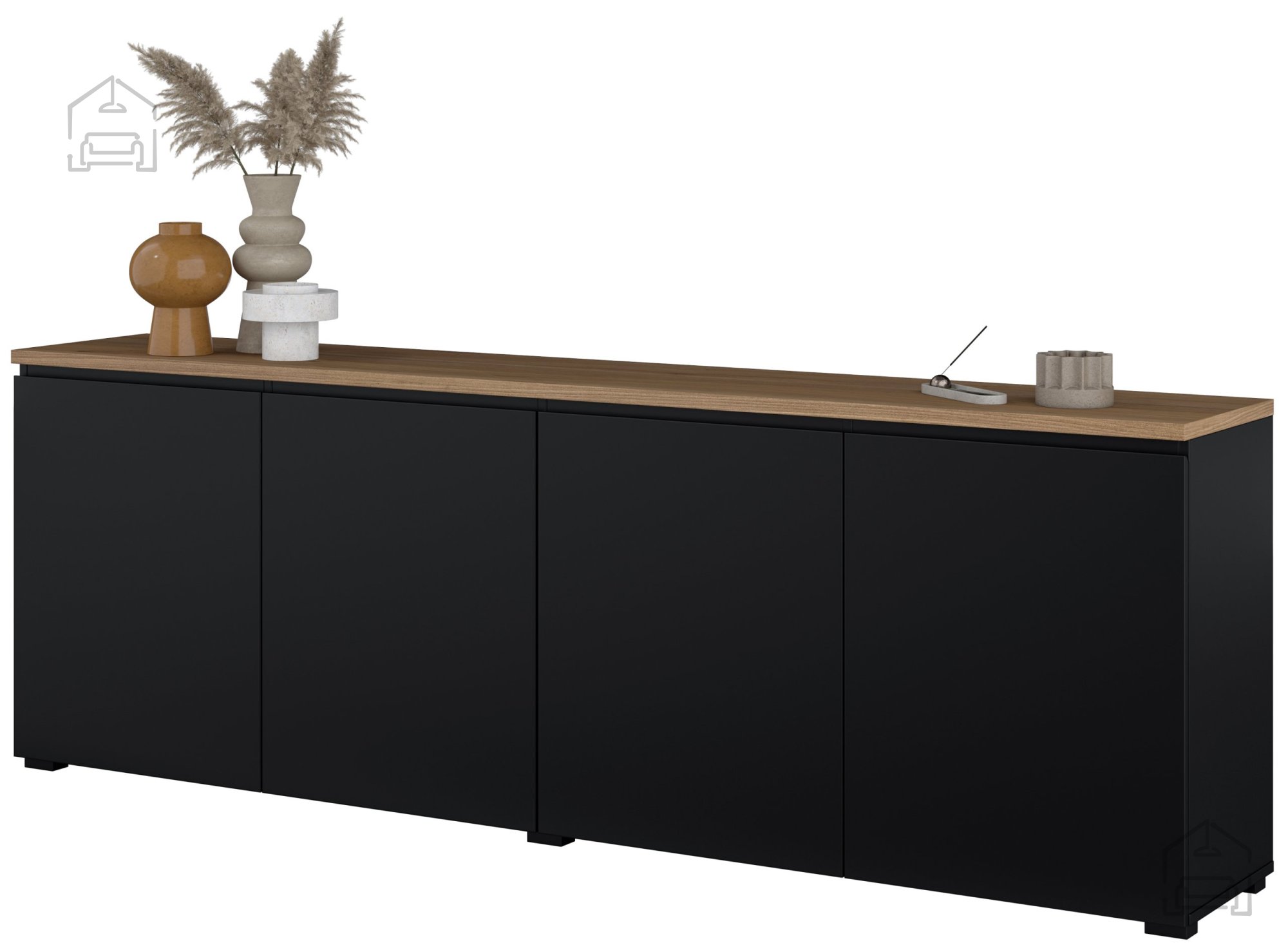 TV komoda Modo – Helvetia meble združuje sodobno estetiko in praktično funkcionalnost v elegantni kombinaciji črne barve in dekorja hrasta mauvella. S svojimi dimenzijami 200x68x35 cm ponuja dovolj prostora za televizor, multimedijske naprave in druge predmete, hkrati pa v prostoru deluje kot osrednji estetski element. Izdelana je iz kakovostne laminirane plošče, kar zagotavlja trdnost in enostavno vzdrževanje, medtem ko hrbtno stran dopolnjuje 3 mm HDF plošča, ki dodatno povečuje stabilnost konstrukcije.