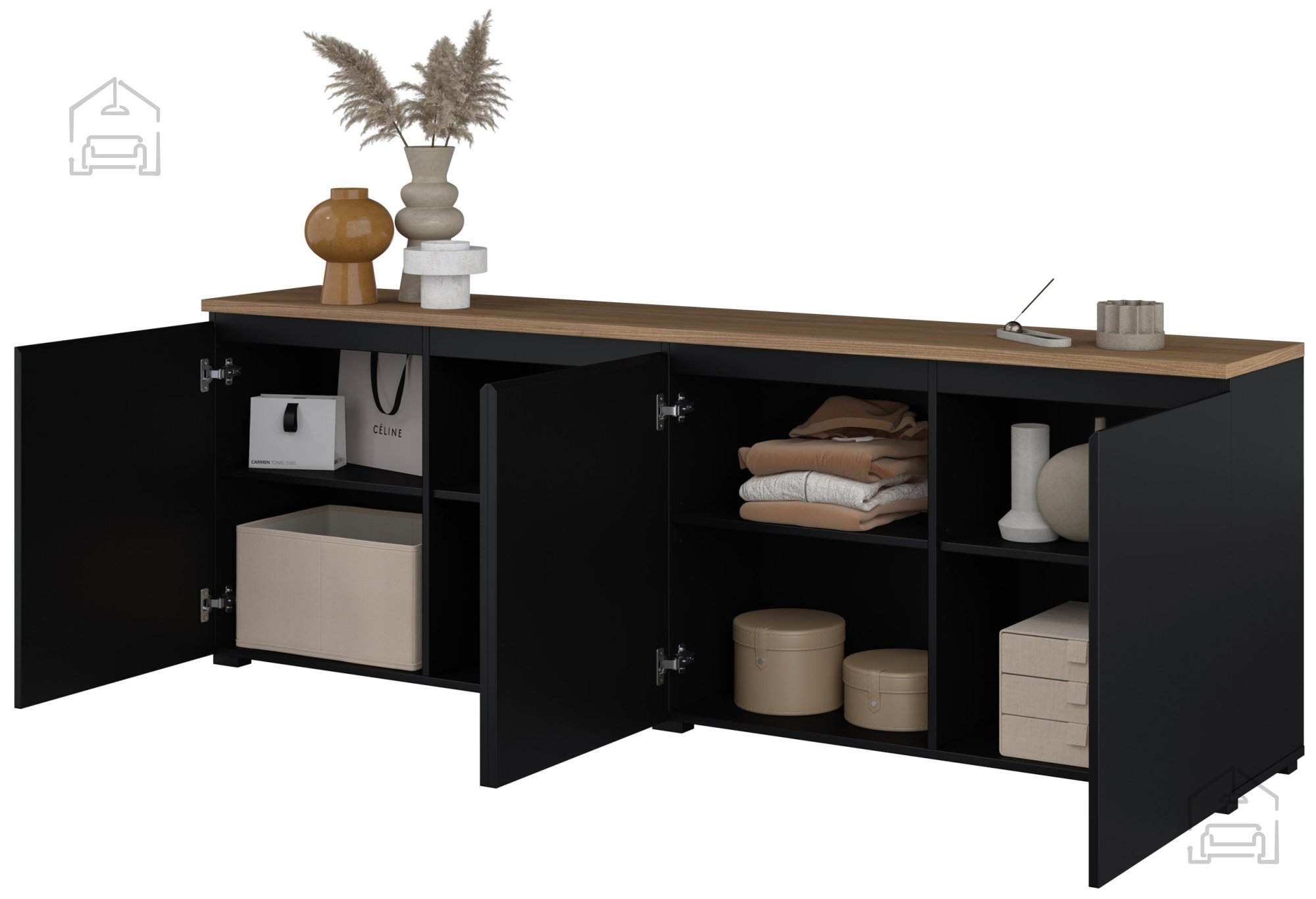 Kombinacija črne barve in dekorja hrasta mauvella prinaša prijeten kontrast med toplino lesa in eleganco temnih tonov. Takšna barvna rešitev omogoča, da komoda deluje kot subtilen, a izrazit oblikovni poudarek v dnevni sobi. Površina v dekorju hrasta mauvella ustvarja občutek naravnosti, medtem ko črna barva vnese pridih sodobne prefinjenosti. Ta vizualna igra svetlih in temnih tonov omogoča enostavno kombiniranje s preostalim pohištvom in dekorjem v prostoru.