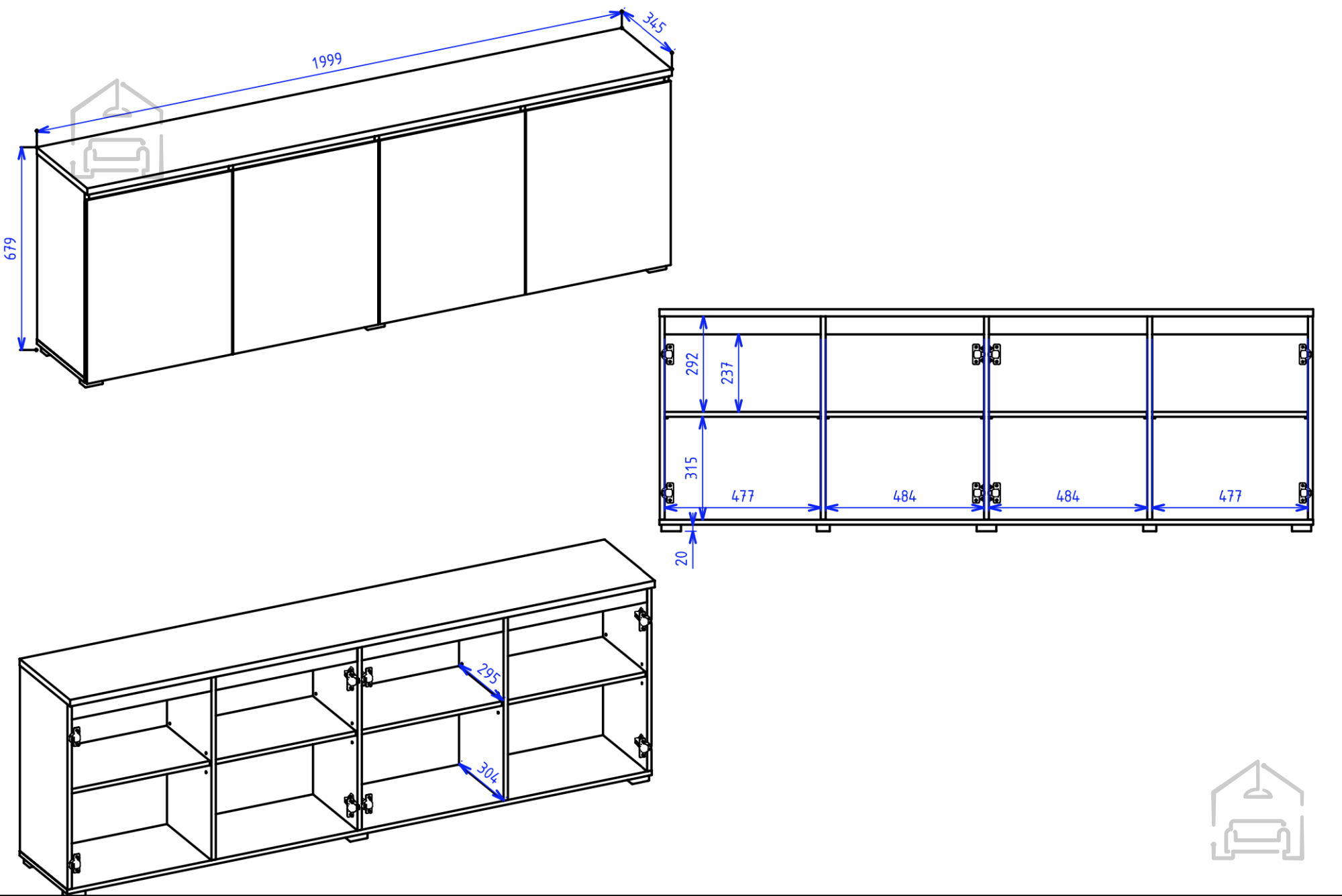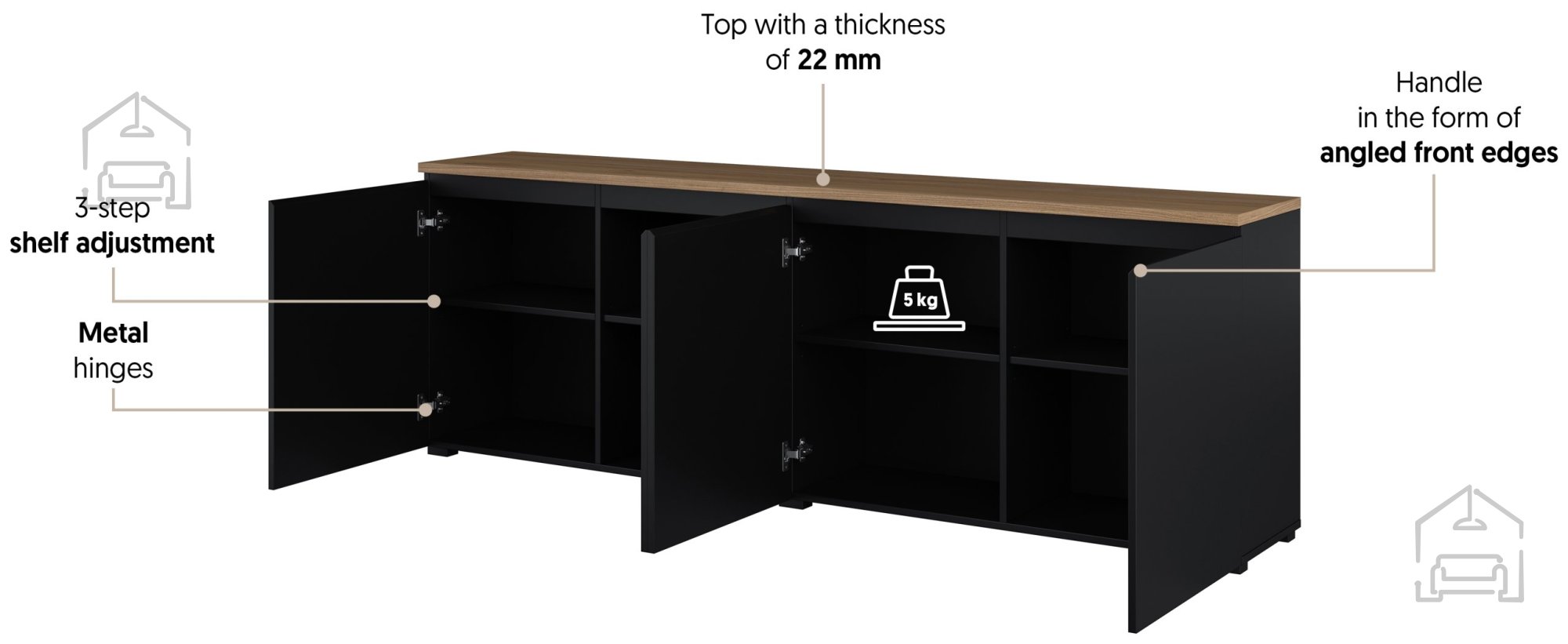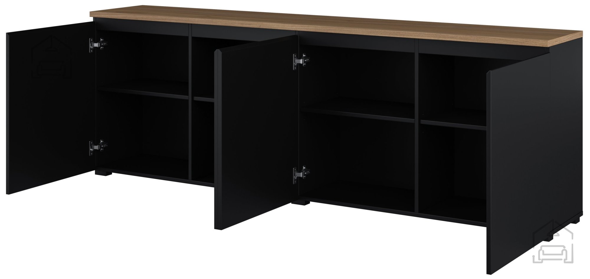 Zaradi svoje dolžine 200 cm komoda nudi dovolj prostora za širok spekter avdio-video naprav, igralnih konzol ali okrasnih predmetov. Notranjost komode je zasnovana tako, da omogoča urejeno shranjevanje kablov in pripomočkov, kar prispeva k urejenemu videzu dnevnega prostora. Vrata brez ročajev se odpirajo gladko in tiho, kar dodatno poudarja kakovost izdelave.