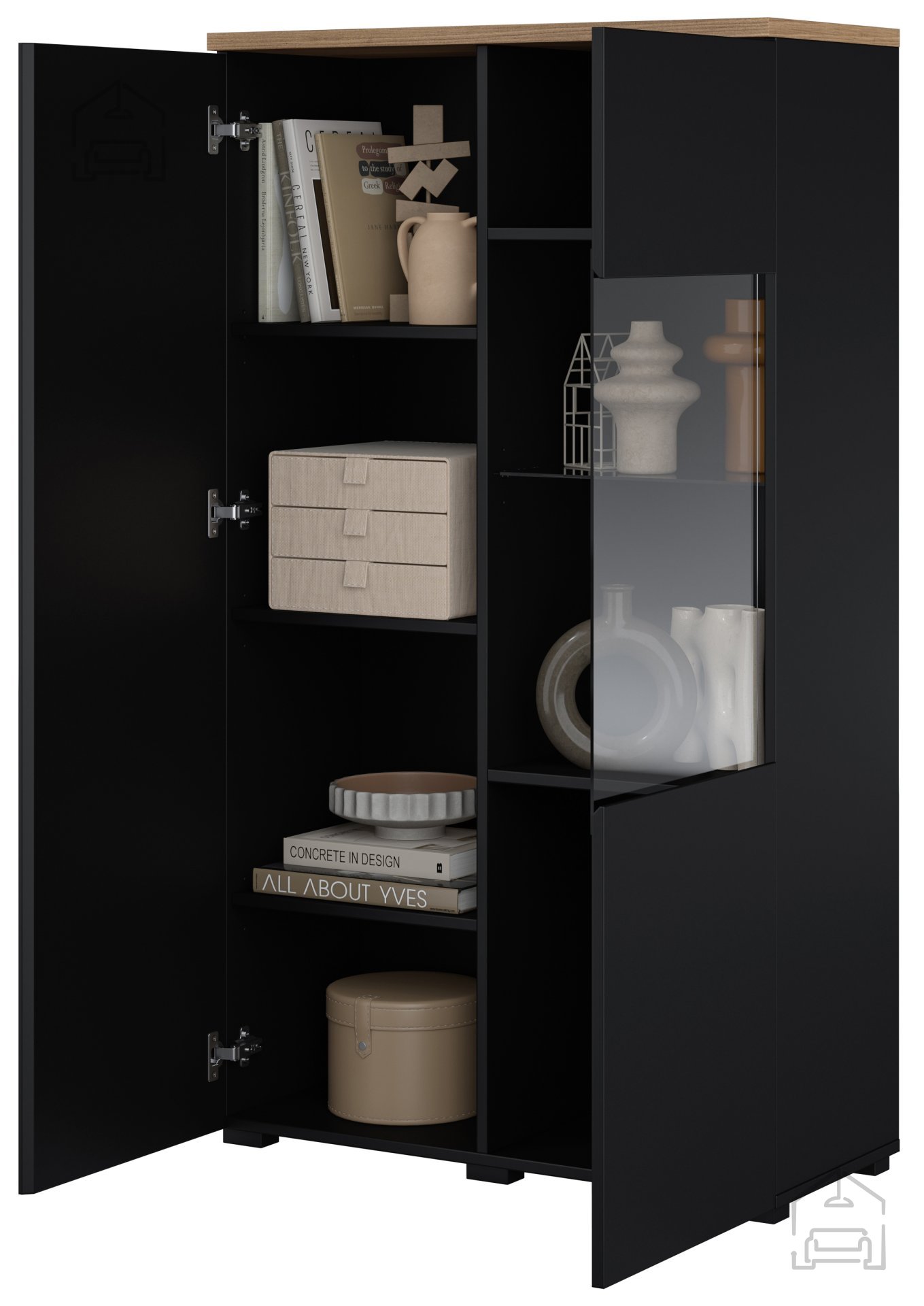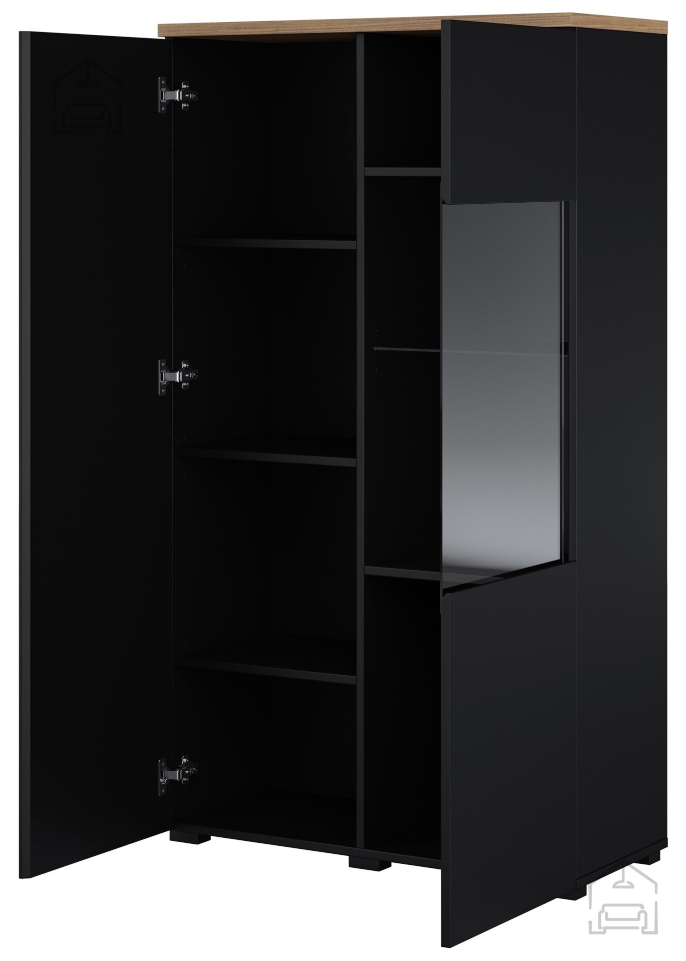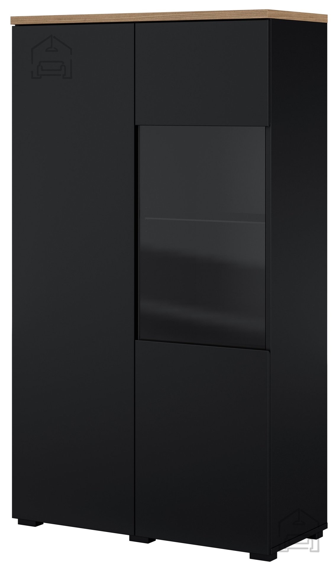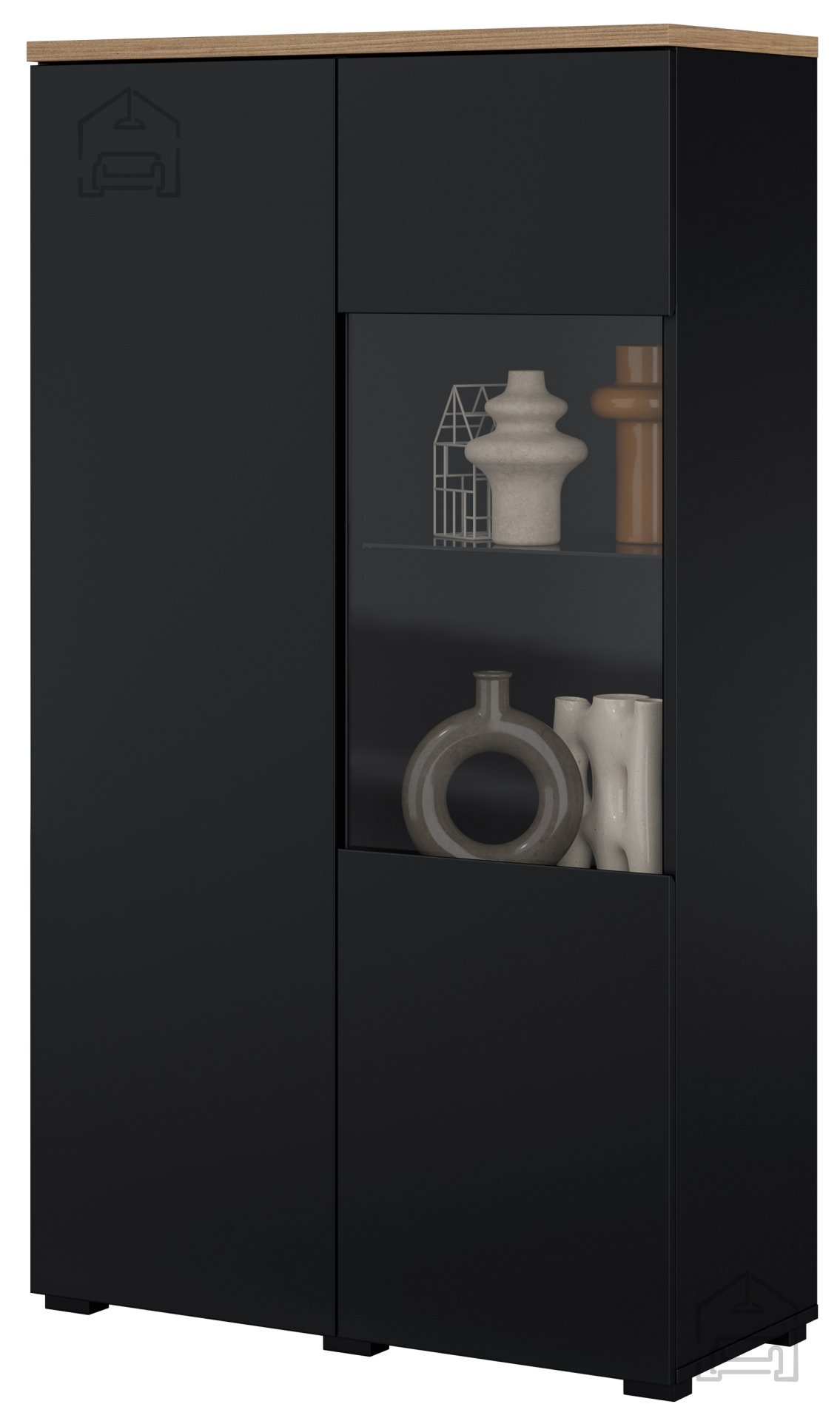 Kombinacija barv črna/hrast mauvella je osrednji vizualni element vitrine. Črna barva daje pridih elegance in sodobnosti, medtem ko hrast mauvella prinaša toplino in naravni značaj. Tak kontrast omogoča, da se vitrina prilagaja različnim barvnim shemam prostora – lahko postane subtilen del ozadja ali pa izrazit poudarek v interierju.