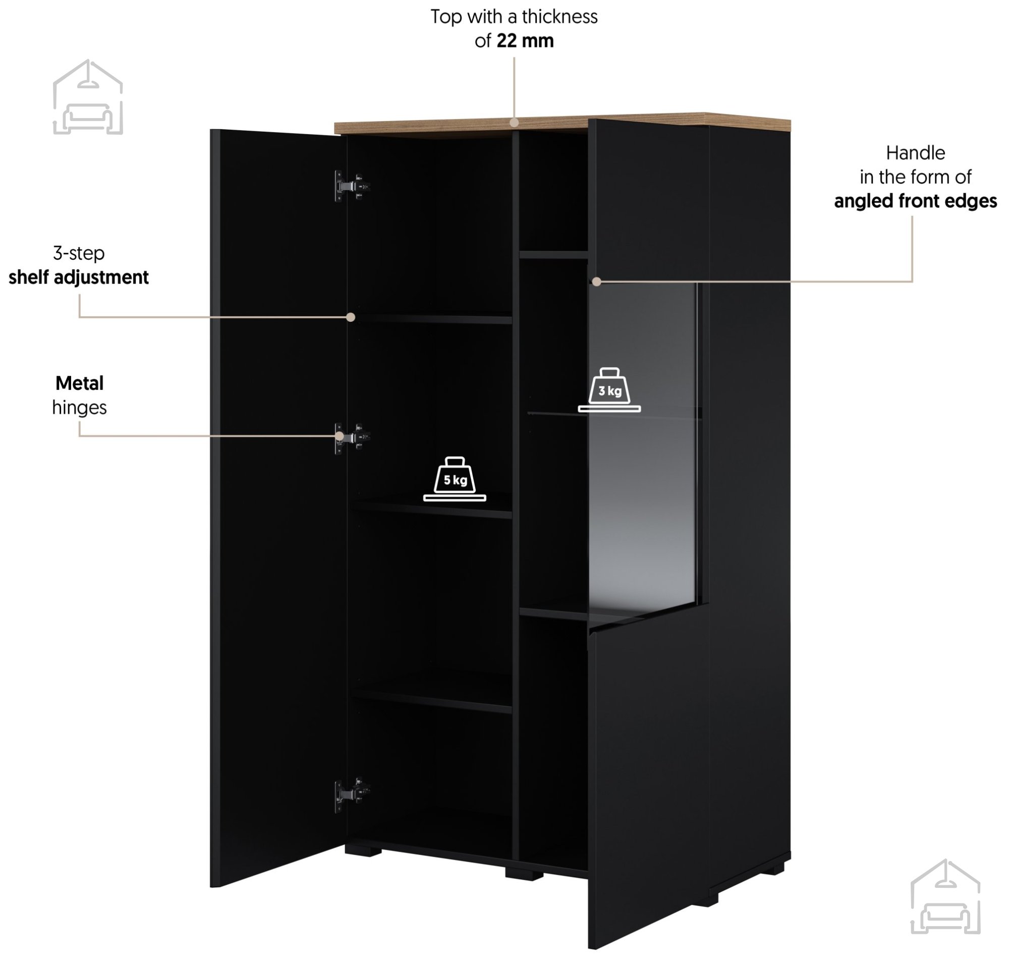 Vitrina Modo je oblikovana za praktično shranjevanje in razstavljanje predmetov. V notranjosti ponuja dovolj prostora za shranjevanje knjig, dekorativnih predmetov, steklovine ali drugih osebnih stvari. Zaradi razmeroma kompaktne globine 35 cm se lepo prilega tudi manjšim prostorom, ne da bi jih preobremenila. Takšna dimenzijska uravnoteženost omogoča optimalno izrabo prostora, hkrati pa ohranja eleganten videz.