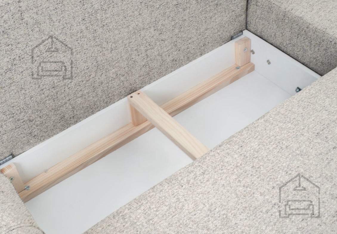 Pod sediščem se skriva predal za posteljnino, idealen za shranjevanje odej, blazin ali drugih dodatkov. Ta praktična rešitev pripomore k večji urejenosti prostora in omogoča, da imate vse, kar potrebujete za hitro pripravo ležišča, vedno pri roki.