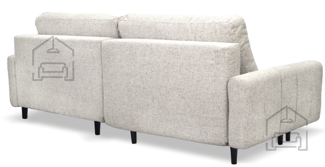 Na fotografiji je garnitura prikazana v tkanini Havre 22, ki se ponaša z mehko strukturo in prijetnim otipom. Model je na voljo v različnih barvnih kombinacijah, zato ga je mogoče enostavno prilagoditi obstoječemu interierju. Hrbtni del garniture je prav tako oblazinjen v isti tkanini, kar omogoča postavitev tudi na sredino prostora, ne le ob steno.