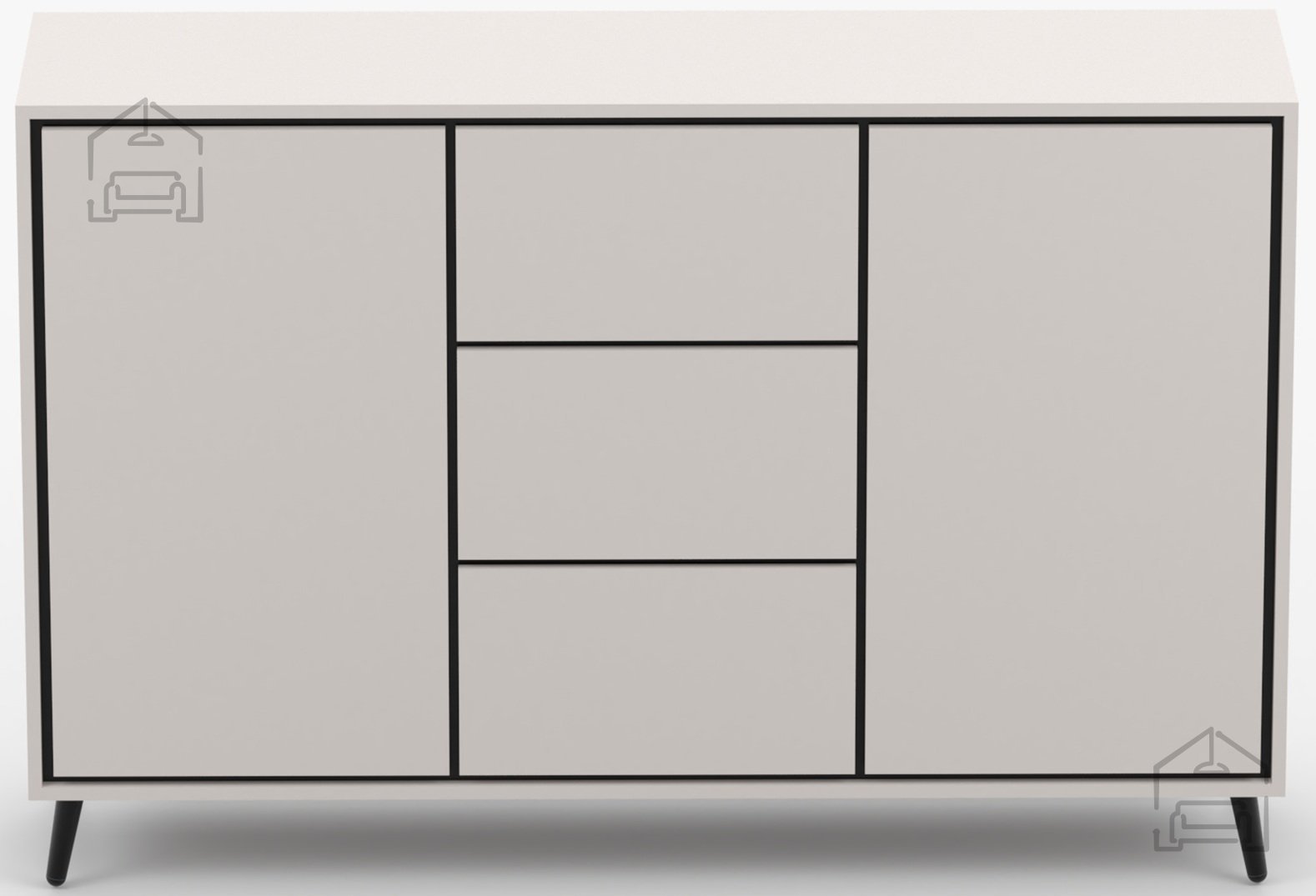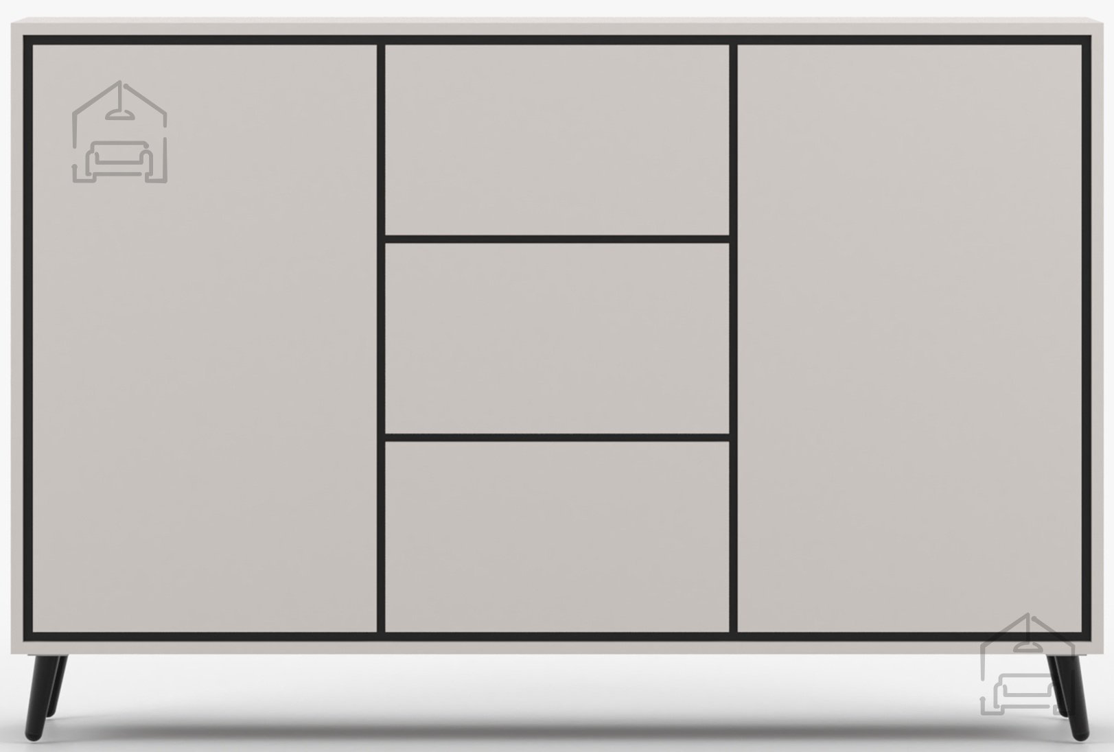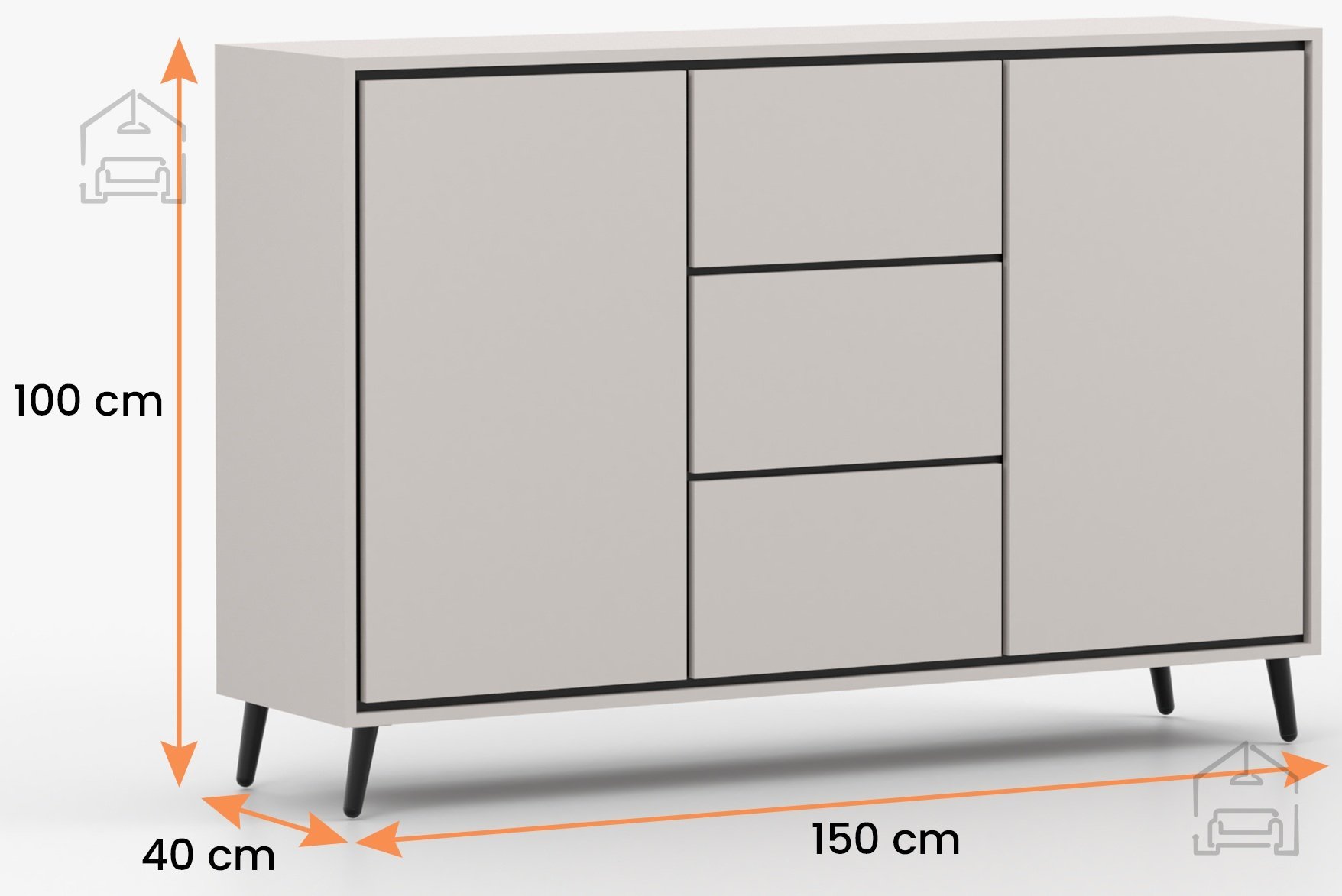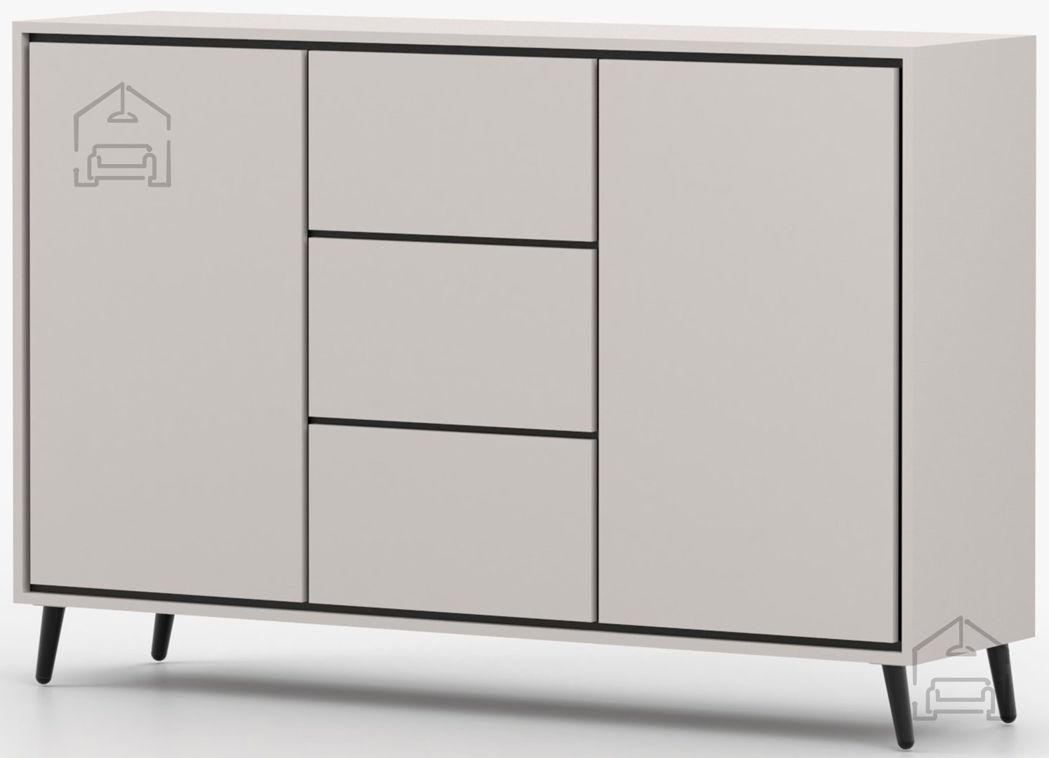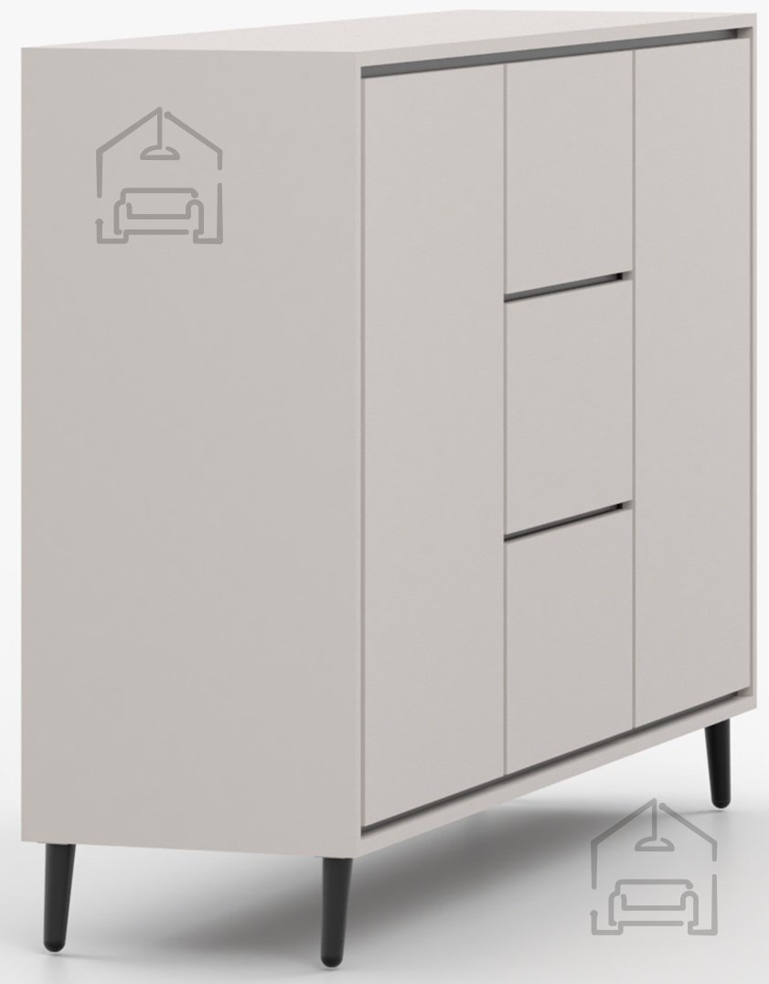 Kombinacija barve kašmir in črnih vložkov ustvarja sodoben kontrast, ki dopolnjuje številne notranje stile. Površina je gladka in elegantna, brez nepotrebnih dekorativnih elementov, kar daje pohištvu prefinjenost. Kovinske noge niso le funkcionalen, temveč tudi vizualni element, ki dodaja občutek lahkotnosti in sodobnosti. Višina nog omogoča, da komoda deluje manj masivno, kar je še posebej pomembno v manjših prostorih.