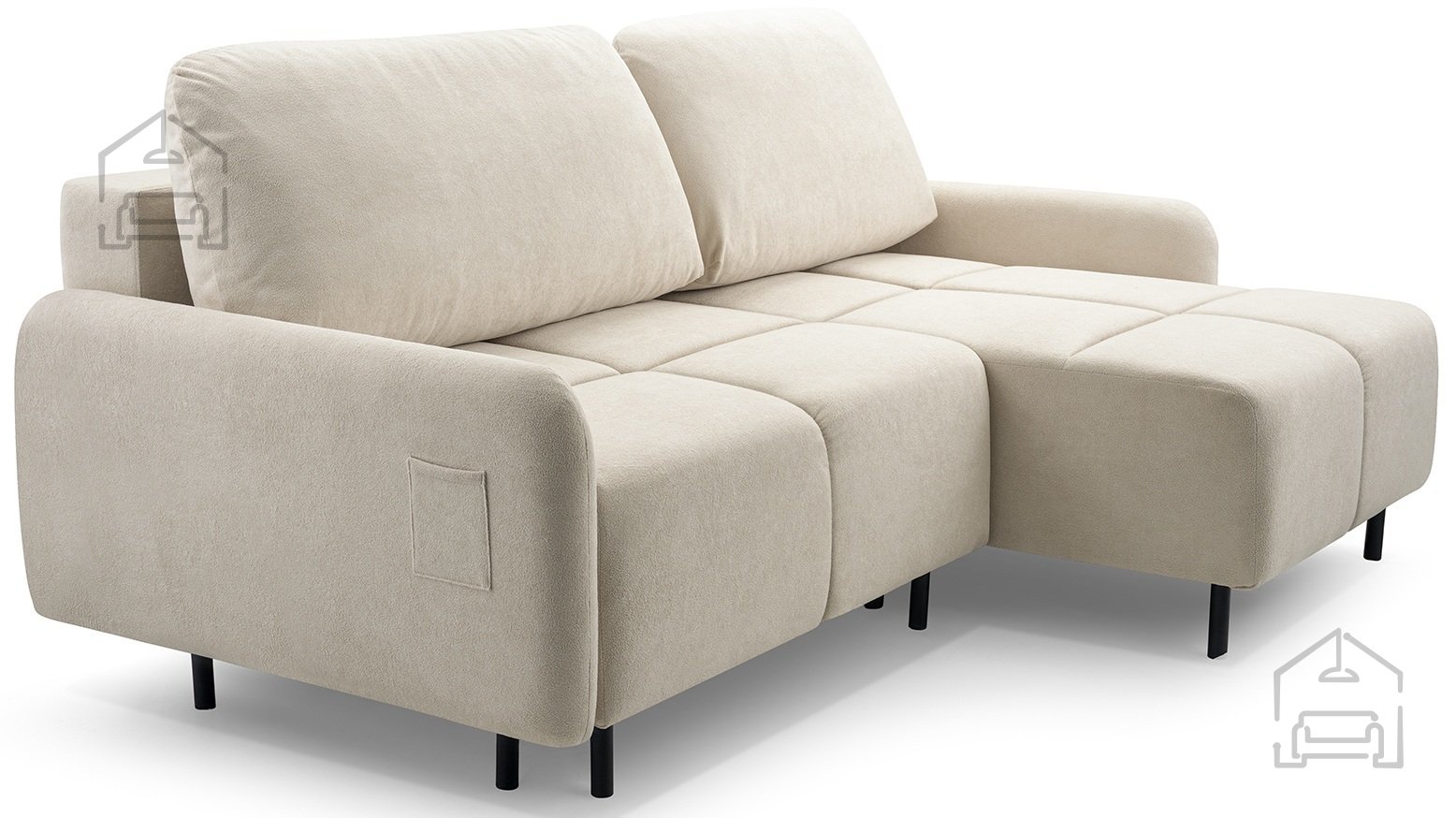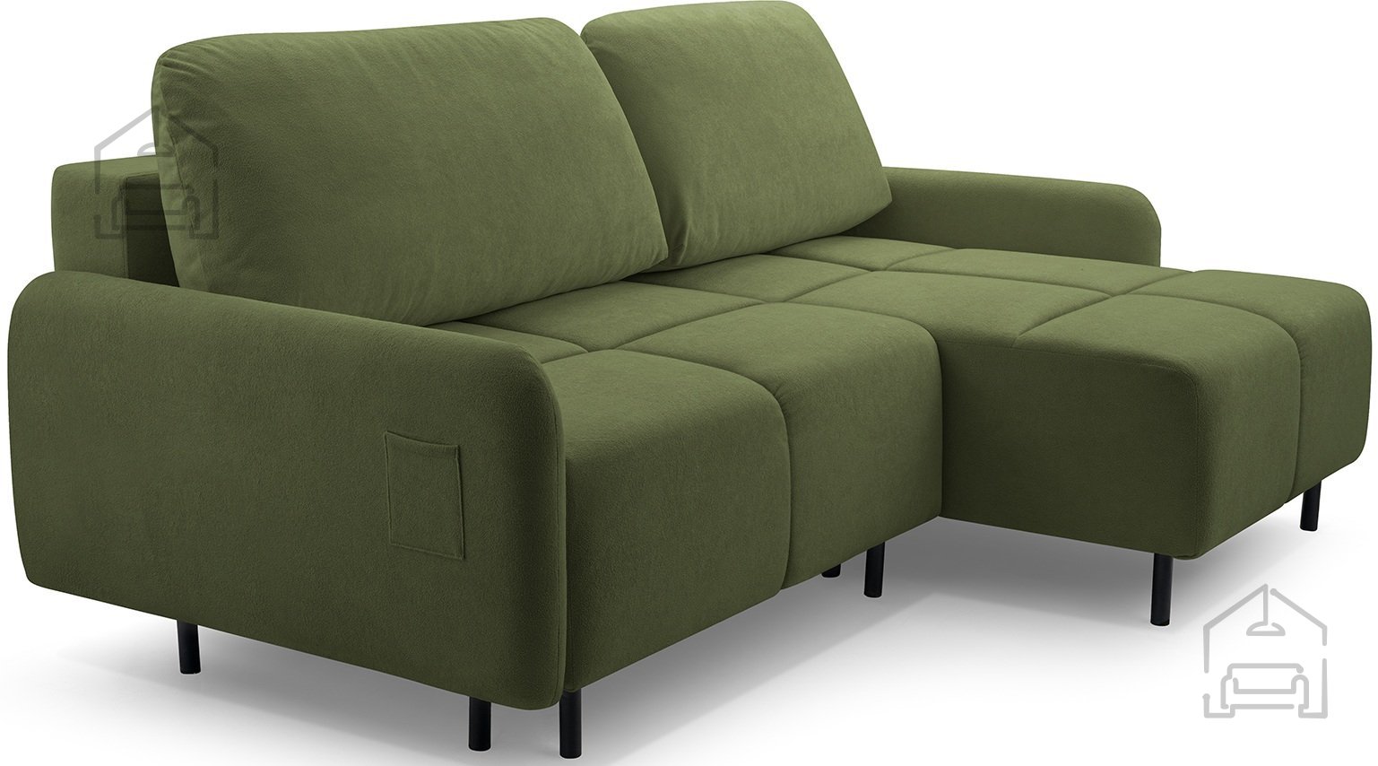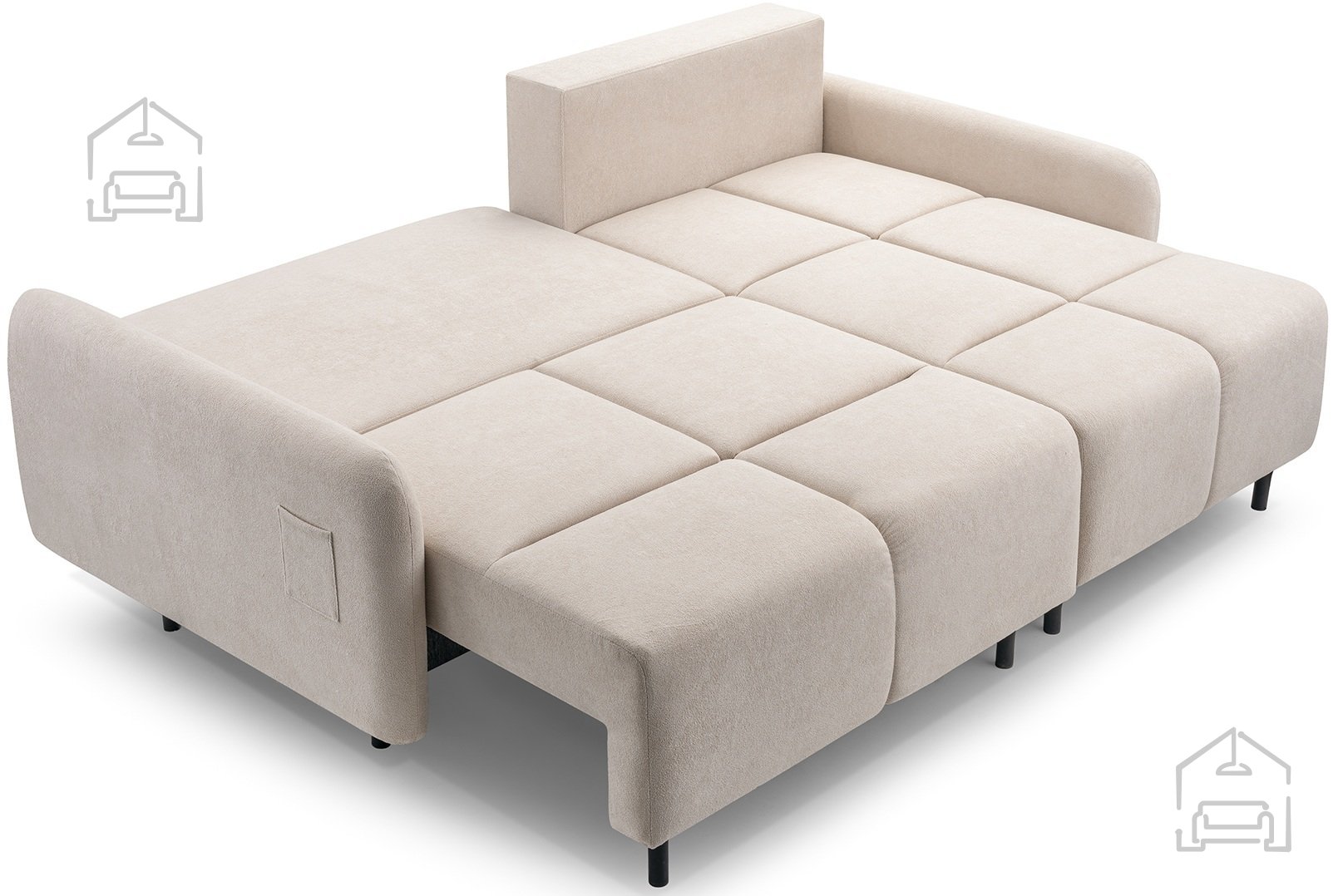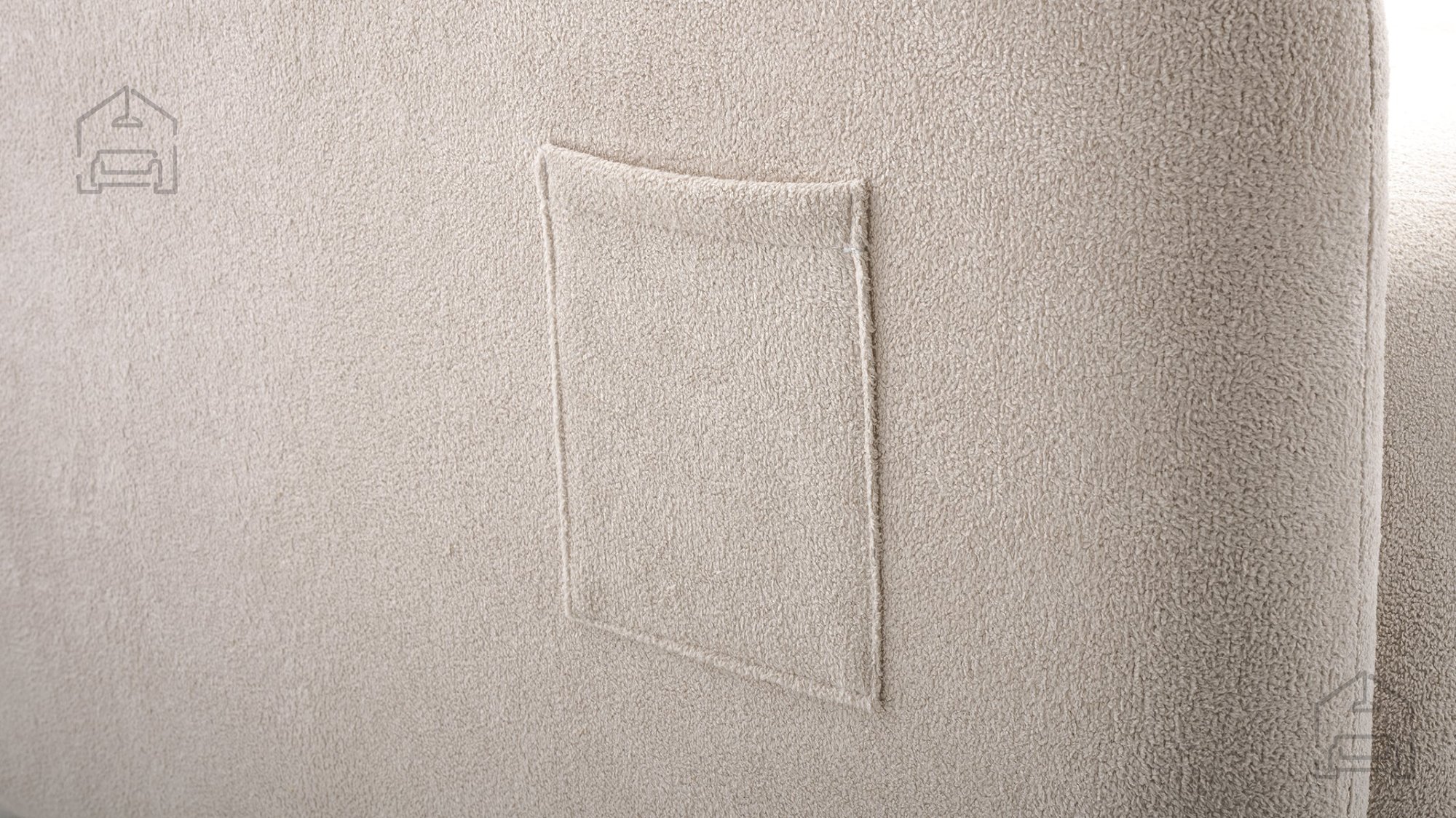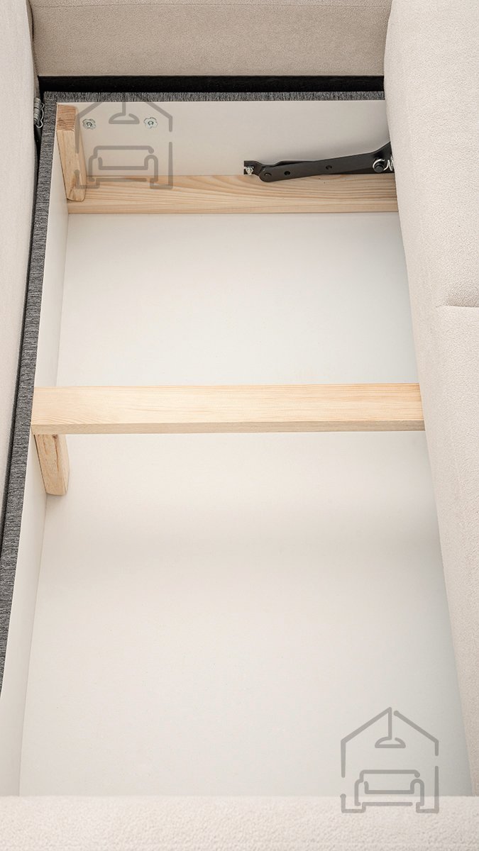 Pod sediščem se nahaja prostoren predal za posteljnino, kamor lahko shranite odeje, vzglavnike ali druge tekstilne dodatke. S tem garnitura ne ponuja le udobja, temveč tudi praktično rešitev za shranjevanje. Uporabniki bodo cenili tudi kieszonko – žep za telefon, ki je diskretno umeščen ob strani in omogoča priročno odlaganje manjših predmetov.