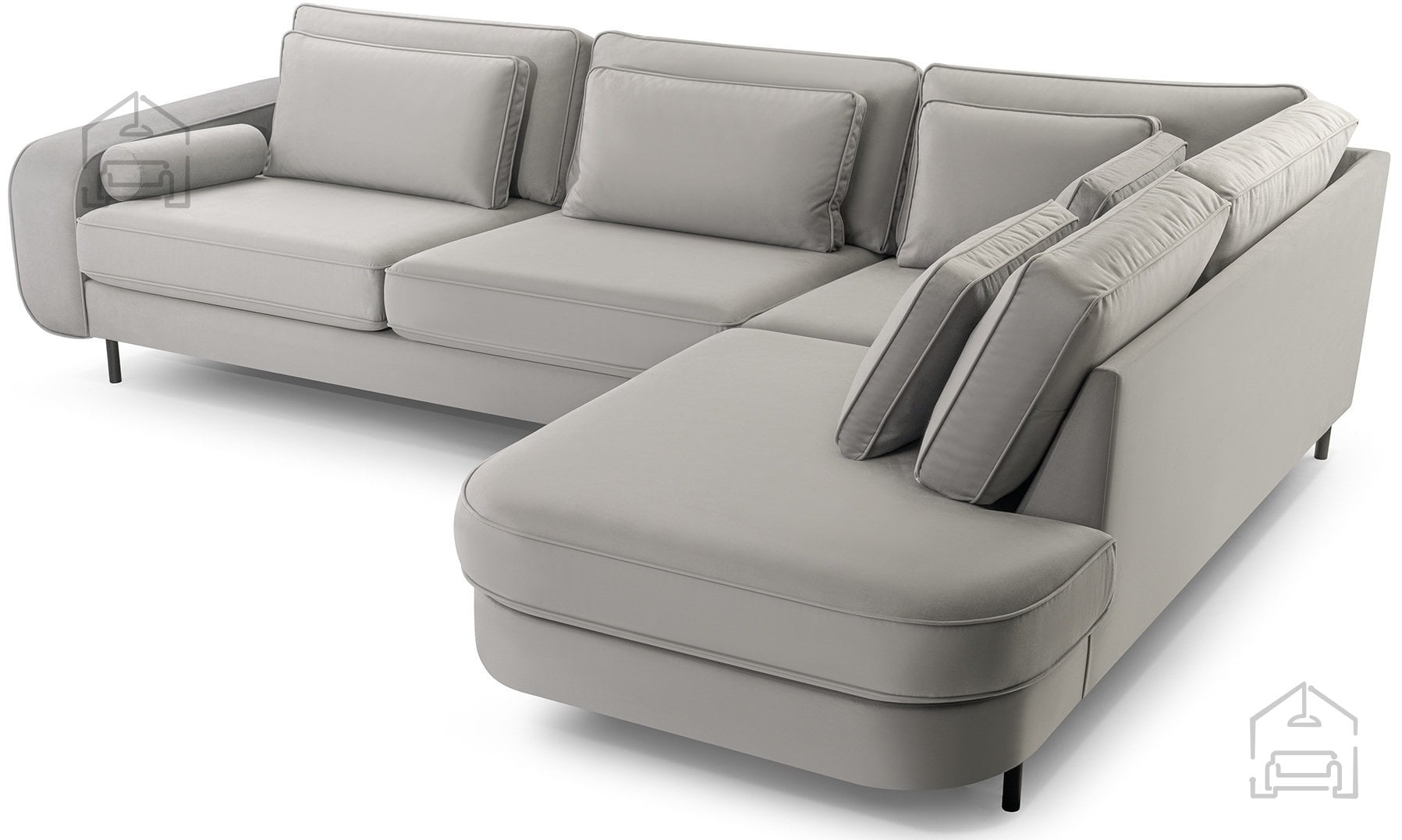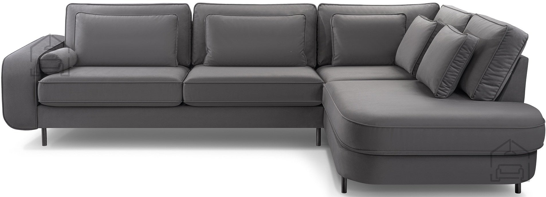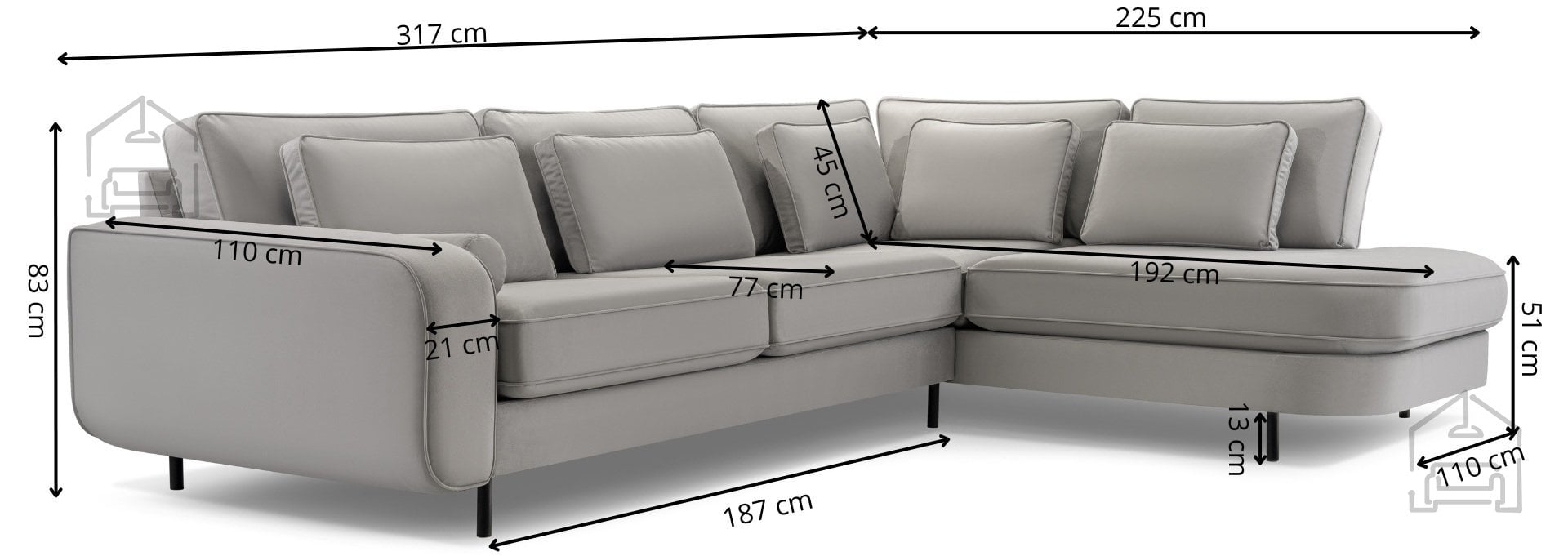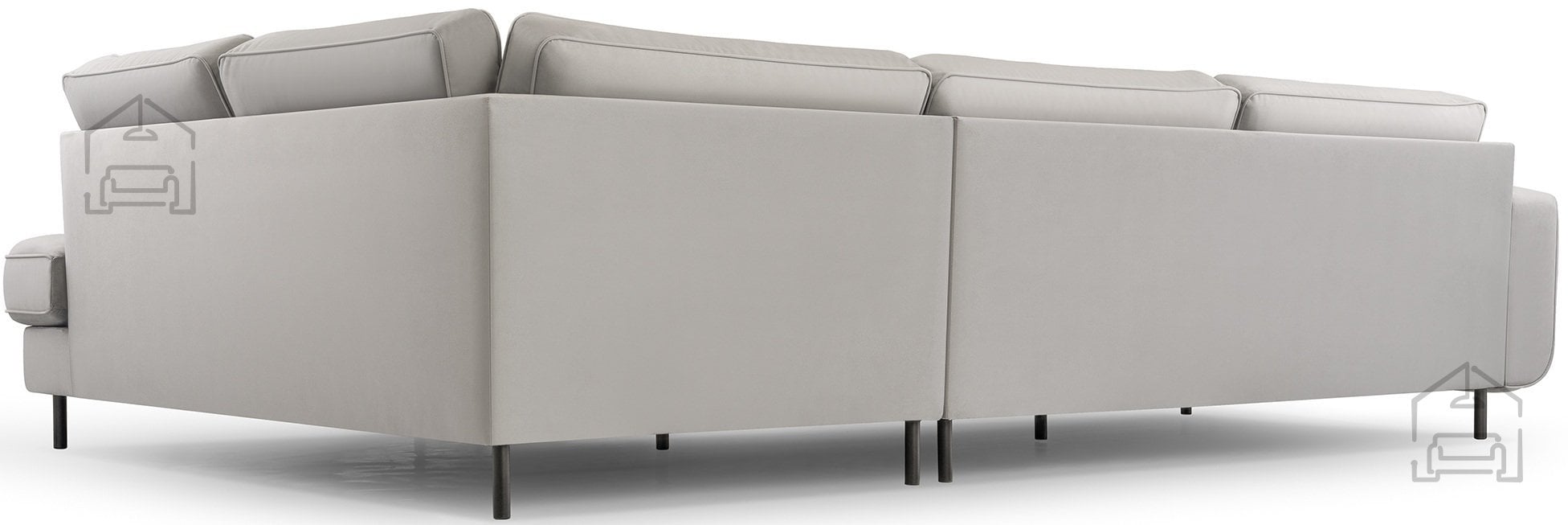 Kotna zasnova garniture Filip omogoča optimalno izrabo prostora, ne glede na to, ali jo postavite v dnevno sobo, večji salon ali odprt bivalni prostor. Njen moderen stil je poudarjen z jeklenimi črnimi nogami, ki dodajo pridih industrijske elegance, hkrati pa zagotavljajo stabilnost in vizualno lahkotnost. Garnitura nima spalne funkcije in nima predala za posteljnino, kar pomeni, da je namenjena izključno udobnemu sedenju in sproščanju.