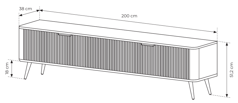 Dimenzije 200x38x51,2 cm omogočajo, da komoda nudi dovolj prostora za vaš televizor, medijske naprave in dekorativne dodatke, hkrati pa ne zavzame preveč prostora. Čiste linije in svetla barva ustvarijo občutek prostornosti, kar je še posebej pomembno v manjših dnevnih sobah ali stanovanjih. Zasnova omogoča preprosto umeščanje v različne interierje, saj bela barva odlično sovpada z lesom, kovino ali barvitimi dodatki.