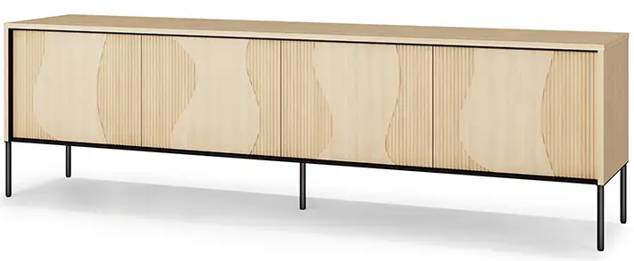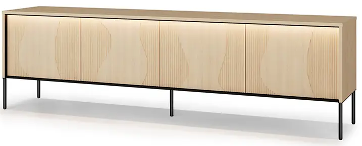 Vsak detajl je premišljeno zasnovan: od natančno obdelanih robov do gladkih površin, ki omogočajo enostavno vzdrževanje. S svojo širino komoda nudi stabilno osnovo za večje televizorje, medtem ko spodnji del poskrbi za optimalno organizacijo prostora.