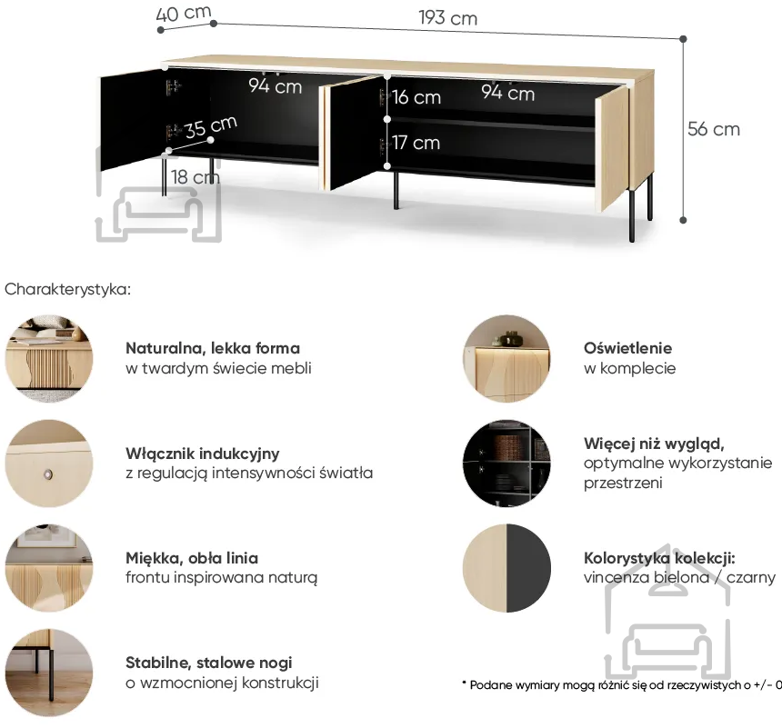 TV komoda Flow FW-05 je sodoben kos pohištva, ki združuje funkcionalnost, estetiko in kakovostno izdelavo. Izdelana je iz trpežnih materialov, ki zagotavljajo dolgo življenjsko dobo, hkrati pa njen dizajn v kombinaciji beljenega hrasta Vincenza in črne barve v prostor vnese toplino in eleganco. S svojimi čistimi linijami in premišljeno razporeditvijo notranjih prostorov je komoda idealna izbira za dnevne sobe, kjer želite združiti praktičnost shranjevanja z modernim videzom.