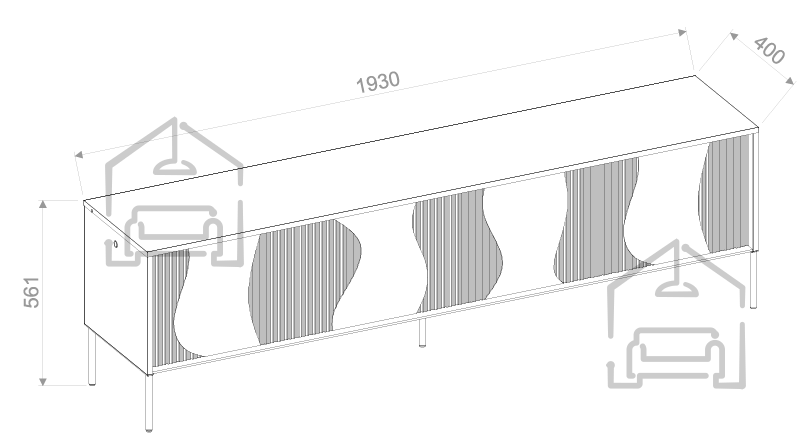TV komoda meri 193x40x57 cm, kar ponuja dovolj prostora tako za televizor kot za dodatno multimedijsko opremo. Zasnova vključuje štiri prostorna vrata, za katerimi se skriva organiziran notranji prostor. Ta je primeren za shranjevanje različnih predmetov – od avdio-video naprav, kablov in daljincev do dokumentov ali dekorativnih dodatkov. Zaradi diskretnega zapiranja so vsebina in kabli vedno lepo pospravljeni, dnevna soba pa ostaja urejena in estetsko dovršena.
