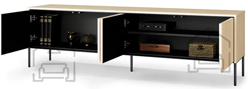 Vitke črne noge dajejo komodi lahkotnost in vizualno zračnost, hkrati pa omogočajo enostavno čiščenje tal pod njo. Kombinacija svetlega lesa in temnih poudarkov ustvarja harmoničen kontrast, ki deluje prijetno in uravnoteženo. Komoda se tako brez težav vključi v različne ambiente – tako v sodobne kot bolj klasične dnevne sobe.