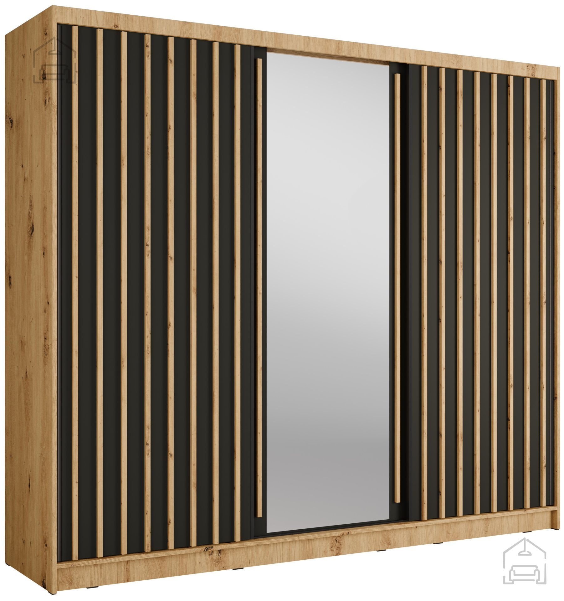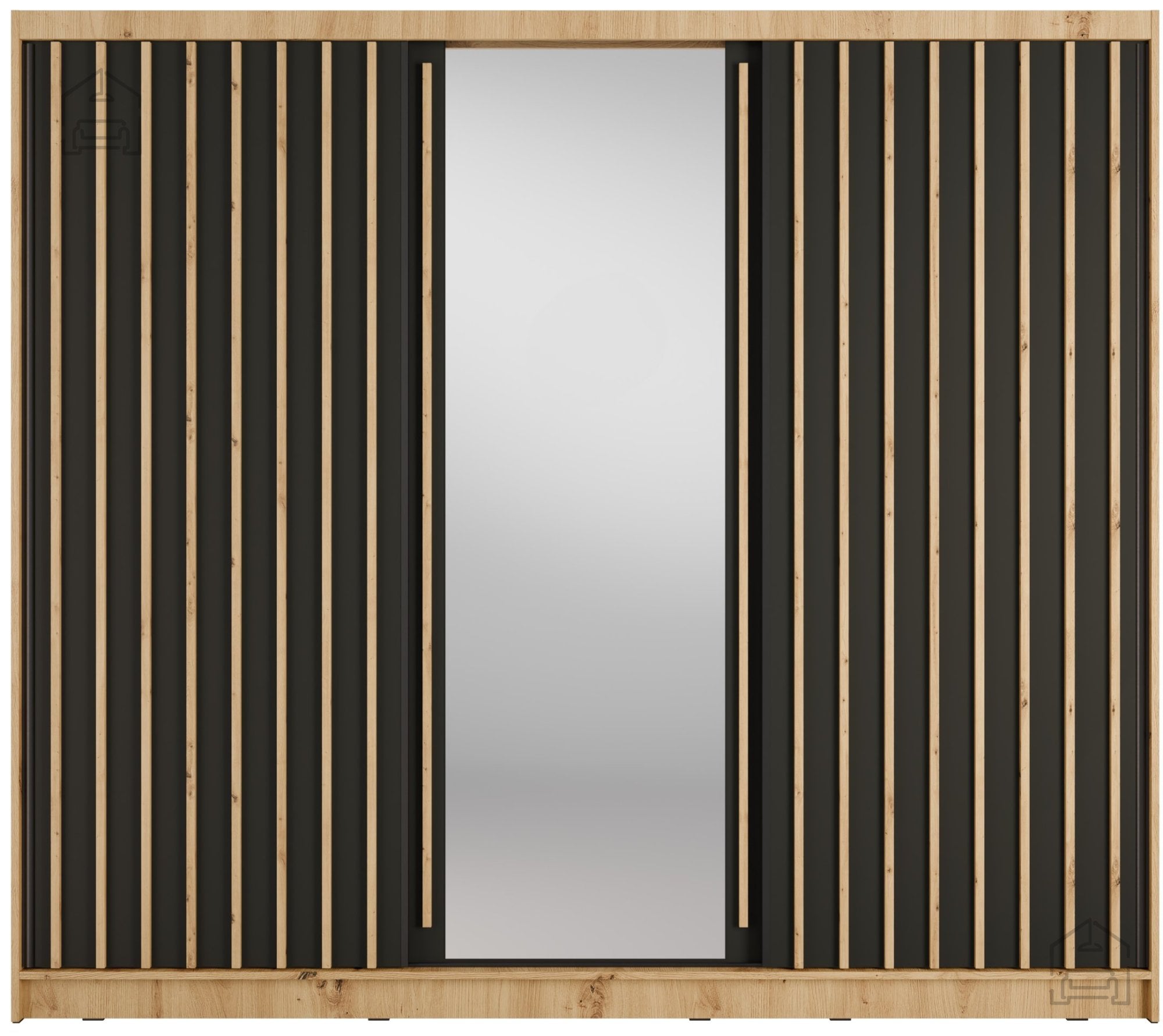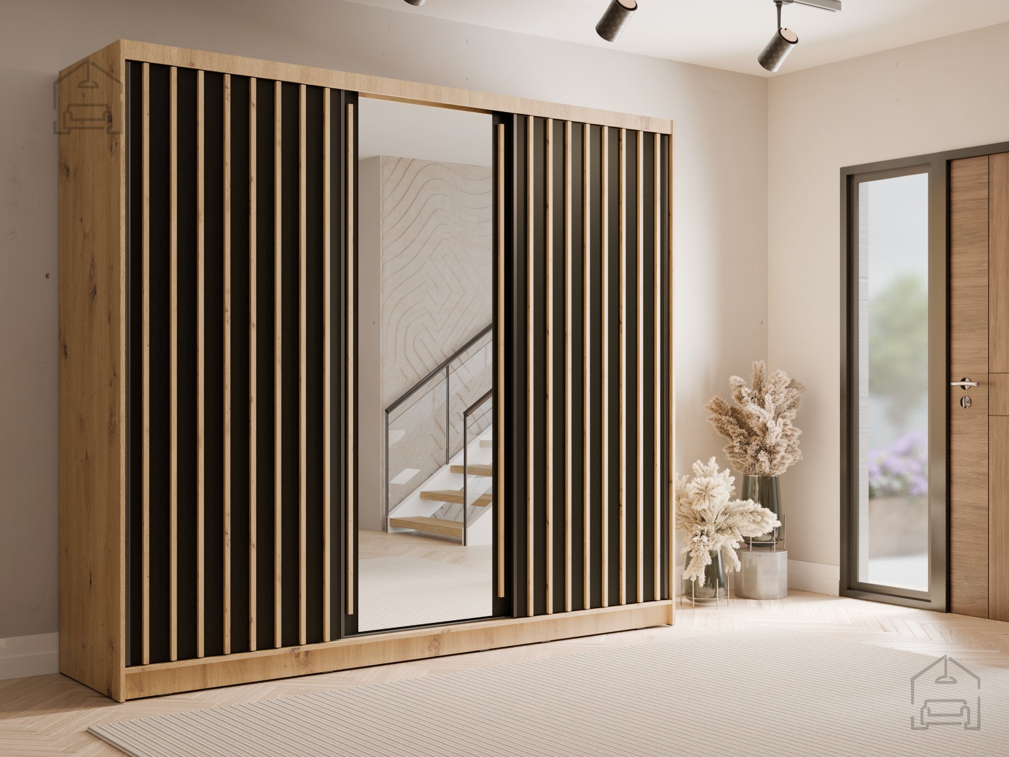 Omara meri 248 cm v širino, 62 cm v globino in 215 cm v višino. Zaradi uravnoteženih mer se prilega tako v večje spalnice kot v ožje prostore. Višina 215 cm omogoča maksimalno izrabo prostora do stropa, kar je še posebej uporabno v stanovanjih, kjer je vsak centimeter pomemben. Širina 248 cm nudi dovolj prostora za garderobo ene ali dveh oseb, odvisno od potreb in dodatne notranje organizacije. Omara se lahko postavi ob steno, v nišo ali kot samostojen kos pohištva.