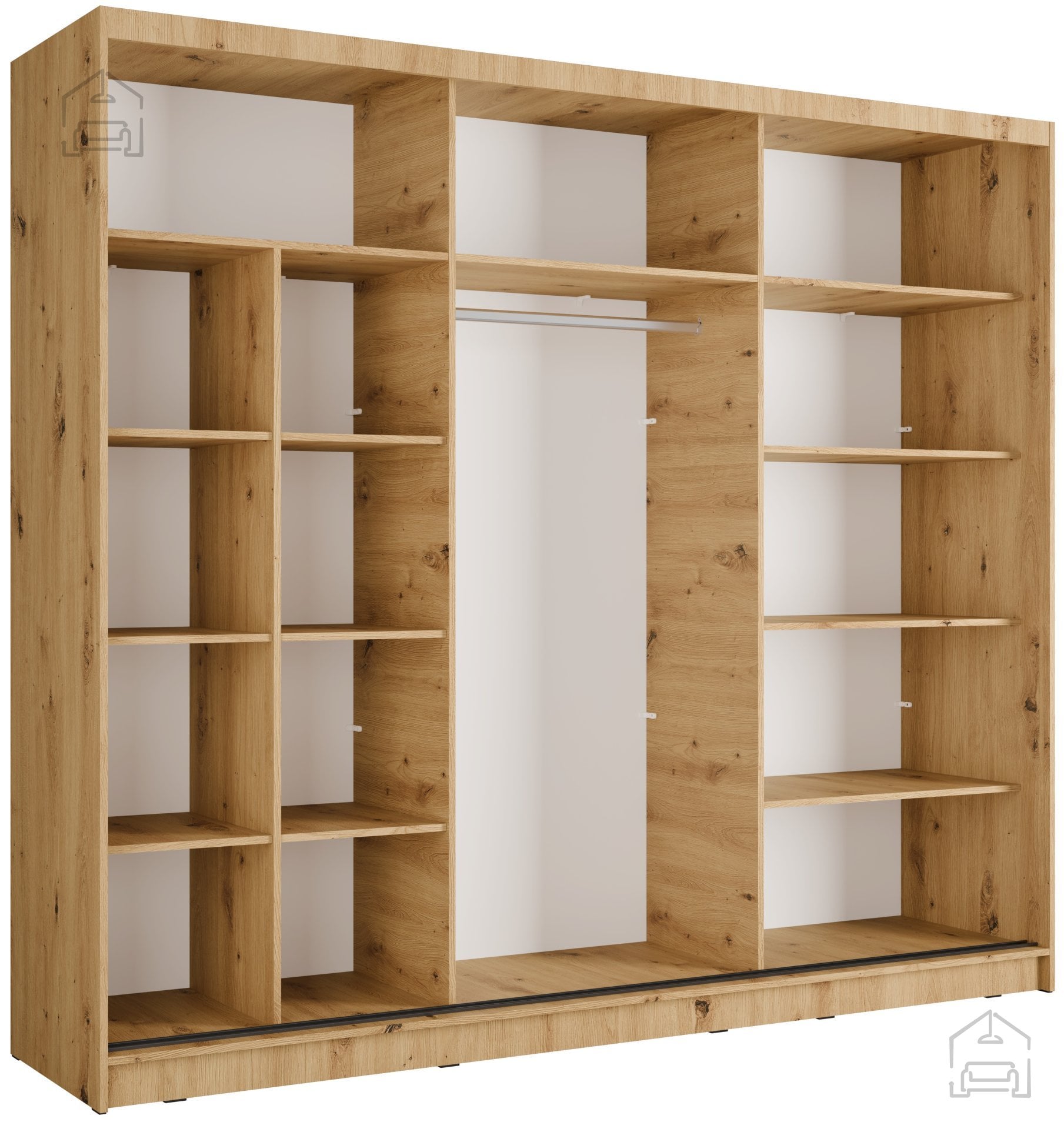 Garderobna omara z drsnimi vrati Aluna 13 v barvi artisan hrasta je izdelek, ki združuje naravni videz lesa z moderno funkcionalnostjo. Izdelana je v tovarni Meblosiek na Poljskem, znani po kakovostni obdelavi lesenih plošč in natančni izdelavi pohištva. S svojo širino 248 cm, globino 62 cm in višino 215 cm nudi dovolj prostora za shranjevanje oblačil, obutve in dodatkov, hkrati pa ohranja eleganten videz spalnice ali predsobe. Površina laminirane plošče je odporna na praske in enostavna za čiščenje, zato je omara primerna za vsakodnevno uporabo v družinskih domovih ali manjših stanovanjih.