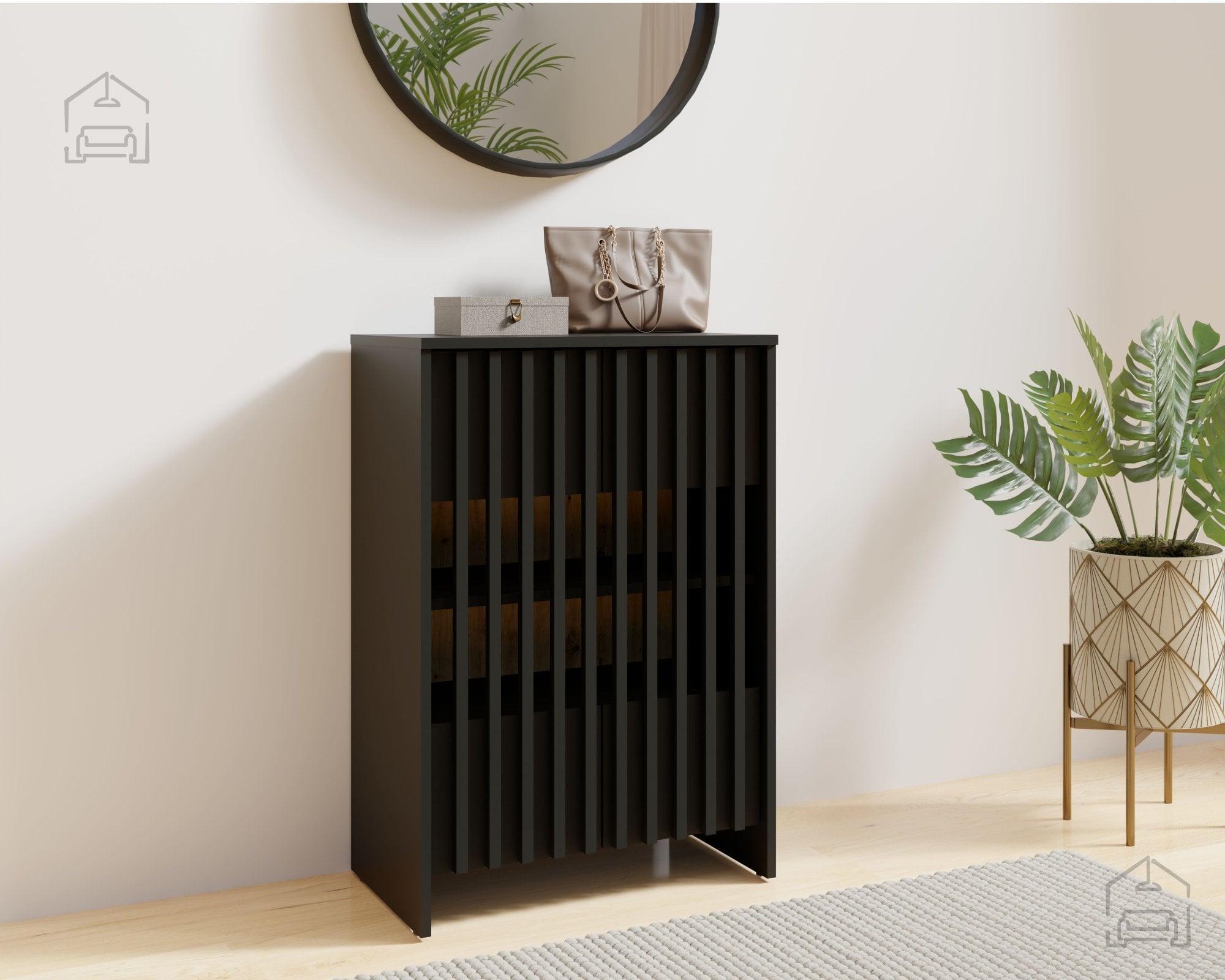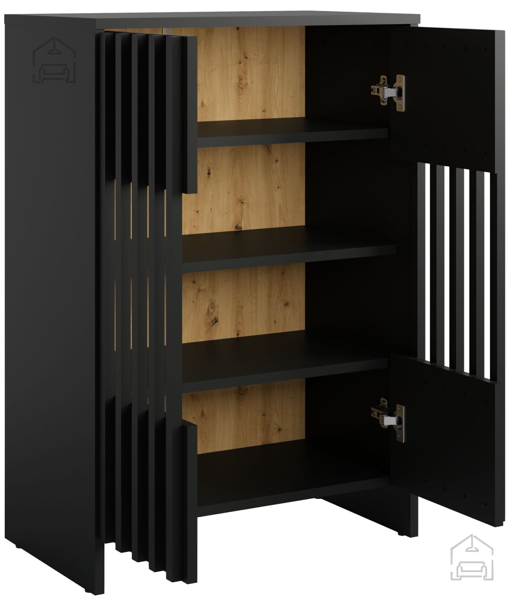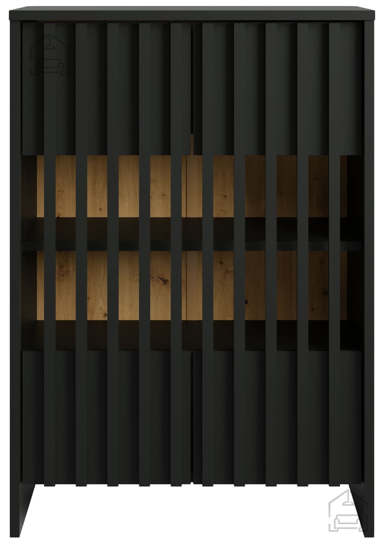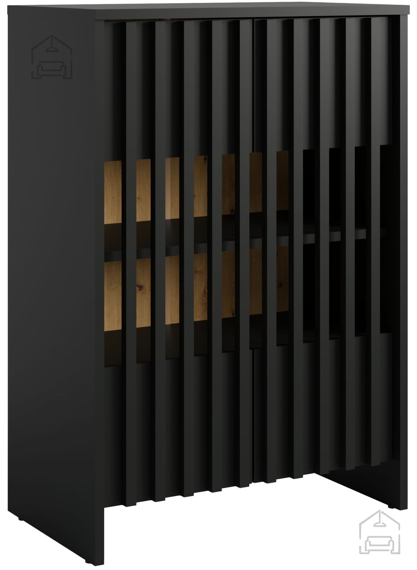 Komoda Venti 2D je funkcionalen in estetsko dovršen kos pohištva, ki prinaša toplino naravnega videza lesa v vsak dom. Z izdelavo iz kakovostne laminirane iverne plošče debeline 16 mm ter značilno črno barvoje ta komoda odlična izbira za vse, ki cenijo sodobno, a toplo notranjo opremo. S kompaktnimi dimenzijami 60x34x87 cm se odlično prilega tudi manjšim prostorom, hkrati pa nudi dovolj prostora za shranjevanje različnih predmetov v dnevni sobi, predsobi ali spalnici.