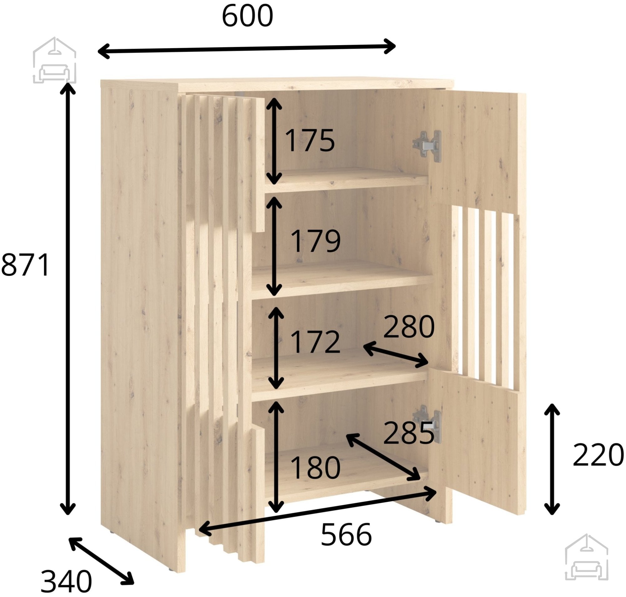 Njena praktičnost in estetska dovršenost omogočata raznoliko uporabo – kot shranjevalna omarica v predsobi, pomožni element v jedilnici ali dodatni prostor za tekstil v spalnici. Zaradi kompaktne globine 34 cm se lahko postavi tudi v ožje prostore, kjer ne ovira gibanja, a še vedno ponuja veliko uporabne prostornine.