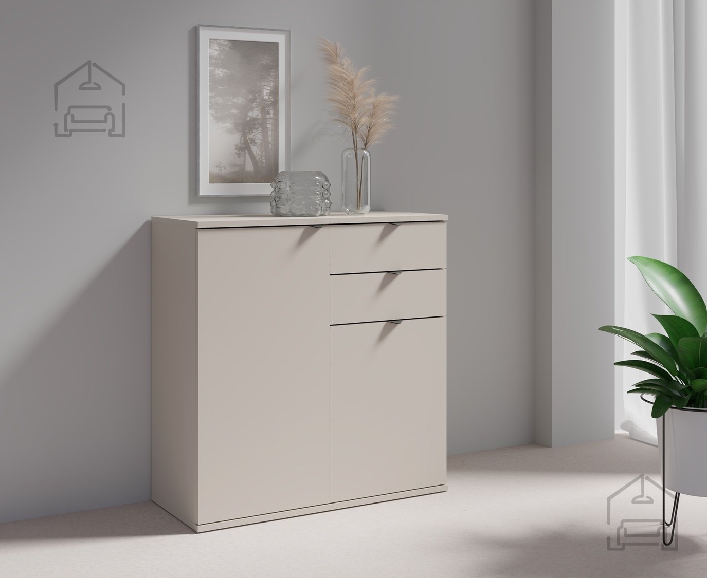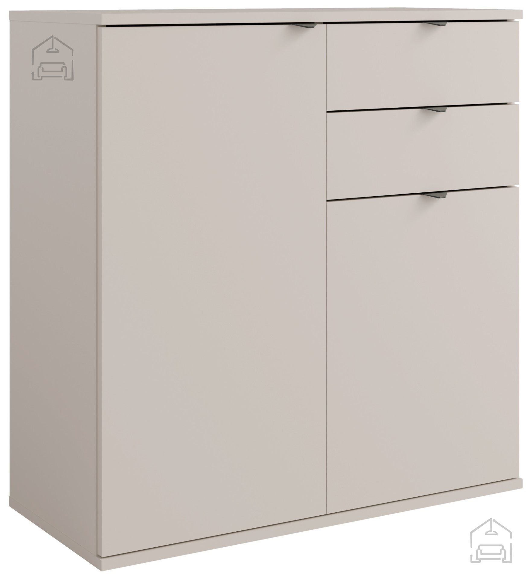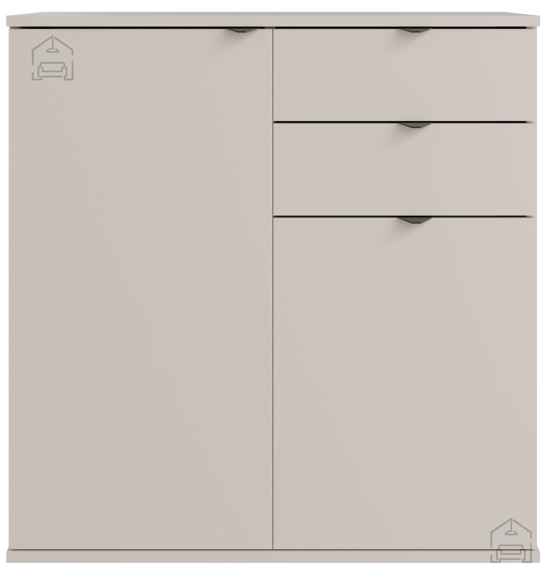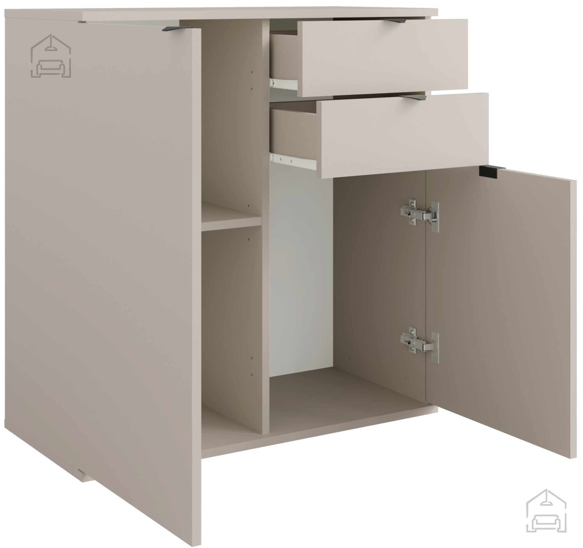 Korpus komode je izdelan iz laminirane iverne plošče debeline 16 mm, kar zagotavlja dobro stabilnost in dolgo življenjsko dobo izdelka. Laminirana površina je enostavna za čiščenje in odporna proti obrabi, zato komoda ohranja svoj svež videz še dolgo po nakupu. Barva izdelka je kašmir, kar omogoča enostavno kombiniranje z različnimi barvnimi shemami in stili notranje opreme – od minimalističnega do klasičnega.