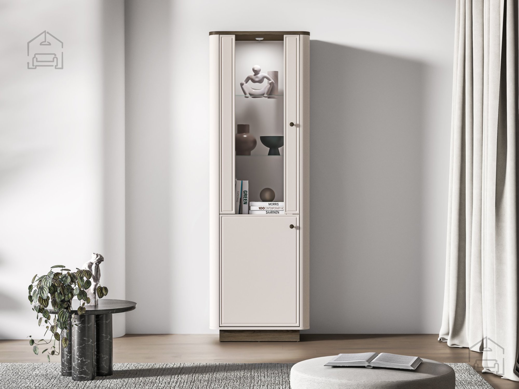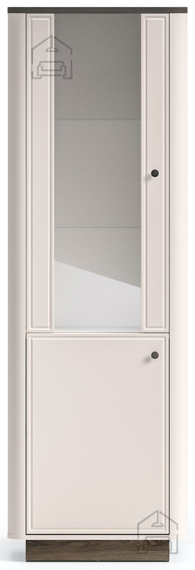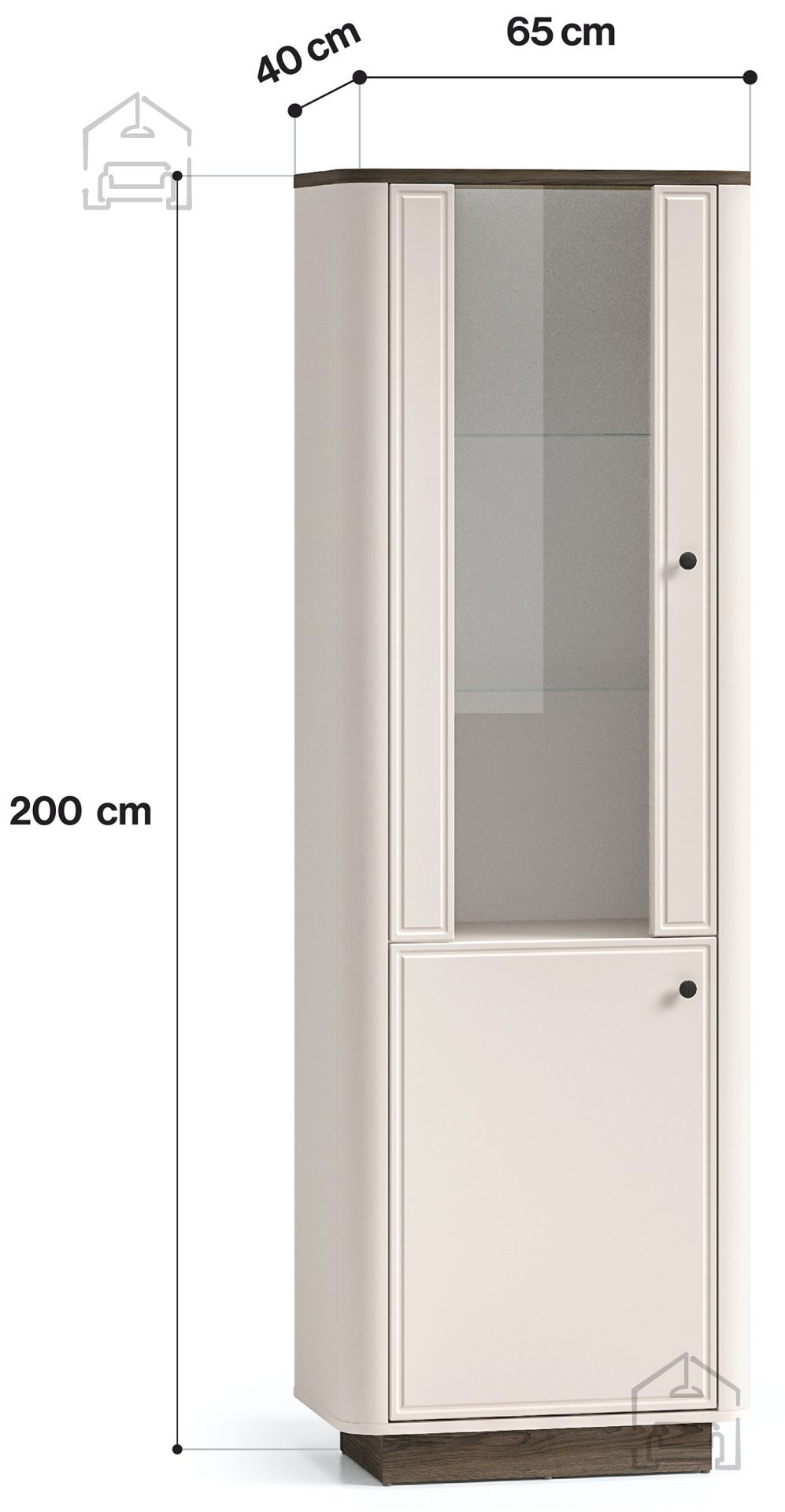Vitrina Vilavio 01 se odlikuje po prefinjenem kontrastu in harmonični obliki. Navdihuje s kombinacijo tradicionalnih elementov in sodobnega oblikovanja, kar jo naredi vsestransko uporabno v različnih slogih notranje opreme – od rustikalnih do minimalističnih. Njena navpična zasnova vizualno podaljša prostor in dodaja občutek višine, medtem ko steklena vrata omogočajo, da svetloba prodre v notranjost in poudari razstavljene predmete.