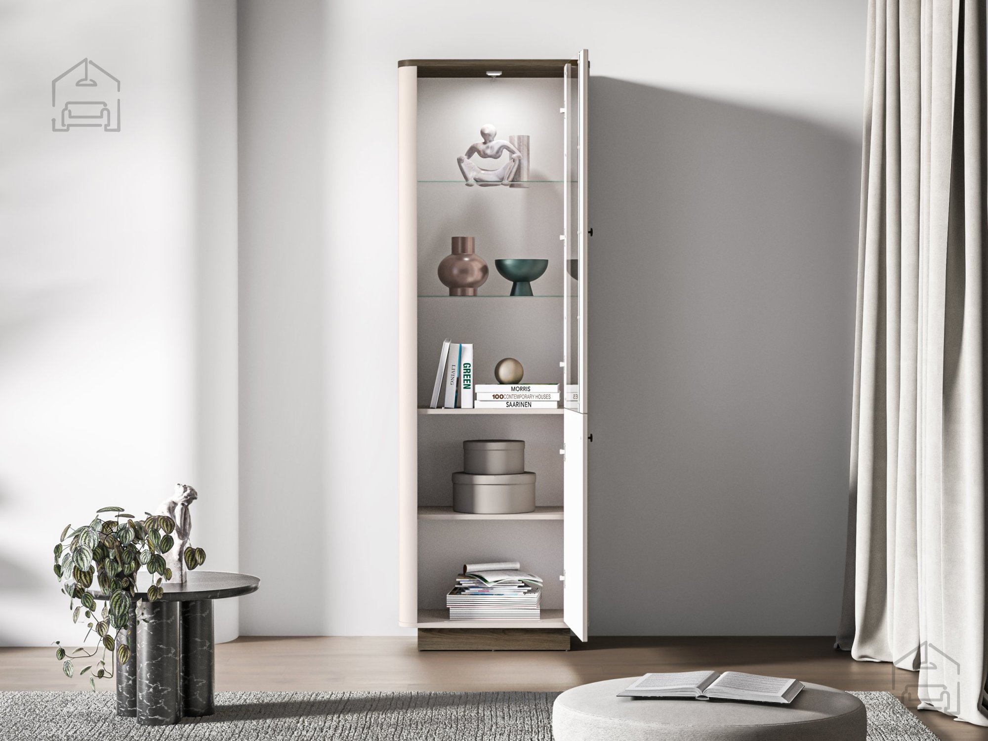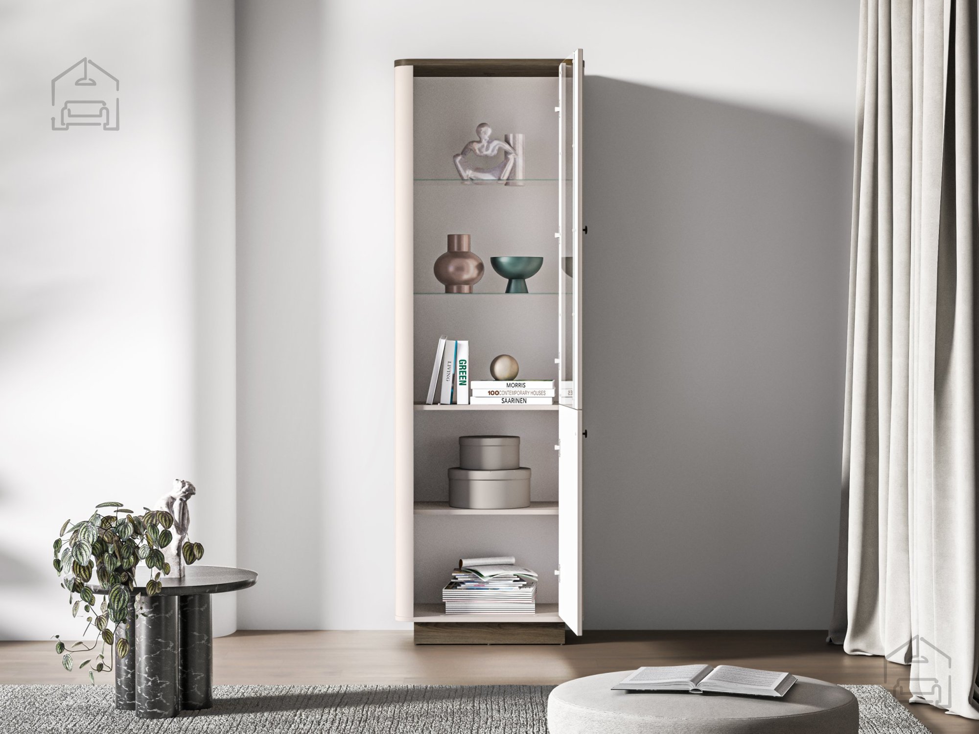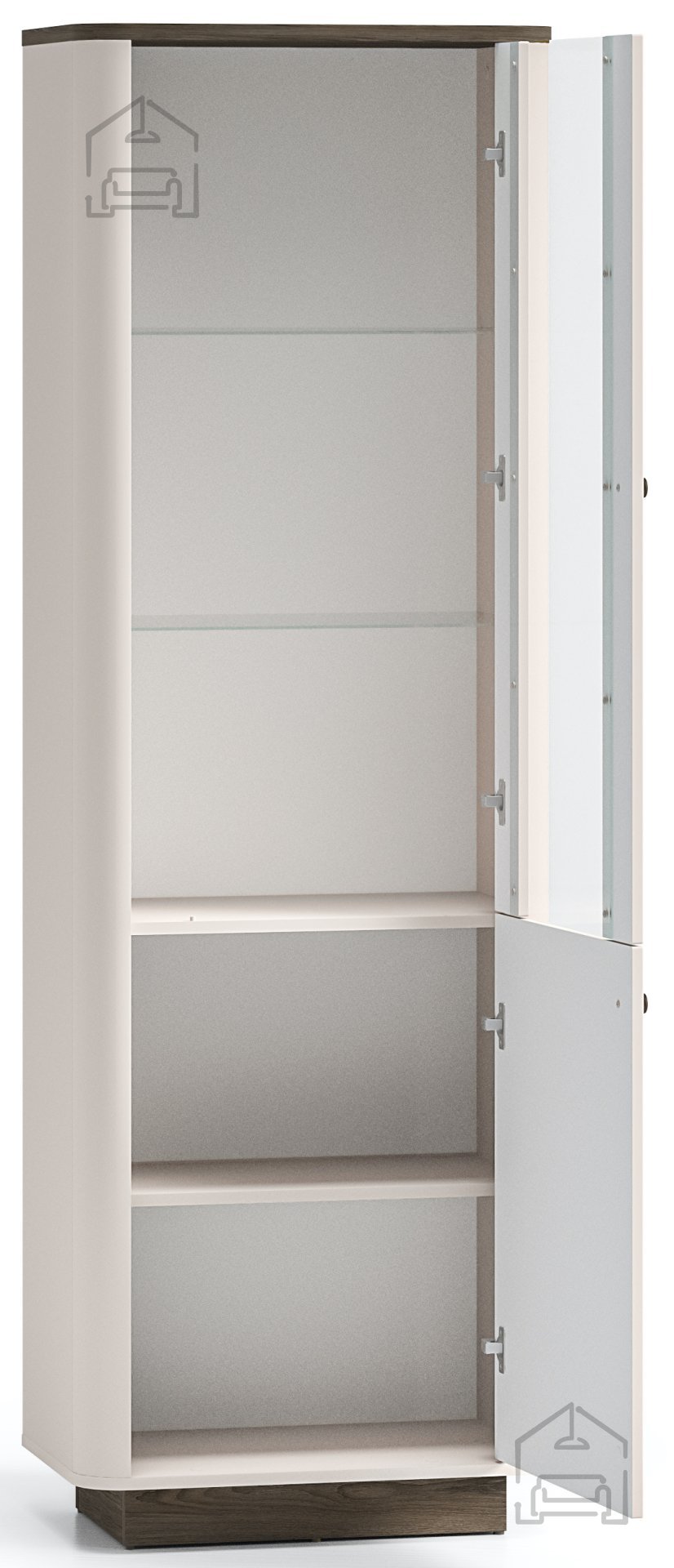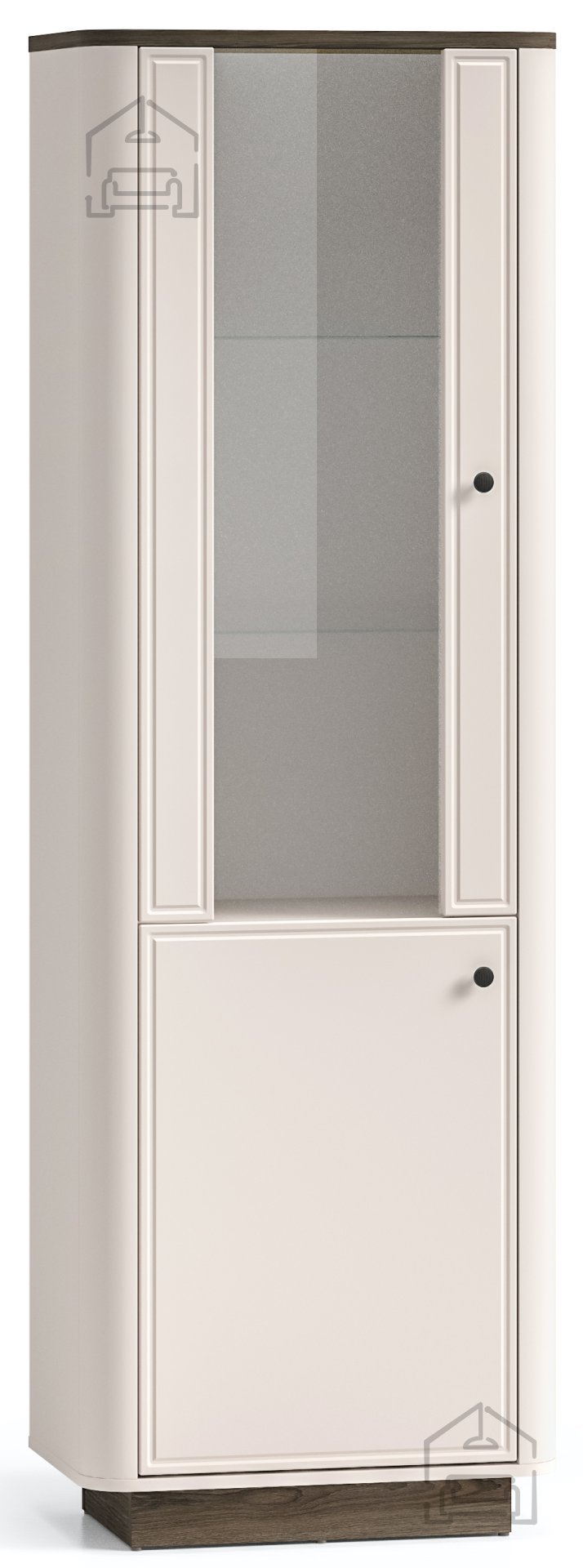 Vitrina Vilavio 01 se odlikuje po prefinjenem kontrastu in harmonični obliki. Navdihuje s kombinacijo tradicionalnih elementov in sodobnega oblikovanja, kar jo naredi vsestransko uporabno v različnih slogih notranje opreme – od rustikalnih do minimalističnih. Njena navpična zasnova vizualno podaljša prostor in dodaja občutek višine, medtem ko steklena vrata omogočajo, da svetloba prodre v notranjost in poudari razstavljene predmete.