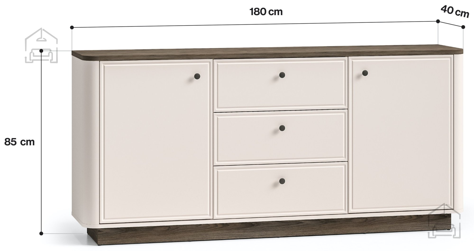 Celotna velikost komode znaša 180 × 40 × 85 cm. Takšne mere omogočajo prostorno shranjevanje brez občutka masivnosti v prostoru. Širina 180 cm nudi dovolj prostora za dekorativne predmete, knjige ali družinske fotografije, medtem ko globina 40 cm omogoča enostavno postavitev tudi v ožje prostore. Višina 85 cm je idealna za ergonomsko uporabo in vizualno ravnovesje z drugimi pohištvenimi elementi.