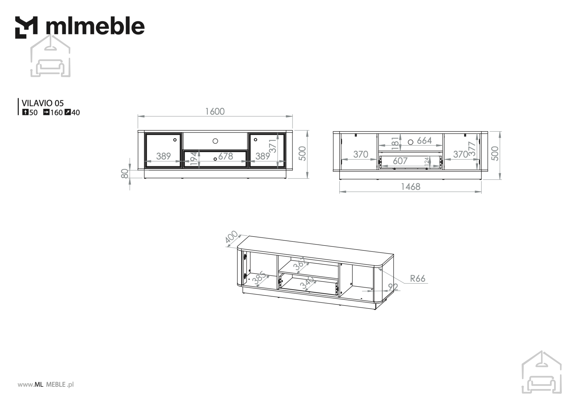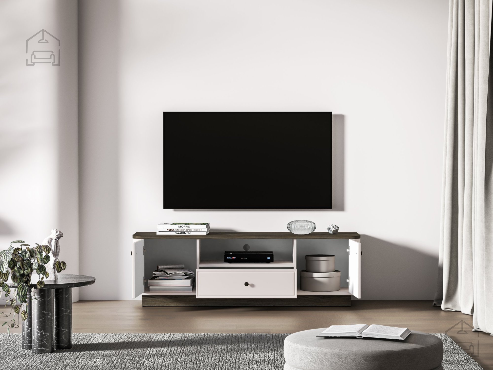 Komoda Vilavio 05 je zasnovana tako, da ustreza različnim potrebam sodobnega doma. Na zgornjo površino lahko postavite televizor, medtem ko notranji predel ponuja prostor za multimedijske naprave, knjige ali dodatke. Kombinacija zaprtih omaric in odprtih polic omogoča urejeno shranjevanje, hkrati pa ohranja vizualno lahkotnost. Zahvaljujoč premišljenim dimenzijam 160 × 40 × 50 cm se komoda zlahka prilega tudi manjšim prostorom, ne da bi pri tem izgubila funkcionalnost.
