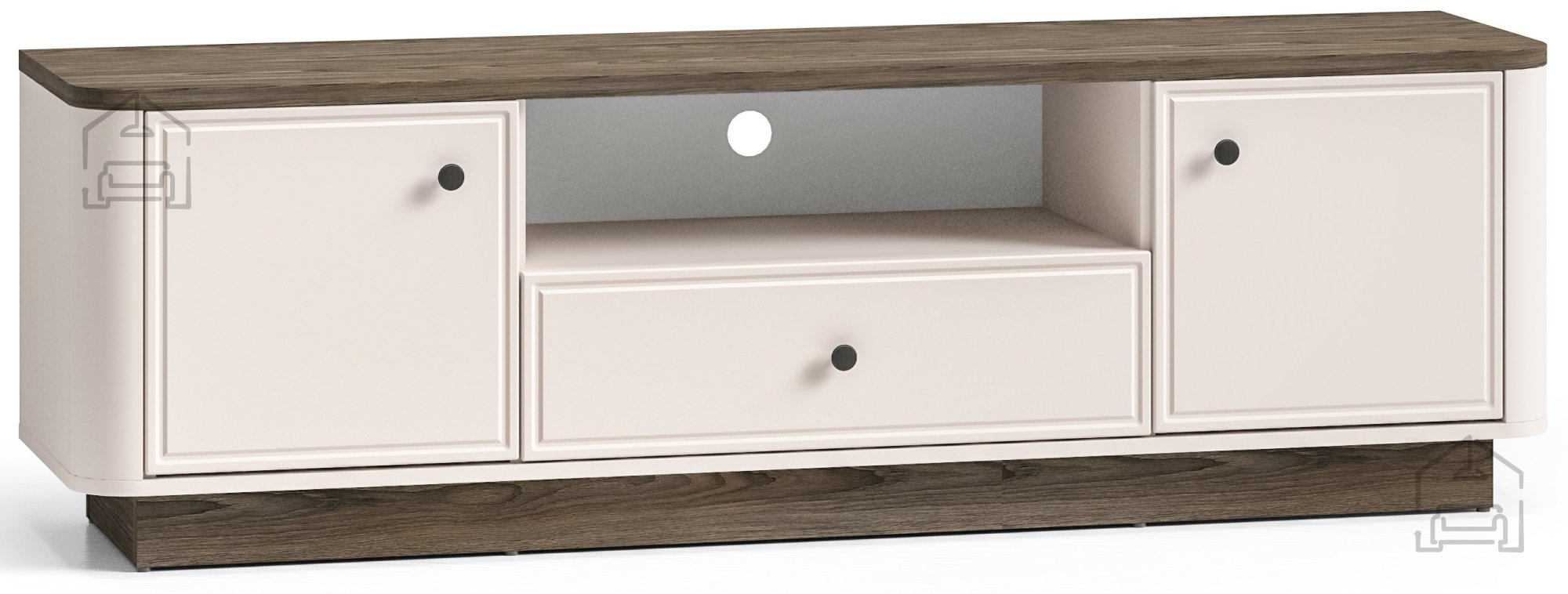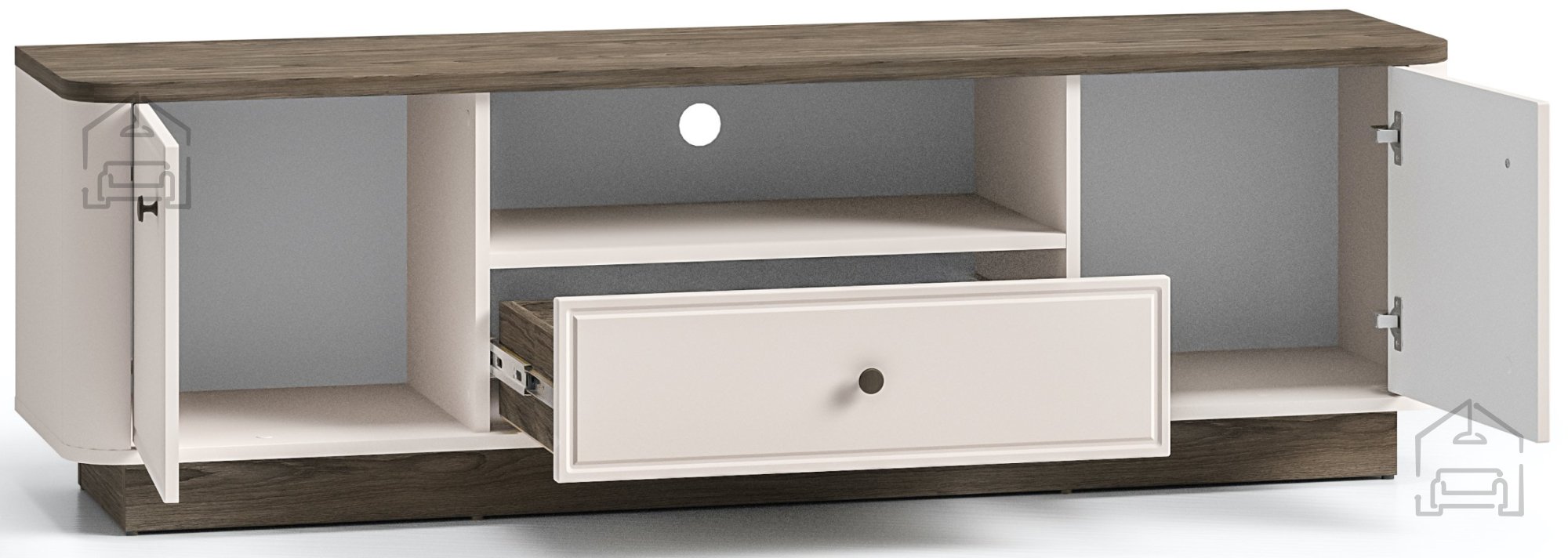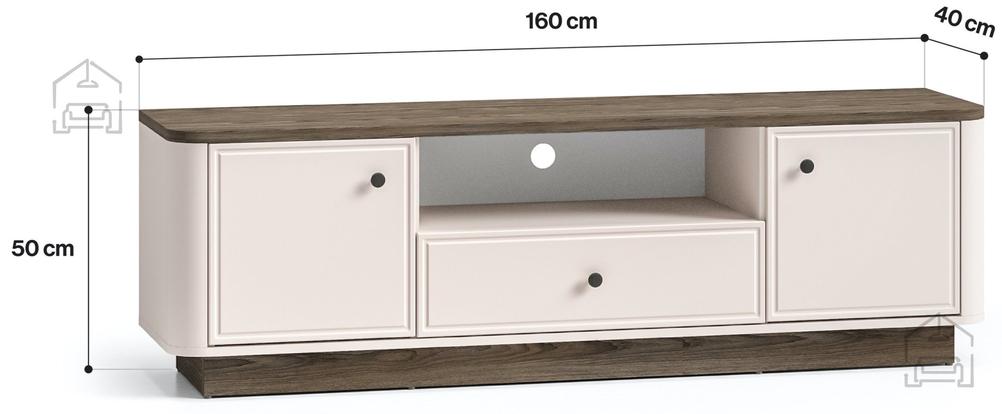 TV komoda Vilavio 05 – ML Meble je popolna izbira za tiste, ki cenijo kombinacijo estetike, uporabnosti in kakovosti. Njen prefinjen kontrast barv, kovinski detajli v brušenem bakru ter zaobljeni robovi ustvarjajo vtis dovršene elegance. Z dimenzijami 160 × 40 × 50 cm in premišljeno notranjo razporeditvijo ponuja ravno prav prostora za vse, kar potrebujete v dnevni sobi ali spalnici. Poljska izdelava in kakovostni materiali zagotavljajo, da bo ta komoda še dolgo ostala funkcionalen in estetsko privlačen del vašega doma.