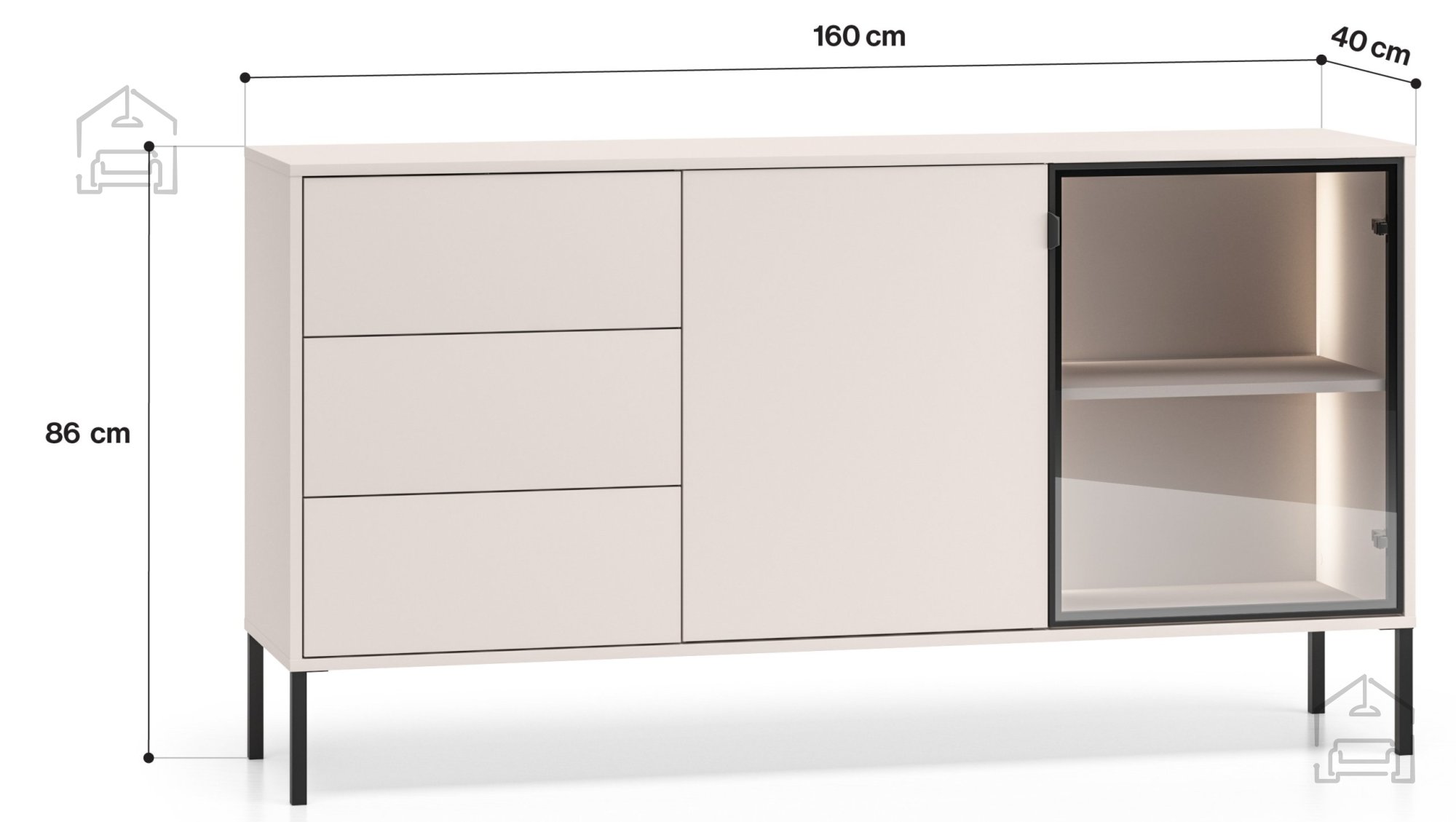 Komoda meri 160 cm v širino, 40 cm v globino in 86 cm v višino. V notranjosti ponuja premišljeno razporeditev shranjevalnega prostora, primernega za dokumente, tekstil, posodo ali dekorativne dodatke. Predali so opremljeni s krogličnimi vodili, ki omogočajo popoln izvlek in tiho delovanje. Takšna rešitev zagotavlja hiter in udoben dostop do vsebine, obenem pa prispeva k dolgotrajni zanesljivosti mehanizma.
