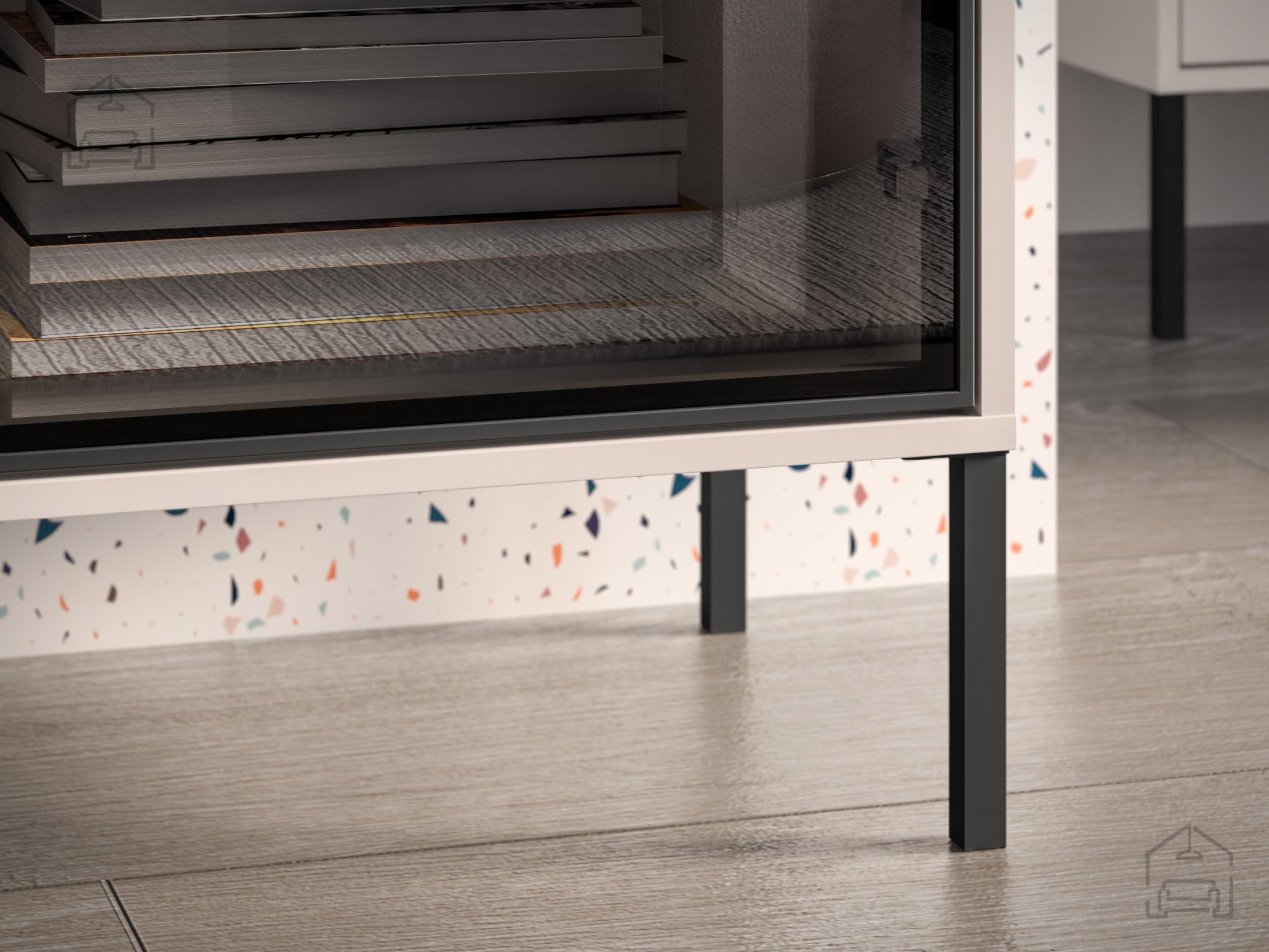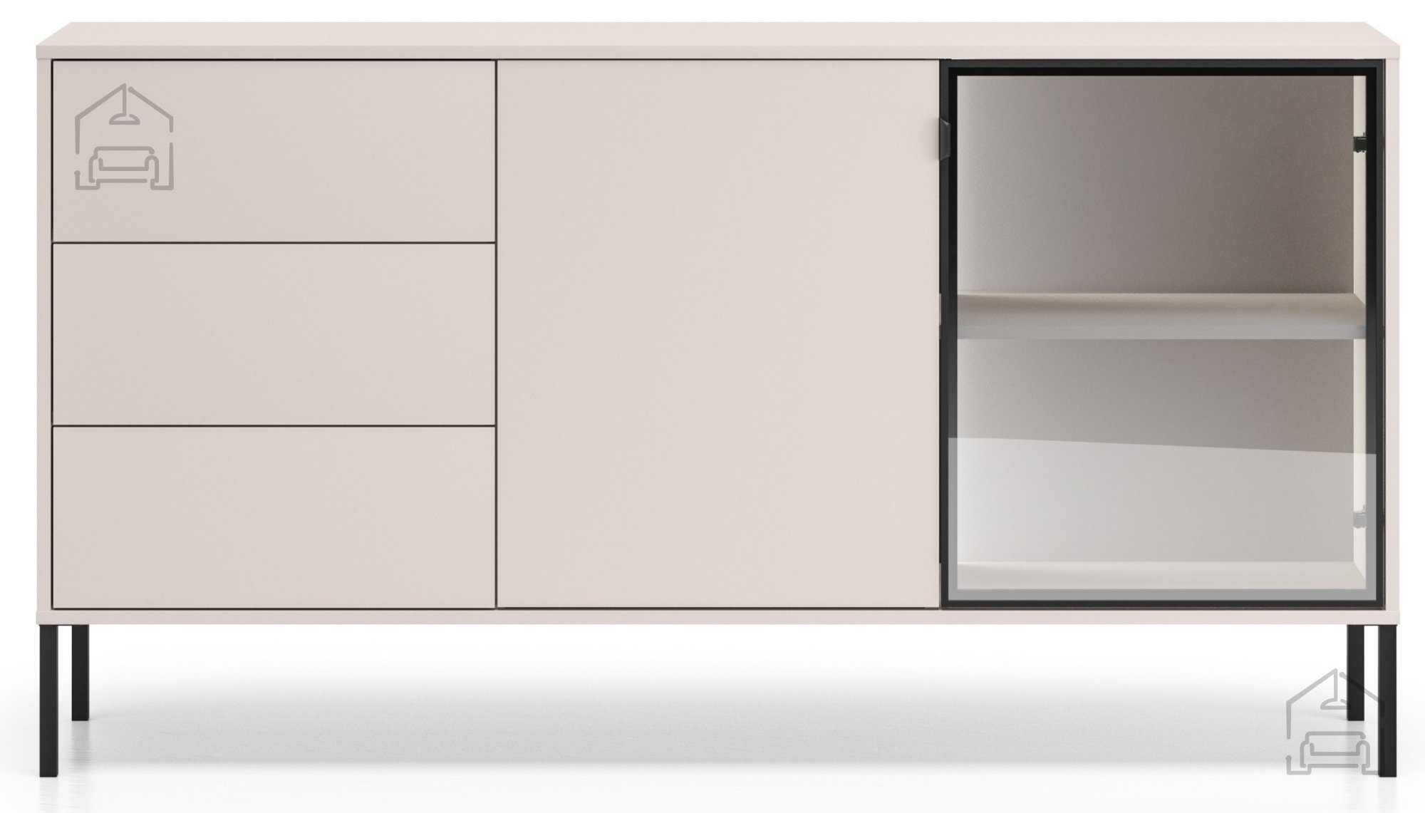 Komoda je izdelana iz kombinacije MDF plošč in iverala, kar zagotavlja trdnost, stabilnost ter dolgo življenjsko dobo. Površine so obdelane tako, da so odporne proti praskam in enostavne za čiščenje. Kovinski okvir prispeva k robustnosti konstrukcije, medtem ko kaljeno grafitno steklo doda pridih modernosti in vizualne lahkotnosti. Kovinski elementi so prašno barvani v črno barvo, kar se lepo ujema z nevtralnim tonom kašmirja.