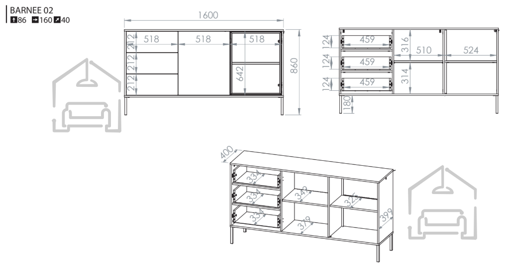 Komoda Barnee 02 je primerna za raznolike bivalne prostore. V dnevni sobi lahko služi kot nizka omarica za dekoracije ali multimedijske naprave, v jedilnici kot shranjevalna površina za krožnike in pogrinjke, v predsobi pa kot prostor za dodatke in dokumente. Zahvaljujoč stabilnim nogam in kakovostnim materialom ohranja svojo obliko in stabilnost tudi po večletni uporabi.