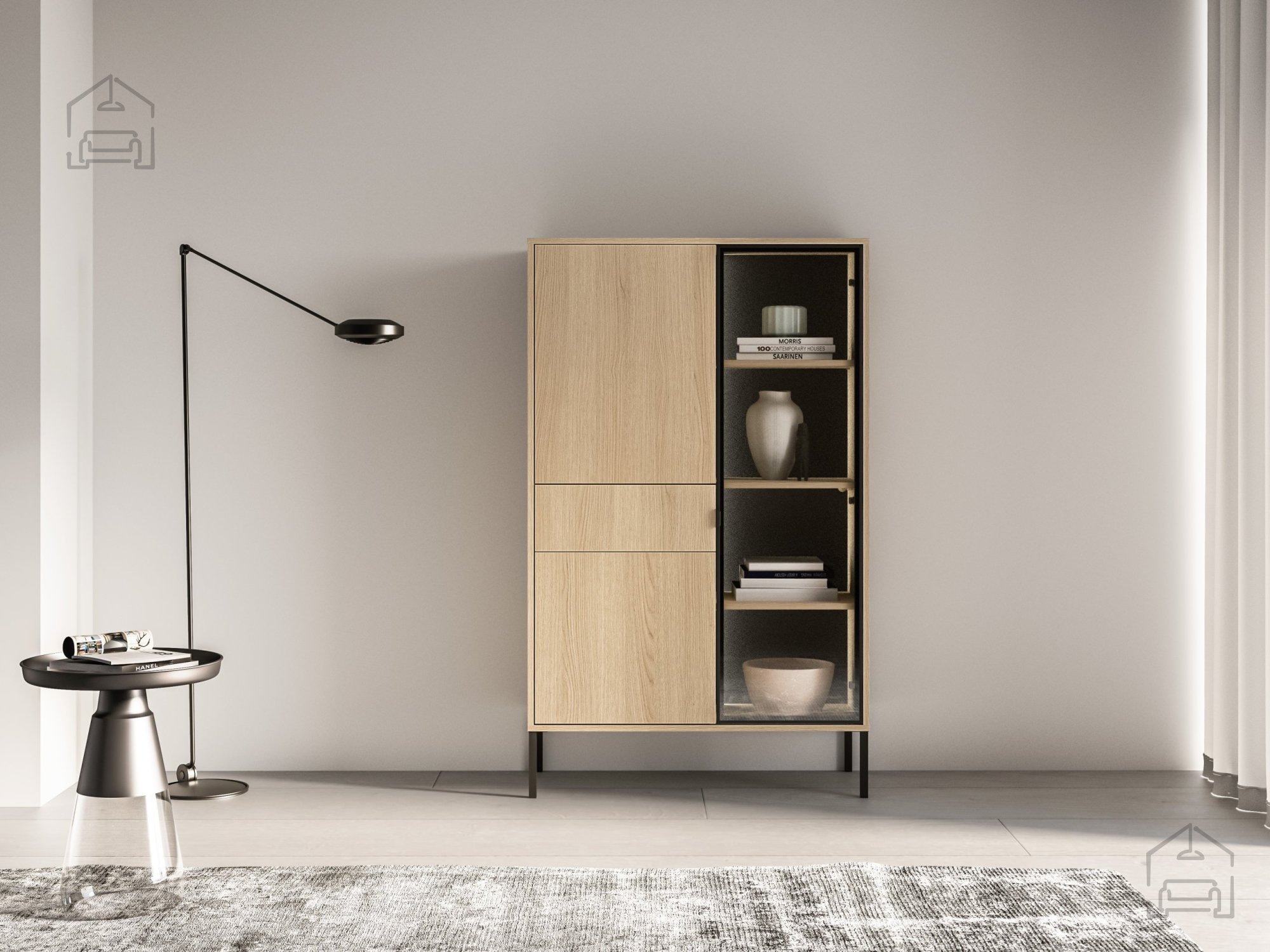 Osnova elementov Barnee je MDF v kombinaciji z iveralom, površinsko obdelanem tako, da natančno posnema strukturo lesa hrasta lindberg. Lesni dekor deluje naravno in prijetno toplo, hkrati pa je odporen proti praskam in enostaven za čiščenje. Konstrukcijo dopolnjuje kovinski okvir, ki ojača stabilnost in vizualno doda industrijski pridih. Kaljeno grafitno steklo na posameznih vratih ali policah optično razbremeni kompozicijo in poskrbi za eleganten kontrast s svetlejšim lesnim tonom.