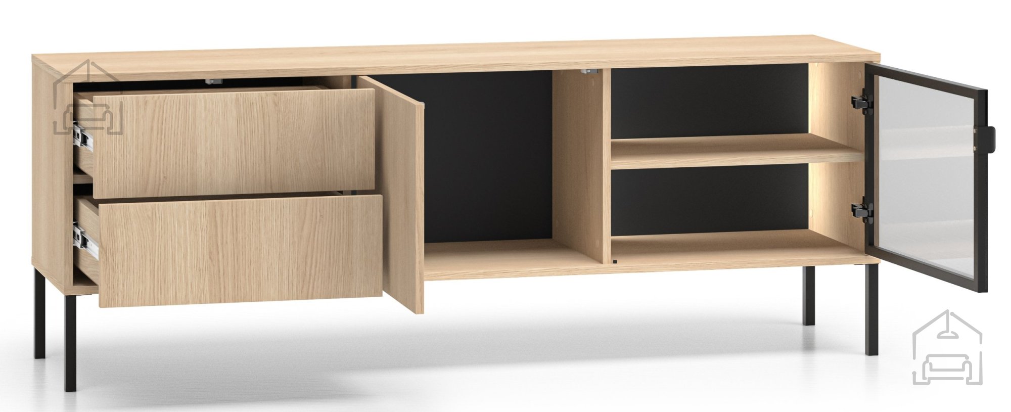 Visoke kovinske noge niso le estetski dodatek, temveč tudi praktična rešitev – omogočajo enostavno čiščenje tal pod komodo in prispevajo k lahkotnejšemu videzu celotne konstrukcije. Zaradi uravnoteženih proporcev (160 cm širine, 40 cm globine in 59 cm višine) se komoda lepo prilega tako obstoječim pohištvenim elementom kot tudi samostojni postavitvi ob steno ali pod televizor.