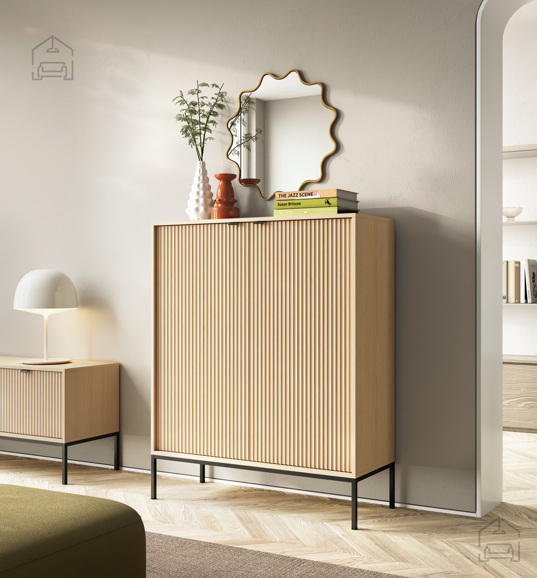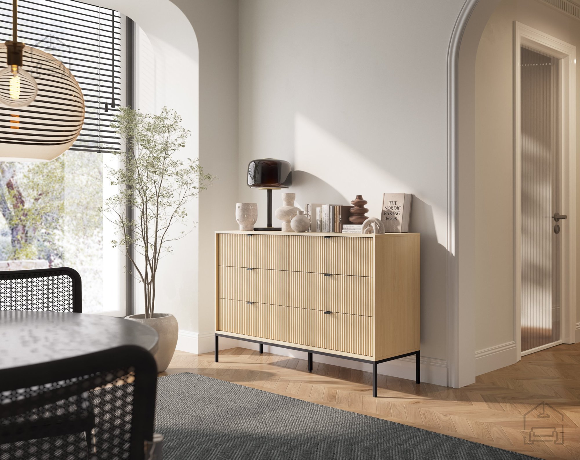 • Komoda – 104 × 83 × 39 cm, idealna za shranjevanje dokumentov, posode ali tekstila.
