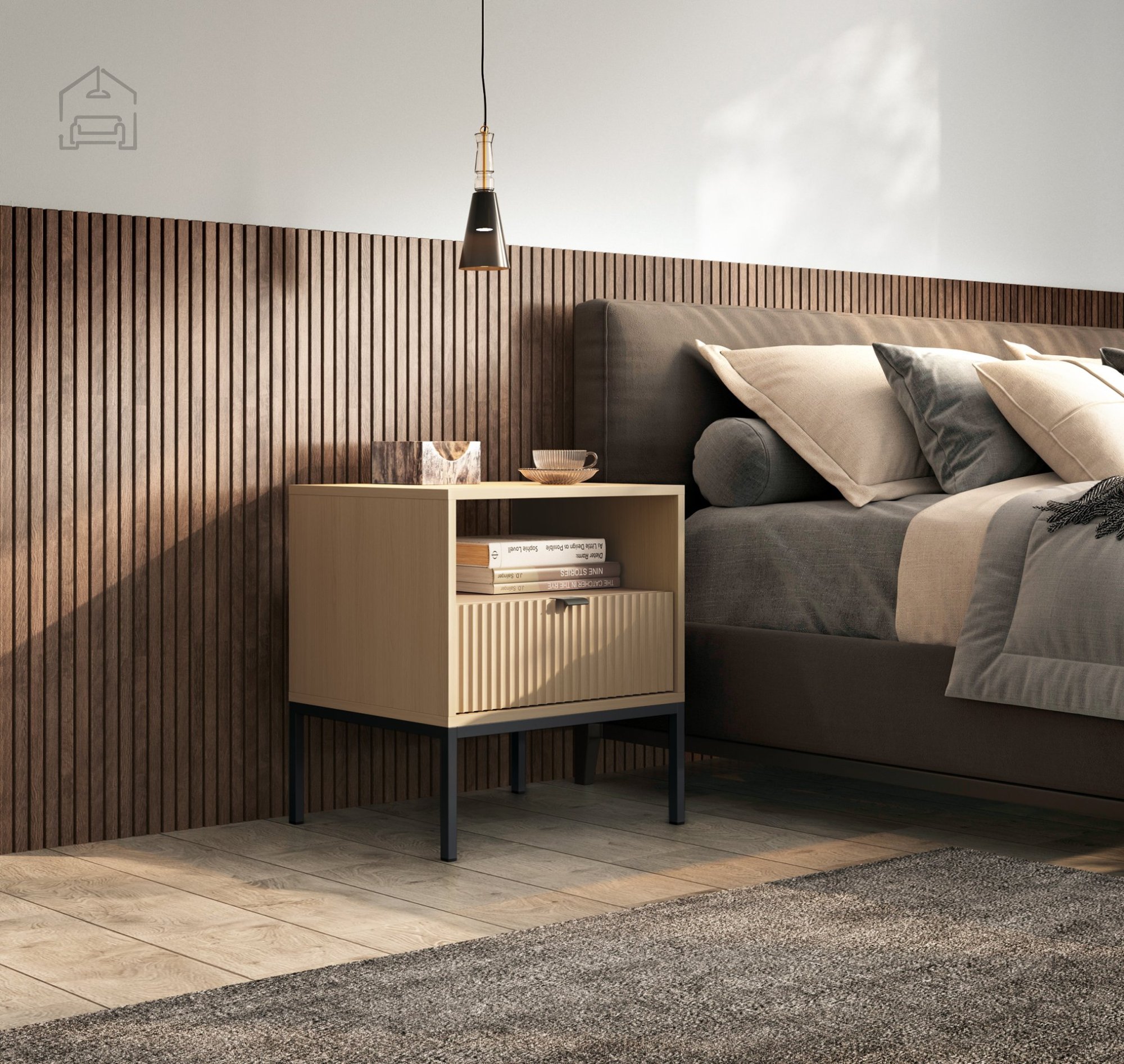 • Nočna omarica – 54 × 56 × 39 cm, uporabna tudi kot manjša odlagalna mizica ob sedežni garnituri.