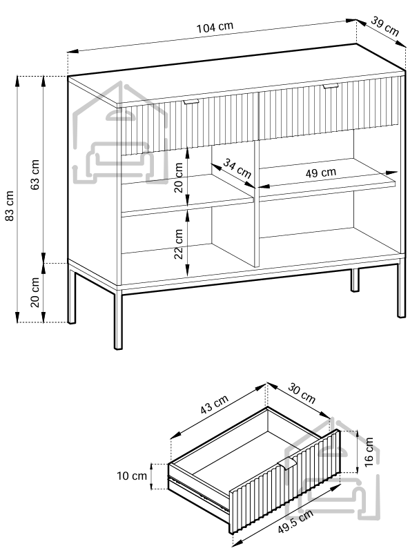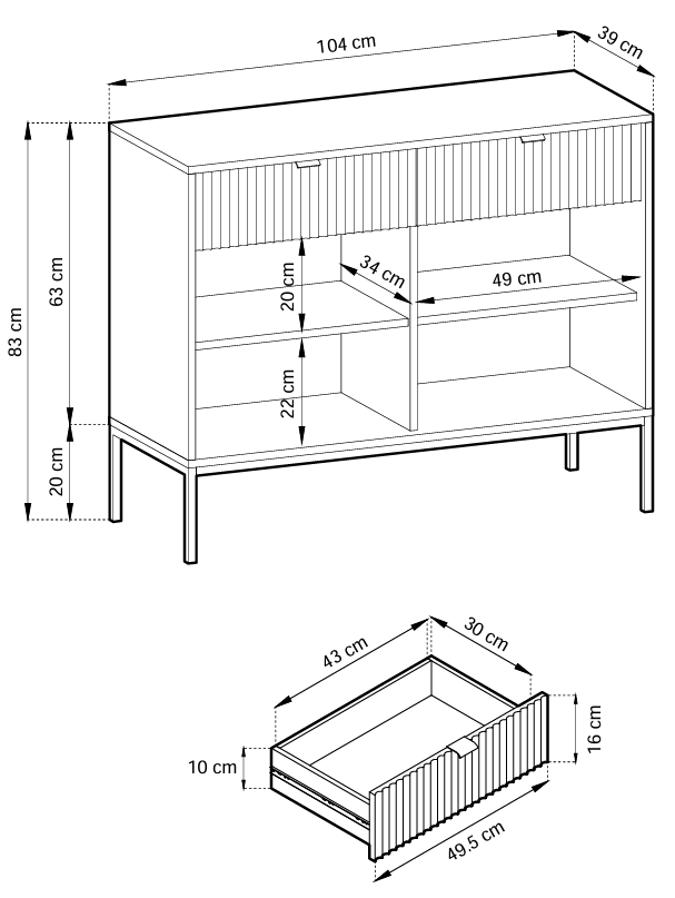 Dimenzije komode znašajo 104 × 39 × 83 cm, kar omogoča optimalno razmerje med prostornostjo in kompaktnostjo. Zahvaljujoč premišljeni višini in širini se komoda zlahka prilega obstoječemu pohištvu v dnevni sobi, spalnici ali predsobi. Plošča na vrhu ponuja dovolj prostora za dekorativne elemente, kot so okvirji, vaze ali svetila, medtem ko notranji del nudi praktičen prostor za shranjevanje oblačil, dokumentov ali gospodinjskih drobnarij.