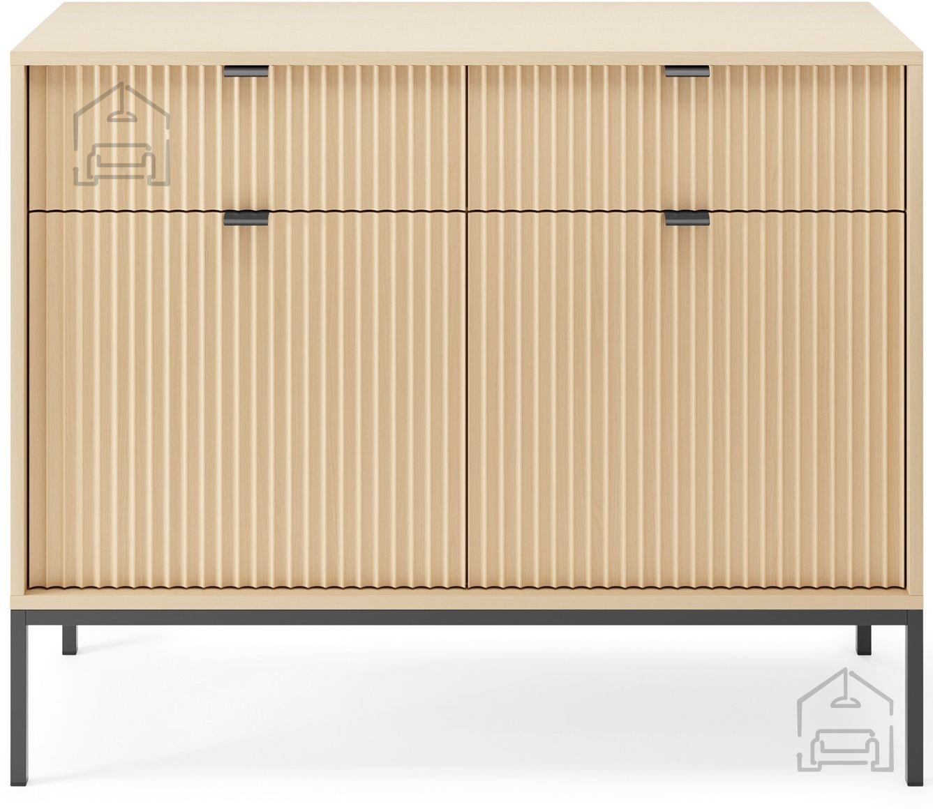 Posebnost te komode so kovinski ročaji in noge, ki prinašajo subtilen industrijski pridih. Črni ročaji elegantno kontrastirajo s svetlejšim odtenkom hrasta, hkrati pa zagotavljajo udoben oprijem pri odpiranju vrat ali predalov. Kovinske noge so na voljo v črni ali zlati barvi – odvisno od izbrane različice – kar omogoča, da komodo prilagodite svojemu stilu prostora. Stabilna kovinska podlaga dodatno prispeva k trdnosti konstrukcije in olajša čiščenje tal pod pohištvom.